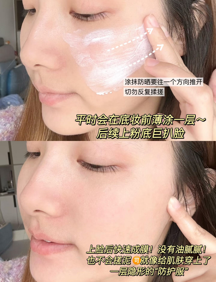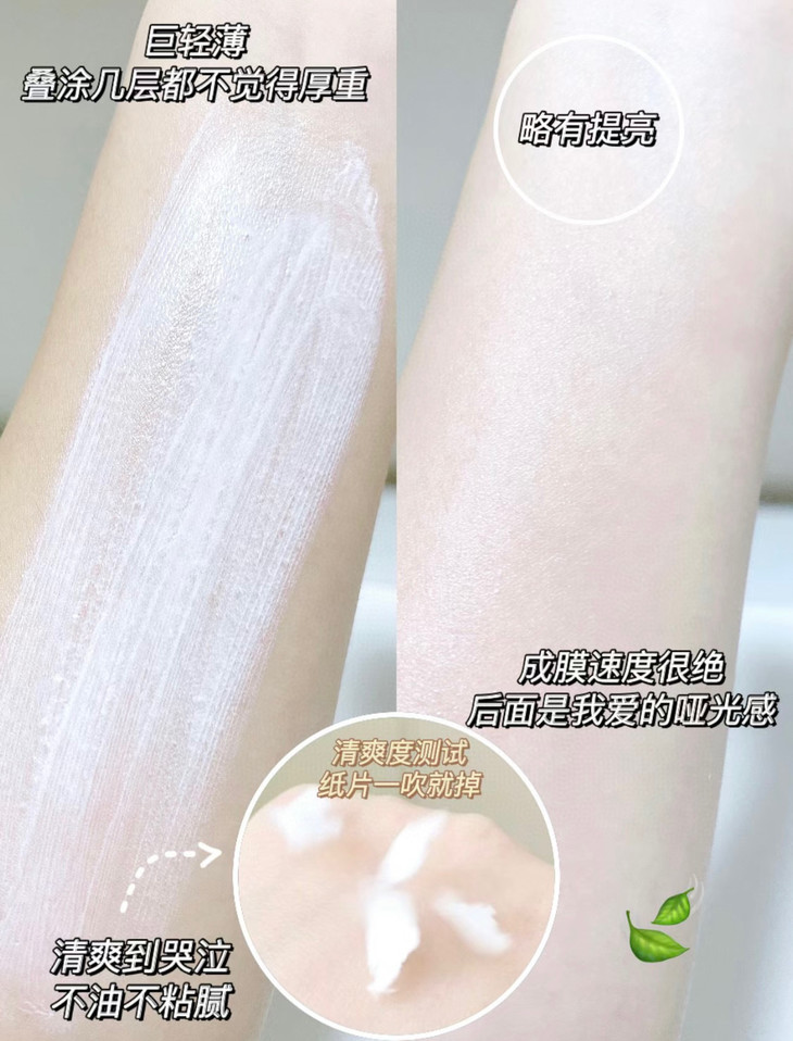 减少面部负重感, 才能在户外活动时坚持 2 小时一涂哇~🏃 持久舒爽的防晒体验,靠它安排了! 油皮星人都说好👍 成膜后脸上丝毫没有黏糊、油腻的厚重感‼️ 肤感清凉,有一股淡淡的清香,很圈粉❤️