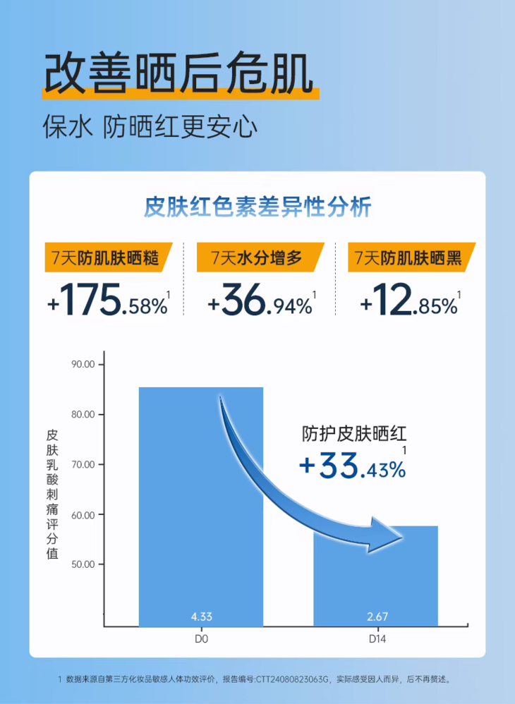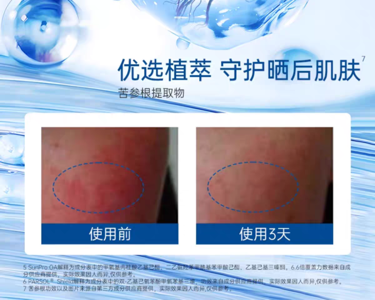 扒一下成分也确认实打实的防晒届卷王! ➡️物化结合双重防晒体系把紫外线统统挡在外面 同时给肌肤撑起一个保护屏障 不给紫外线任何偷袭肌肤的机会! 有效抵御UVB和UVA!! SPF50,PA+++,出门一整天都不用补防晒! ➡️添加精华级养肤成分苦参根提取物 全波段防御紫外线,去海边浮潜都不带黑的! 上次跟朋友去爬山忘了涂防晒,整张脸红扑扑的 后面补涂防晒后,居然意外地没那么红了! 就它不仅能防晒红还能改善泛红!