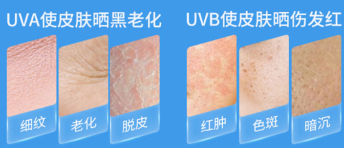 外出在外,爱美的你一定要做好防晒! 防晒十分的重要!!! UVA被称为衰老之光可直达真皮层 晒黑皮肤,并导致脂质和胶原蛋白受损 是皮肤光老化的元凶UVB,灼伤之光💥 晒伤、晒黑皮肤会引起脱皮、红斑等现象⚠️