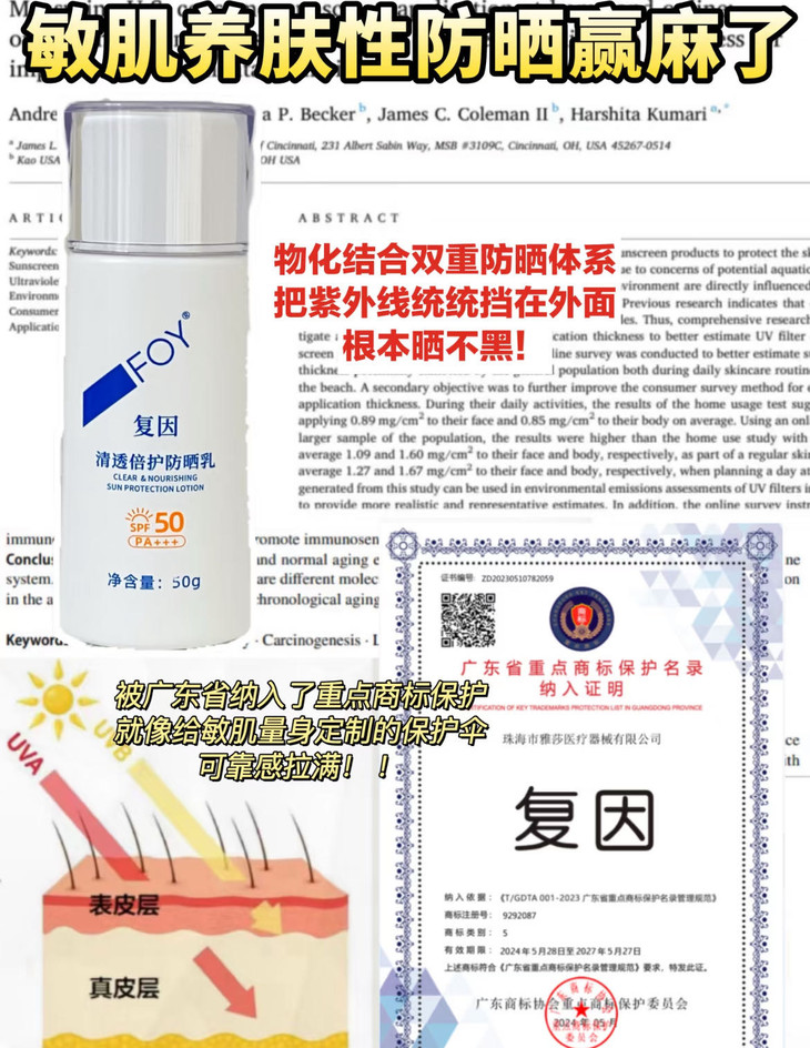 直到遇到了这个🔴复因防晒乳 我才感觉找到了“真命天子” 不愧被广东省纳入了重点商标保护 一边防晒一边修敏红 就像给敏感肌量身定制的保护伞,可靠感拉满!