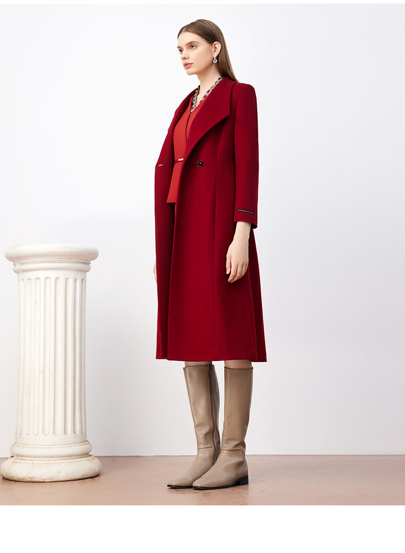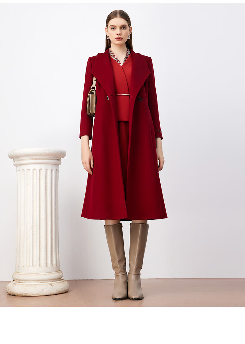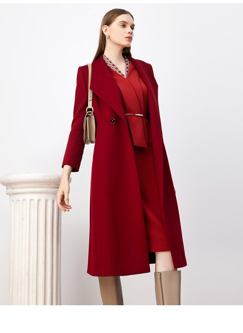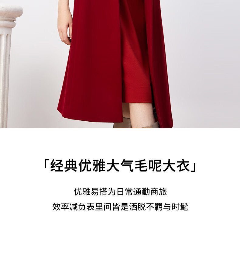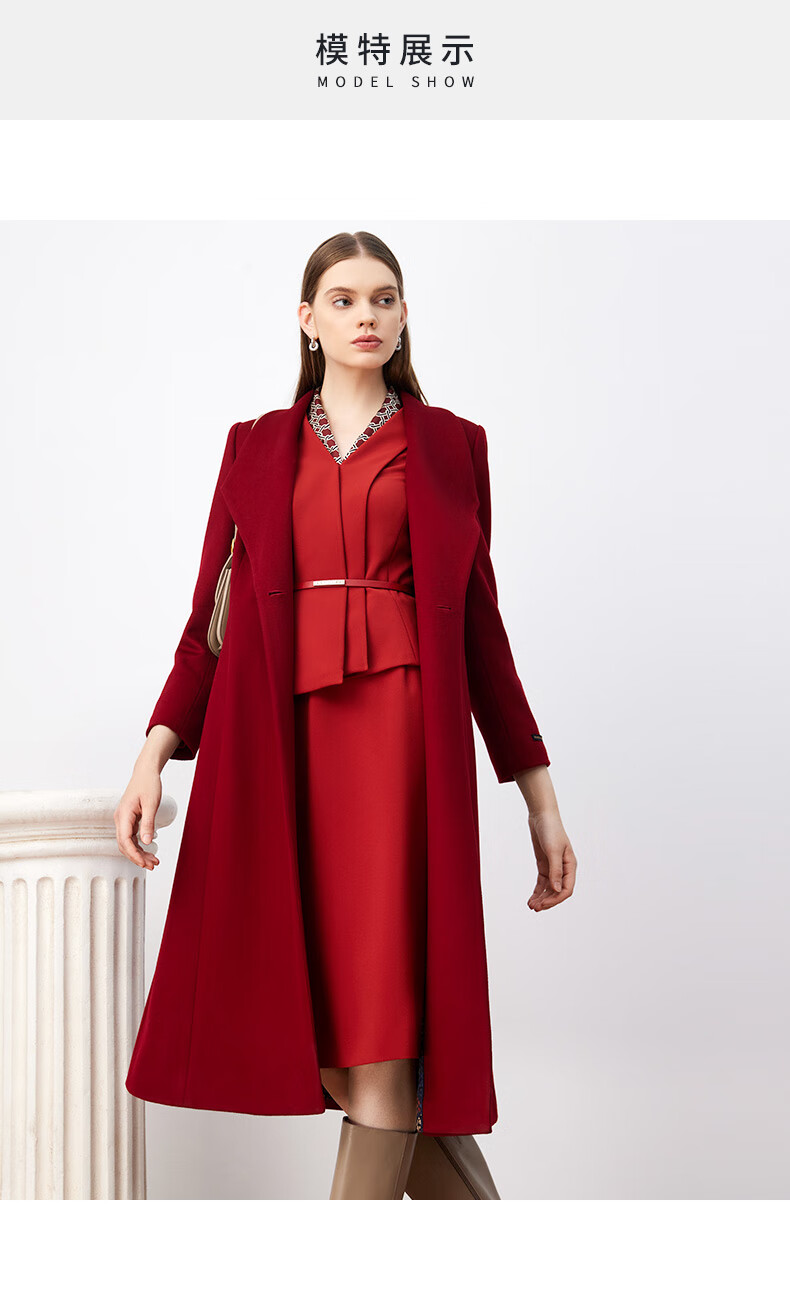 皮尔卡丹女装毛呢外套红色喜庆羊毛大衣女高级感大衣P3408C3983R0
