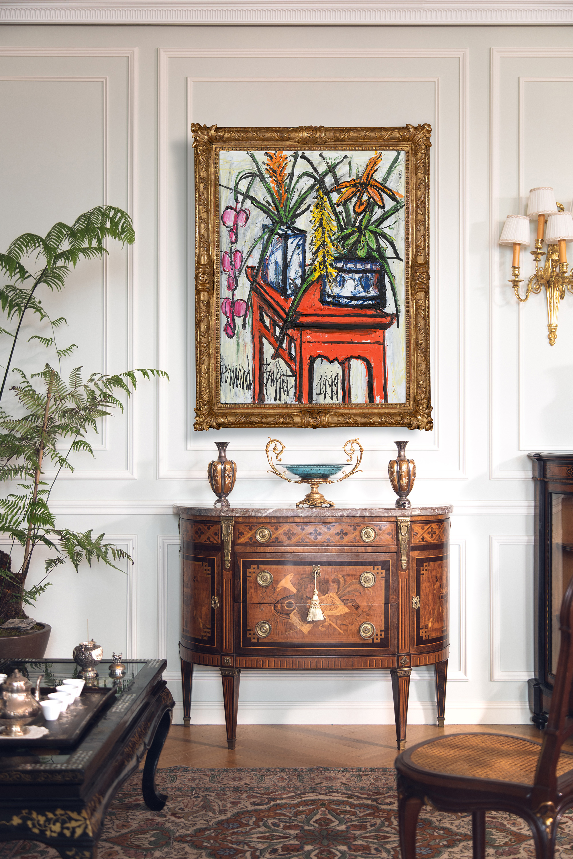 独角鹿西洋古董1999年法国具象派大师Bernard Buffet签名创作布面油画《中式桌上的花卉》