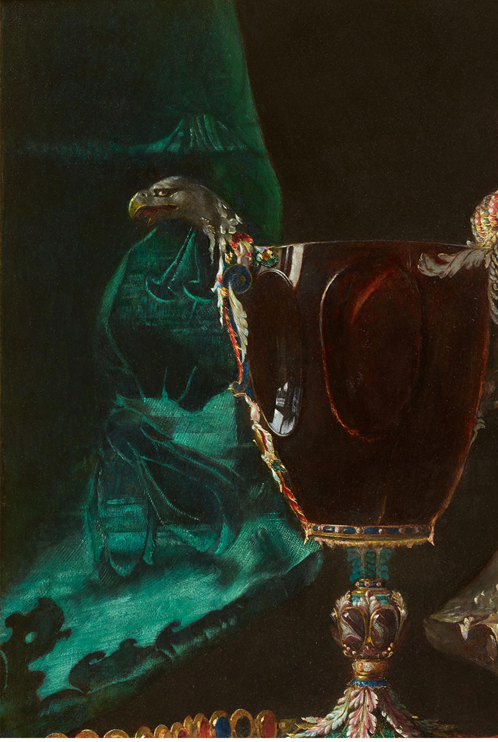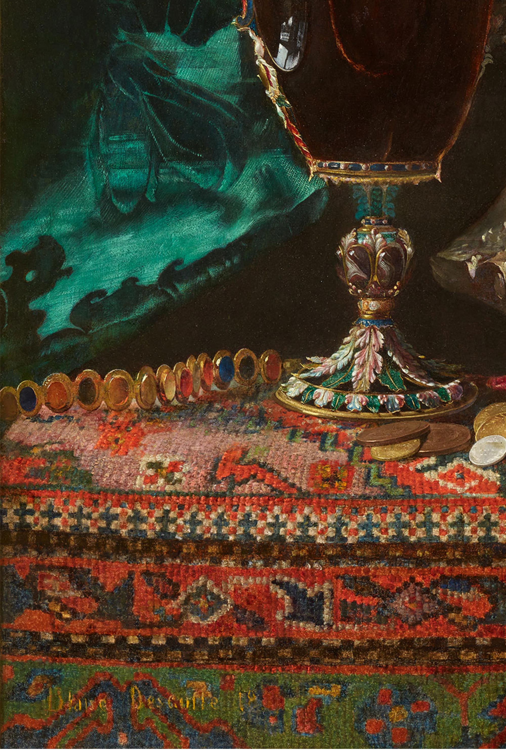 1857年代法国画家Blaise Desgoffe签名创作静物油画作品《土耳其地毯上的玛瑙珐琅杯》