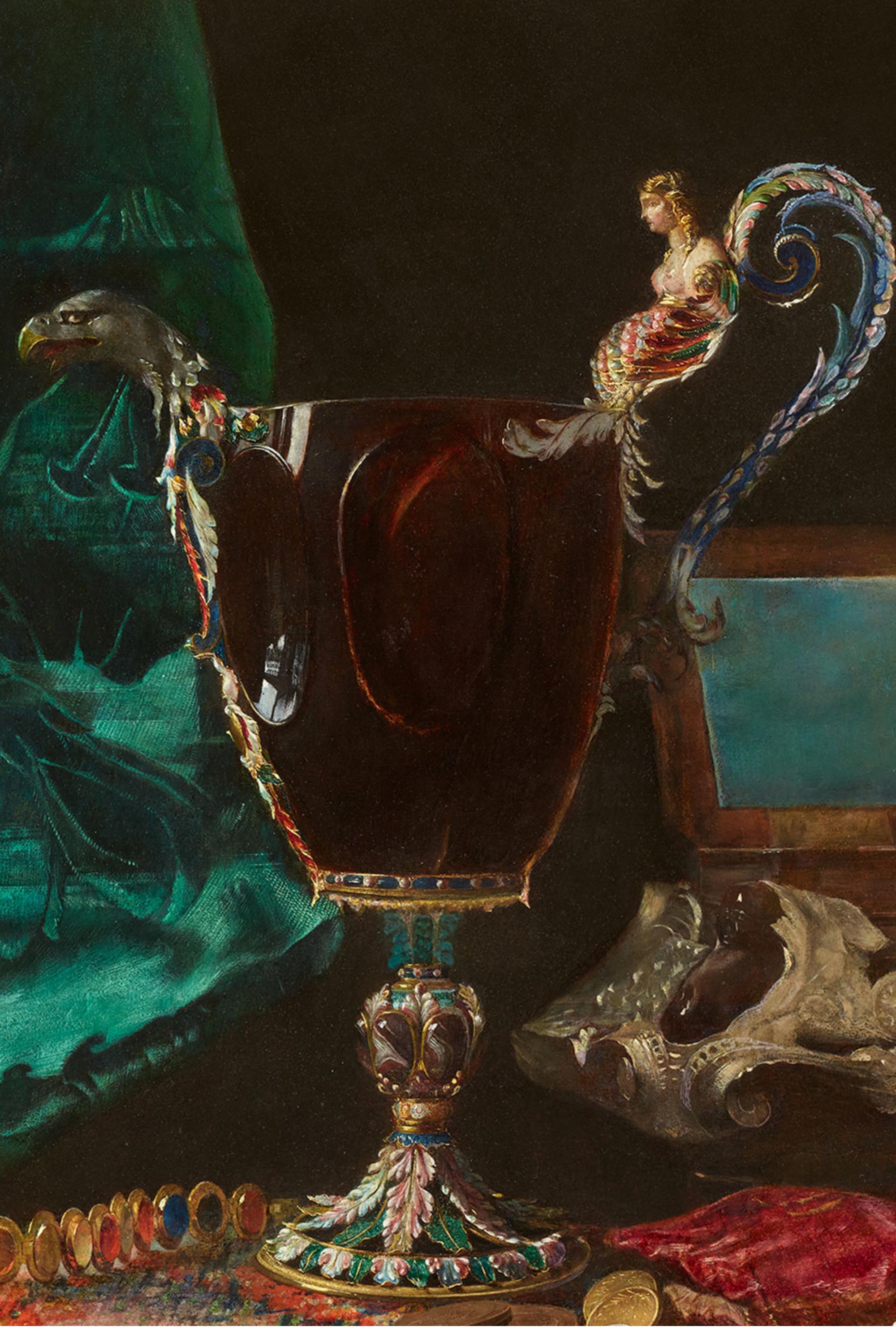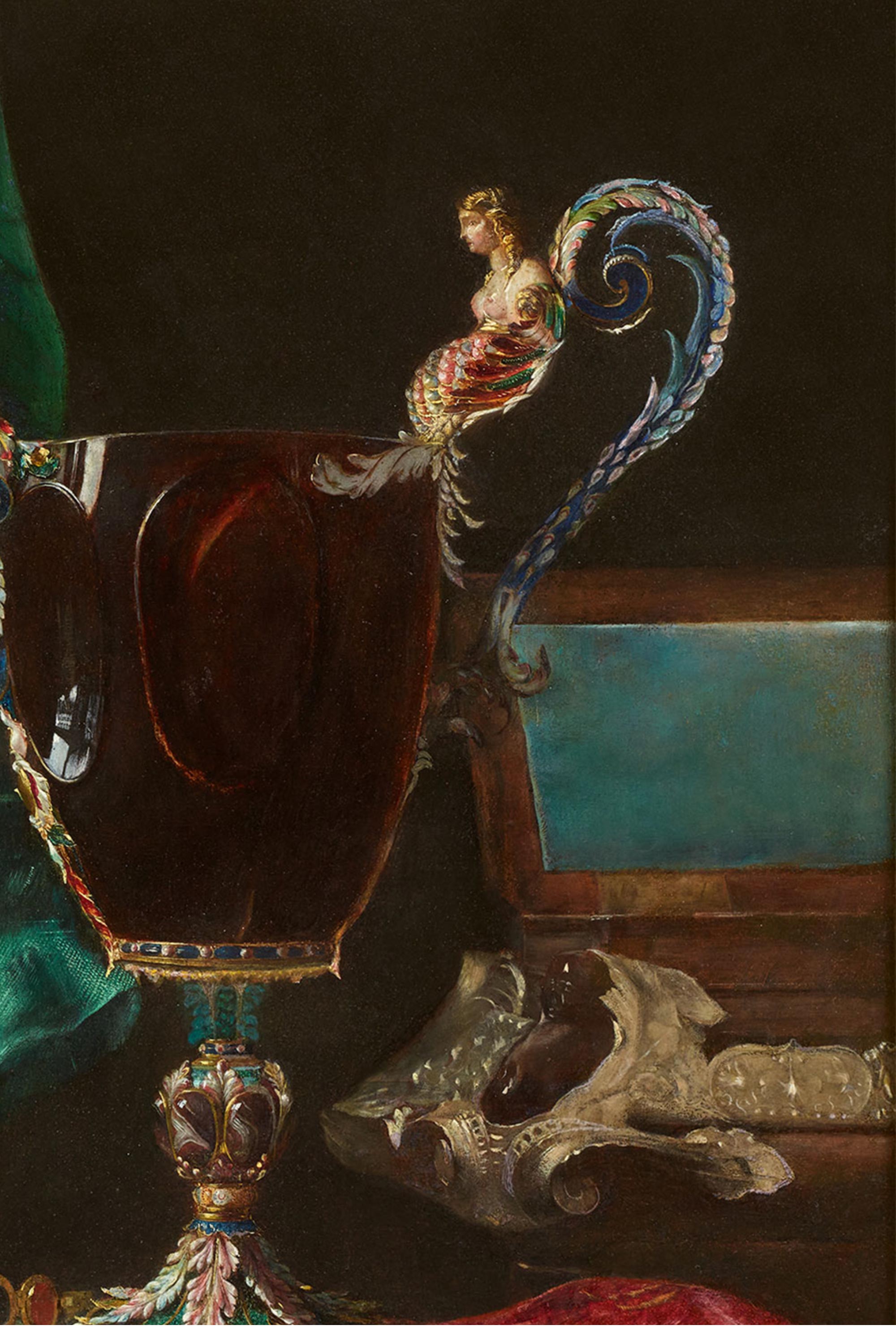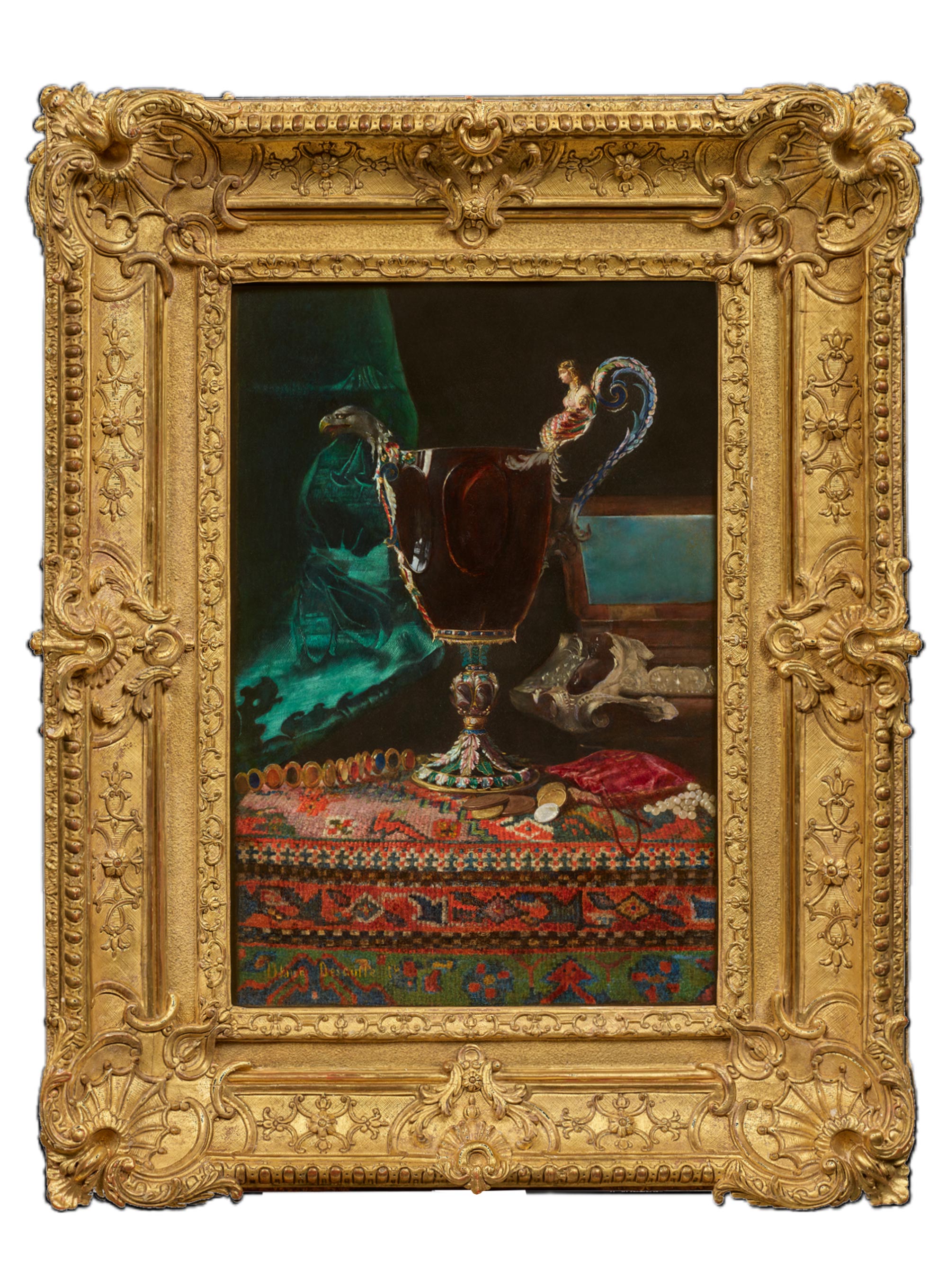 独角鹿西洋古董 1857年代法国画家Blaise Desgoffe签名创作静物油画作品《土耳其地毯上的玛瑙珐琅杯》