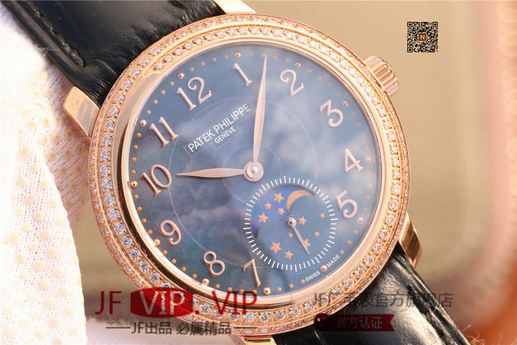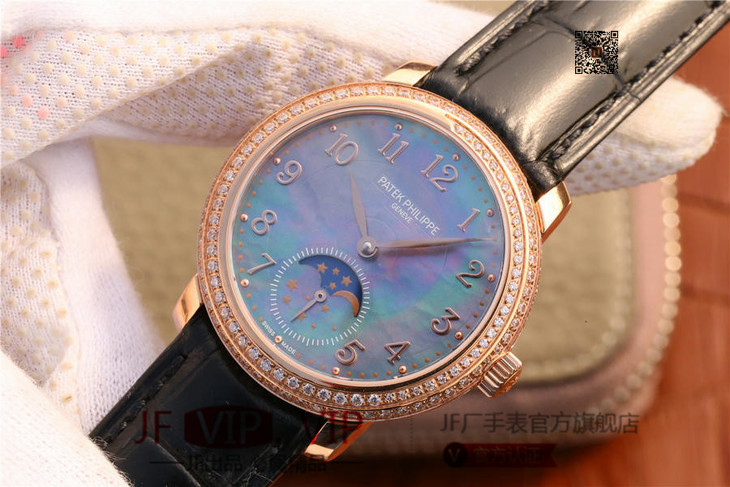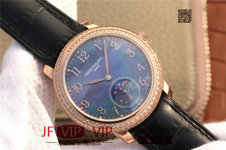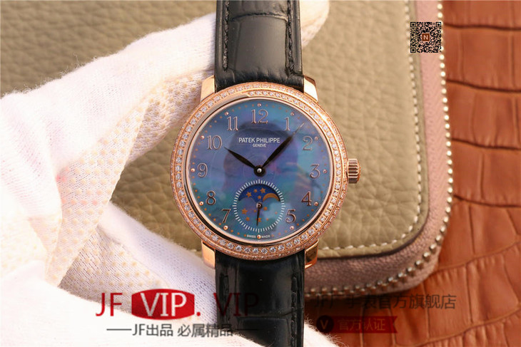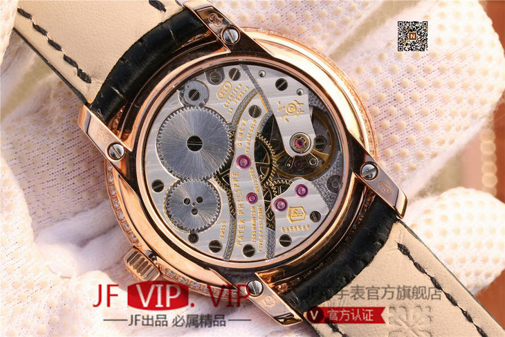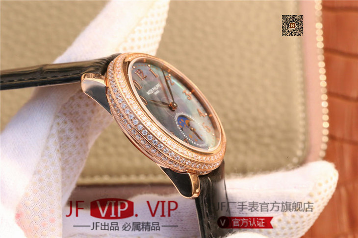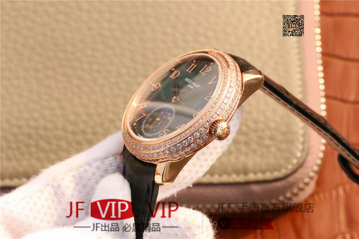 百达翡丽复杂功能系列4968女士手表。海鸥克隆组装215 PS LU手动机械机芯,33.3毫米直径,镶嵌施华洛世奇钻。