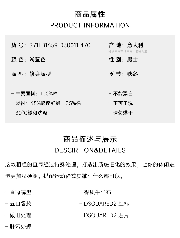 DSQUARED2 男士字母徽标标签棉质休闲牛仔裤 浅蓝色 S71LB1659 D30011 470