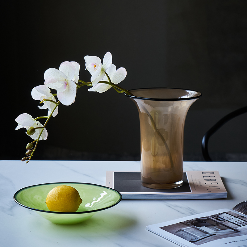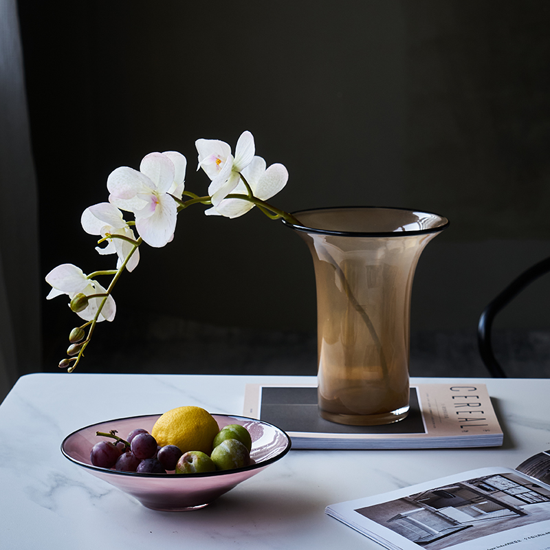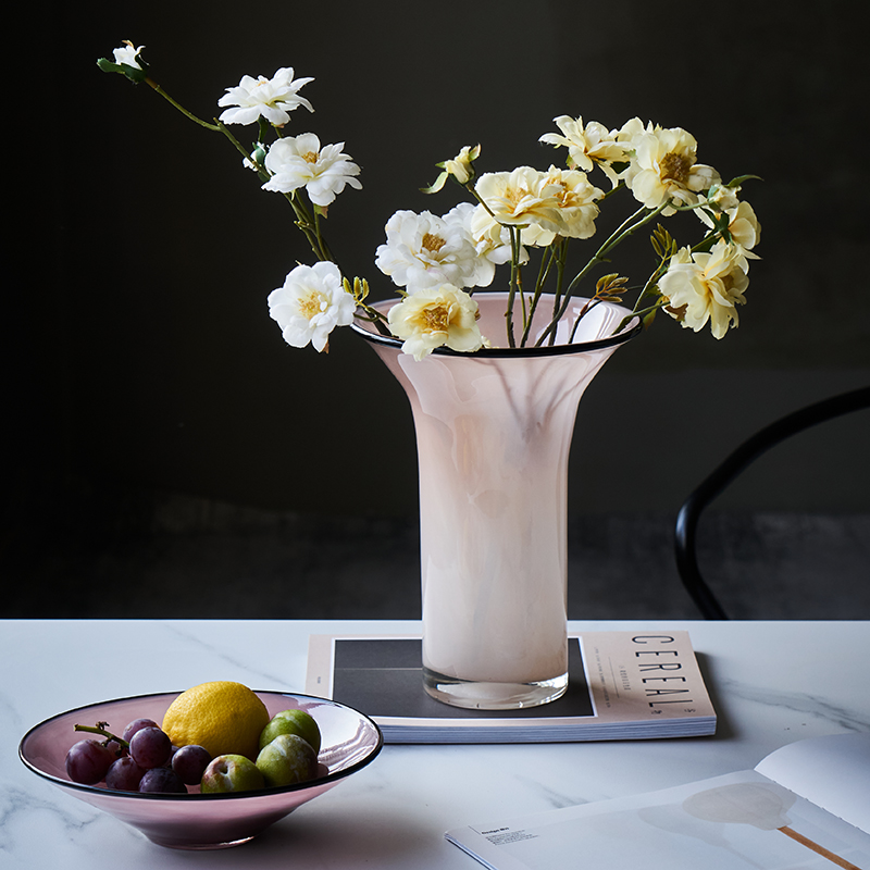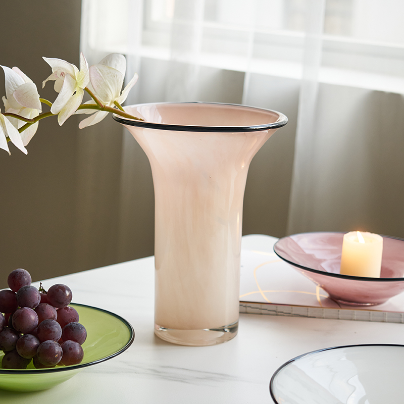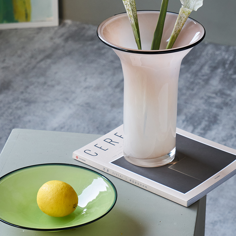北欧风瓷粉黑边敞口花瓶鲜花餐桌电视柜简约创意手工家用玻璃果盘