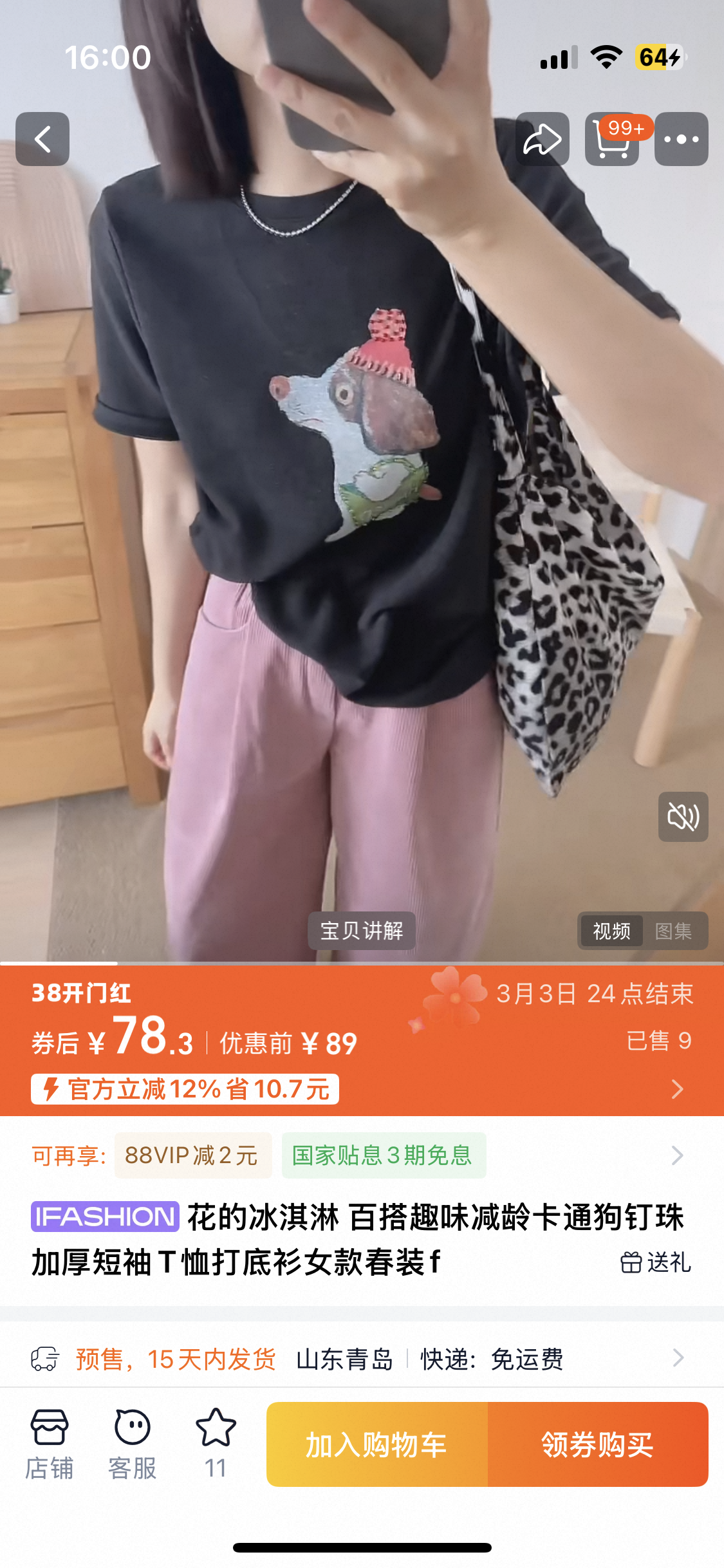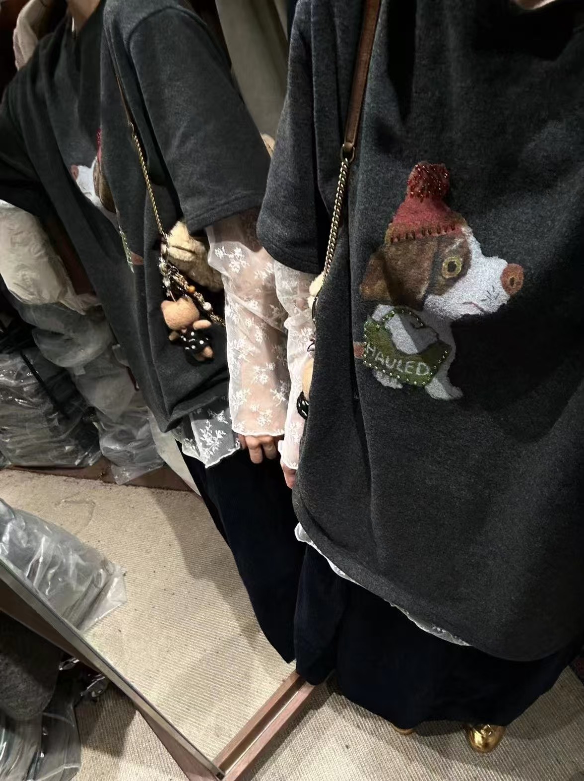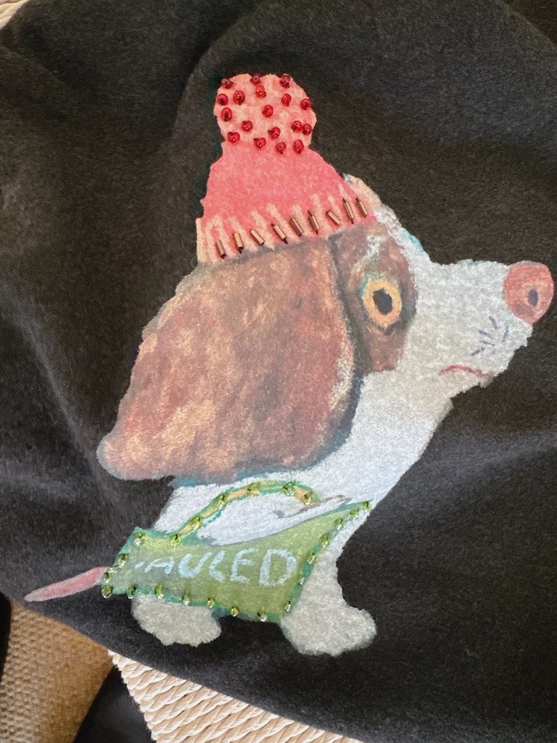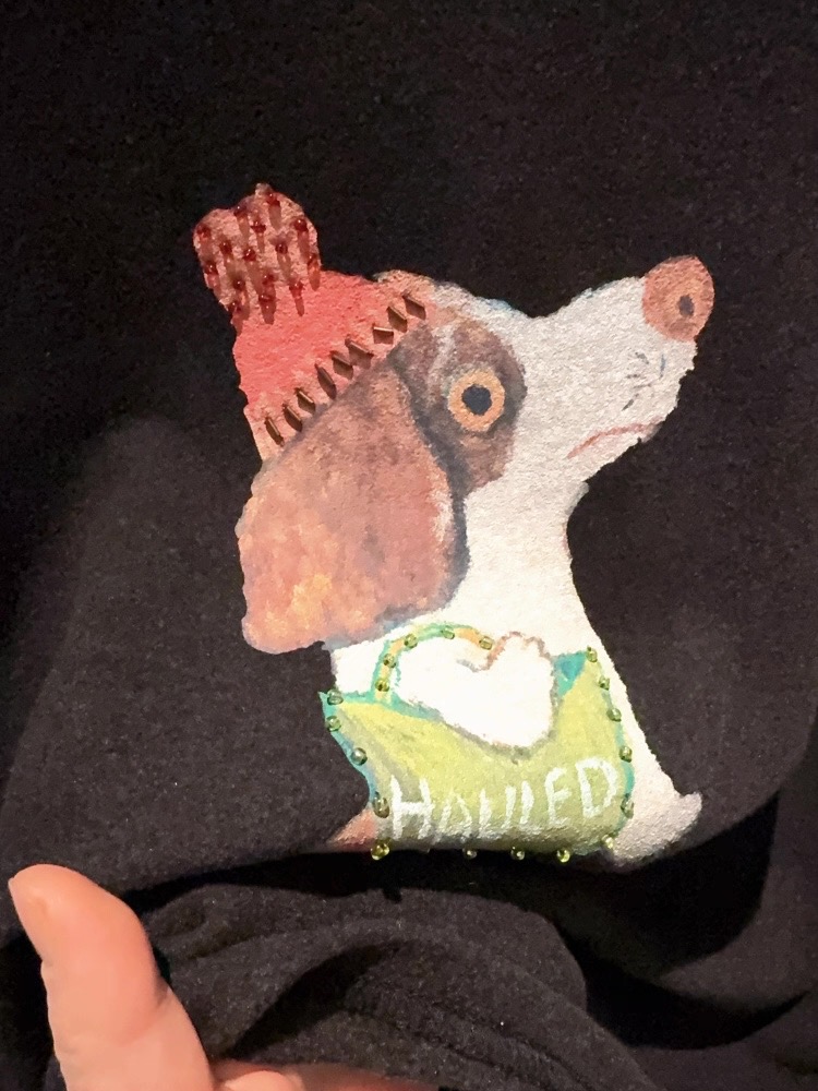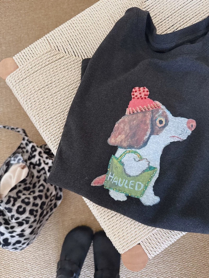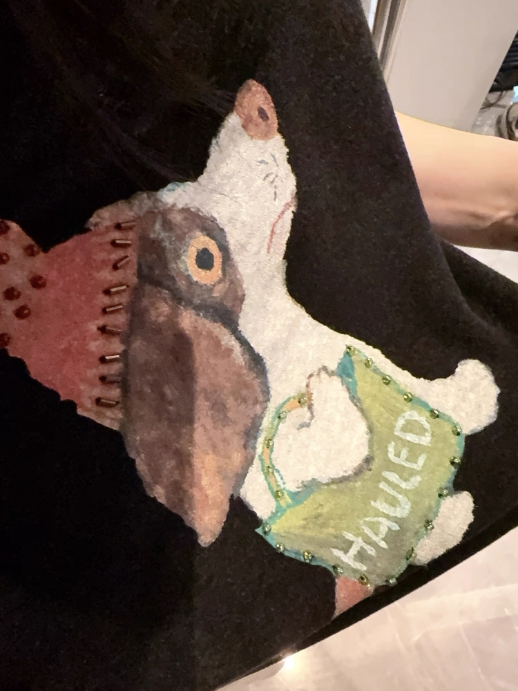 油画感的手绘小狗,戴着粉嘟嘟的针织帽,还挎着小绿包,傲娇的小表情真的萌到心化~图案上还有钉珠点缀,在光下blingbling的,细节感直接拉满!