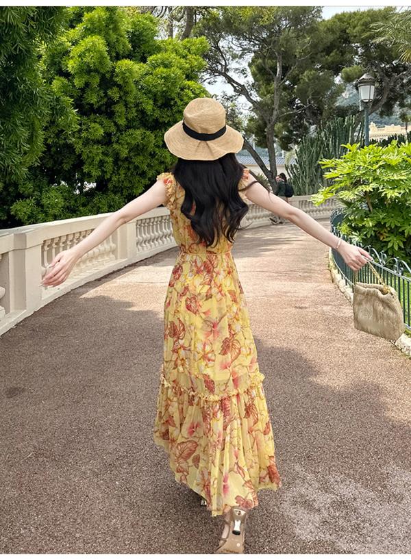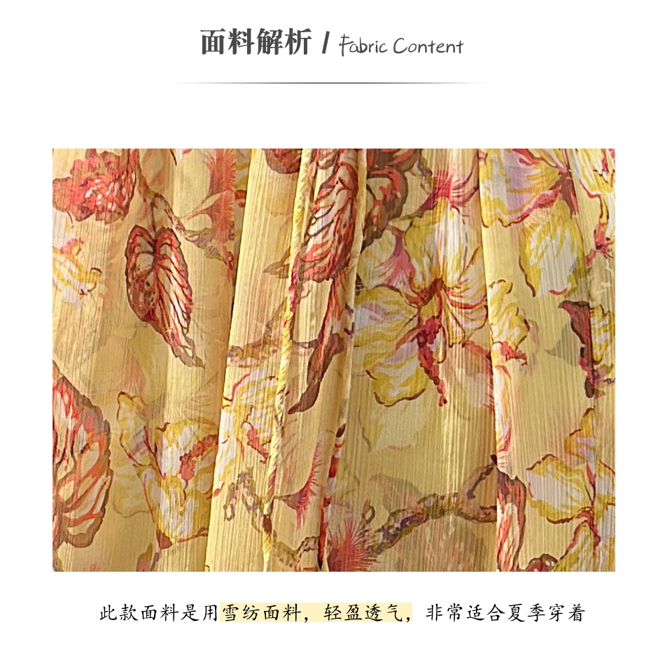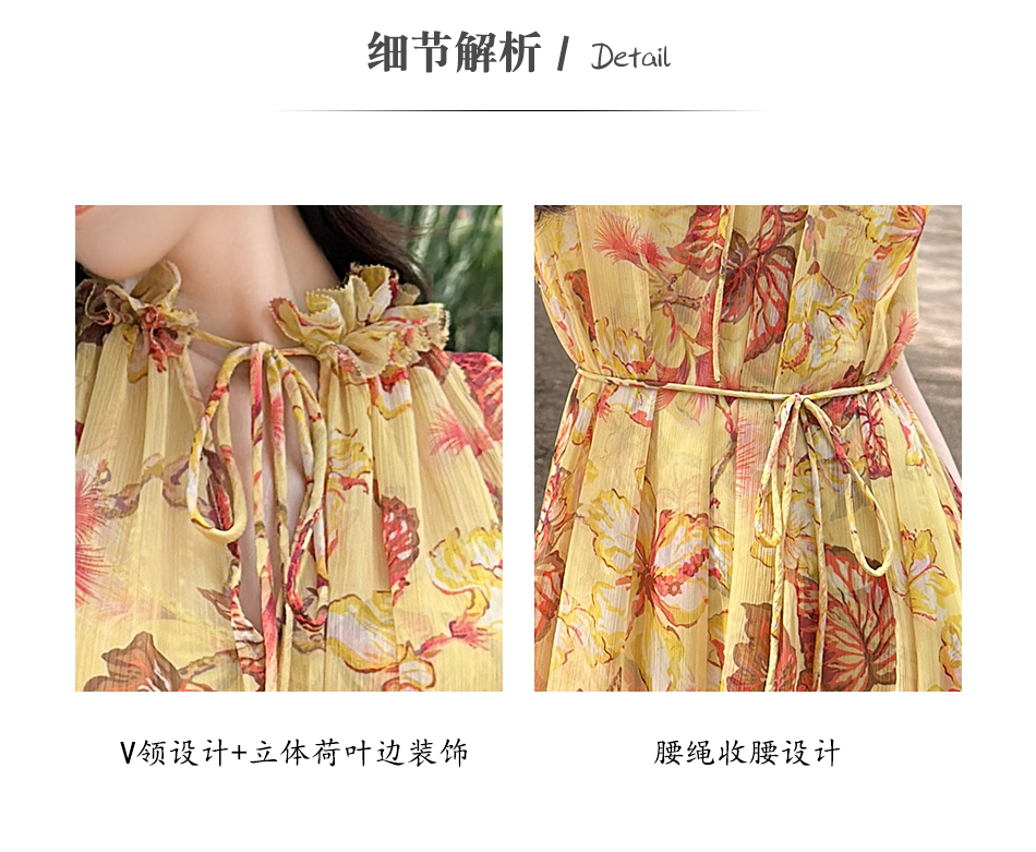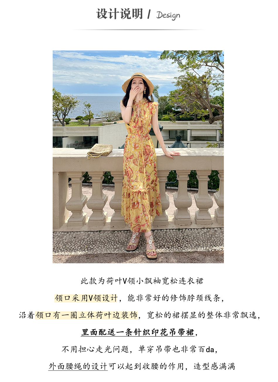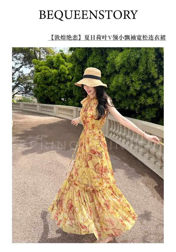 BeQueenStory【敦煌绝恋】轻盈透气夏日荷叶V领小飘袖宽松连衣裙