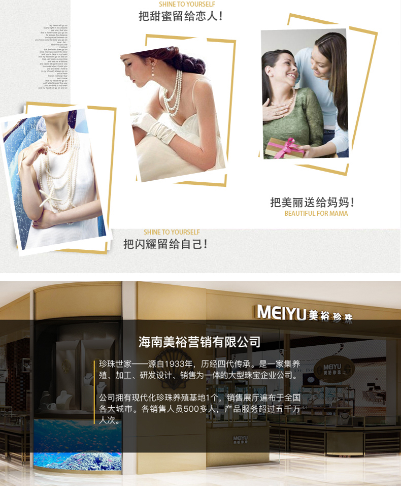 - 珍珠世家,代代相传。美裕珍珠,1933年起源于印尼,成长于海南岛。依托海南资源优势和自身专业优势,以经营南珠、南洋珠为主,专注于珍珠文化的挖掘和传播,把珍珠代表的爱意,永不间断地传承下去。