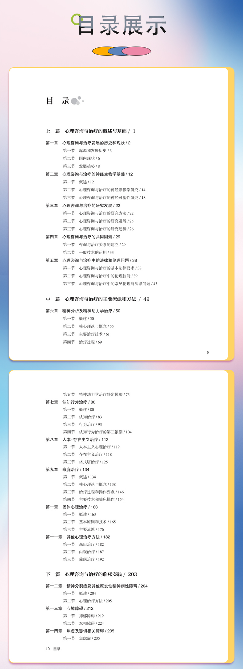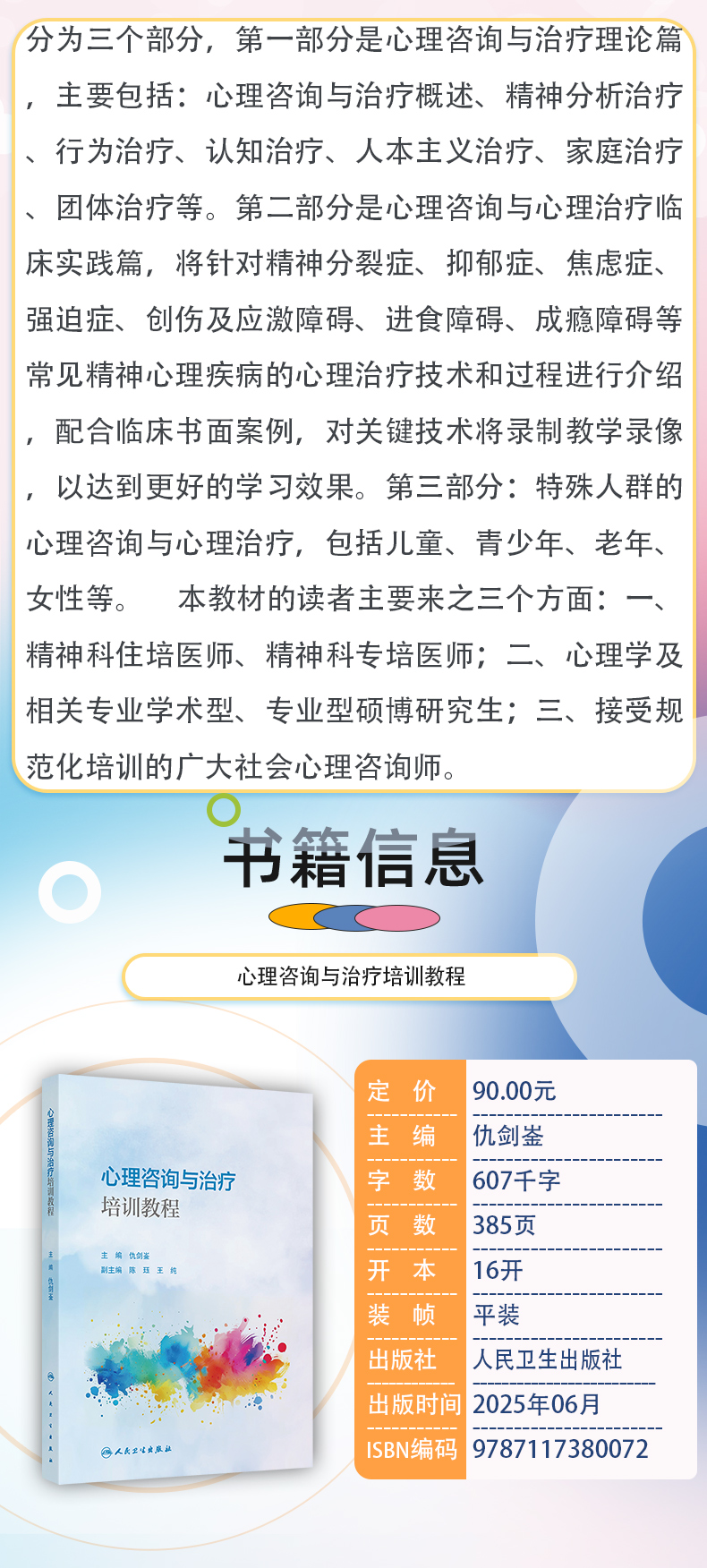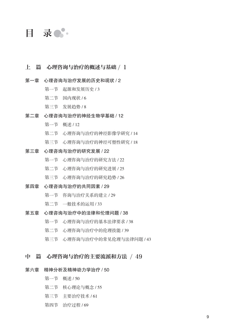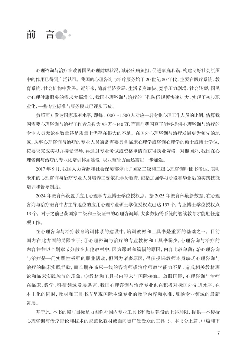 "分为三个部分,**部分是心理咨询与治疗理论篇,主要包括:心理咨询与治疗概述、精神分析治疗、行为治疗、认知治疗、人本主义治疗、家庭治疗、团体治疗等。**部分是心理咨询与心理治疗临床实践篇,将针对精神分裂症、抑郁症、焦虑症、强迫症、创伤及应激障碍、进食障碍、成瘾障碍等常见精神心理疾病的心理治疗技术和过程进行介绍,配合临床书面案例,对关键技术将录制教学录像,以达到更好的学习效果。第三部分:特殊人群的心理咨询与心理治疗,包括儿童、青少年、老年、女性等。 本教材的读者主要来之三个方面:一、精神科住培医师、精神科专培医师;二、心理学及相关专业学术型、专业型硕博研究生;三、接受规范化培训的广大社会心理咨询师。"
