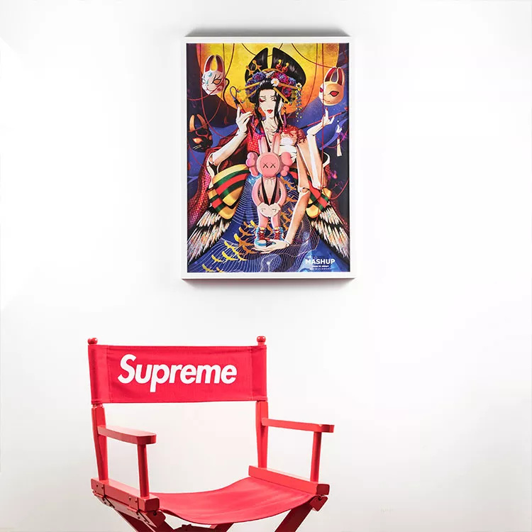 整幅画以日式风格为主基调,一改“嫦娥应悔偷灵药”的悲情印象,将歌舞伎元素运用于上,将玉兔恶搞地设计为了KAWS经典的兔女郎形象,“玉兔”内八字脚踩Nike SB Dunk High “哆啦A梦”背景一轮圆月,配以日式风格的“兔面具”也使整幅作品的更为充实饱满