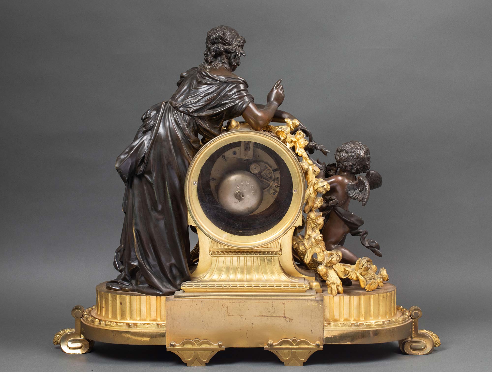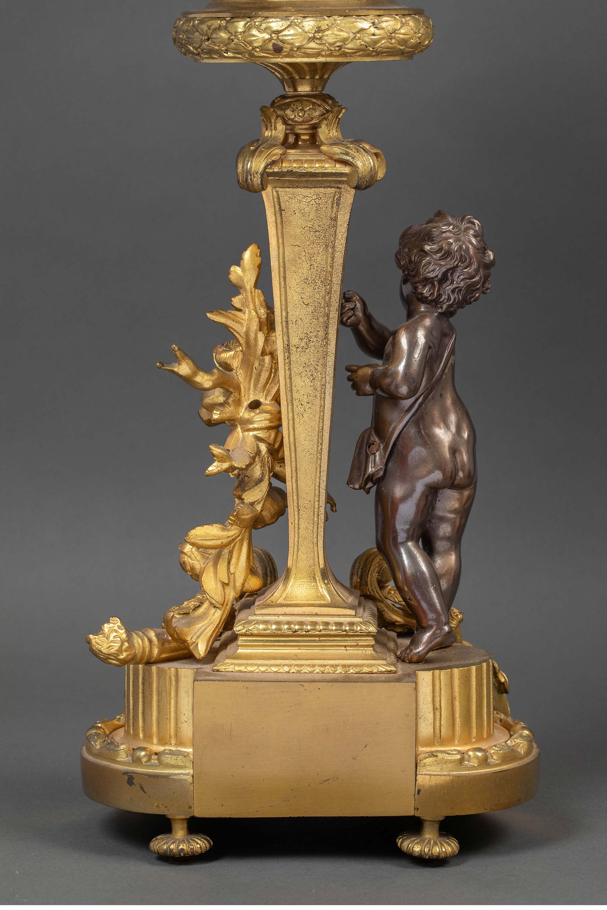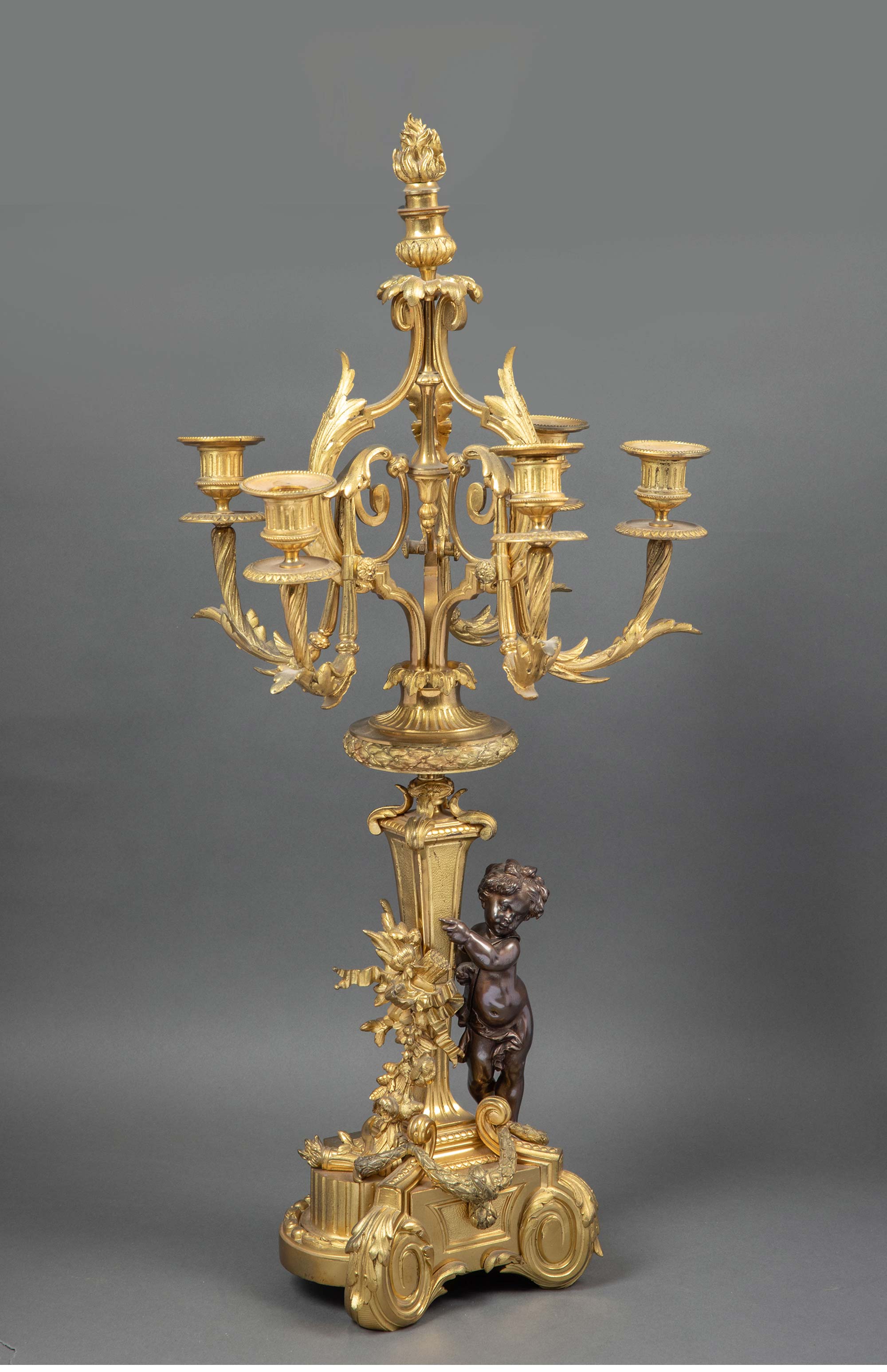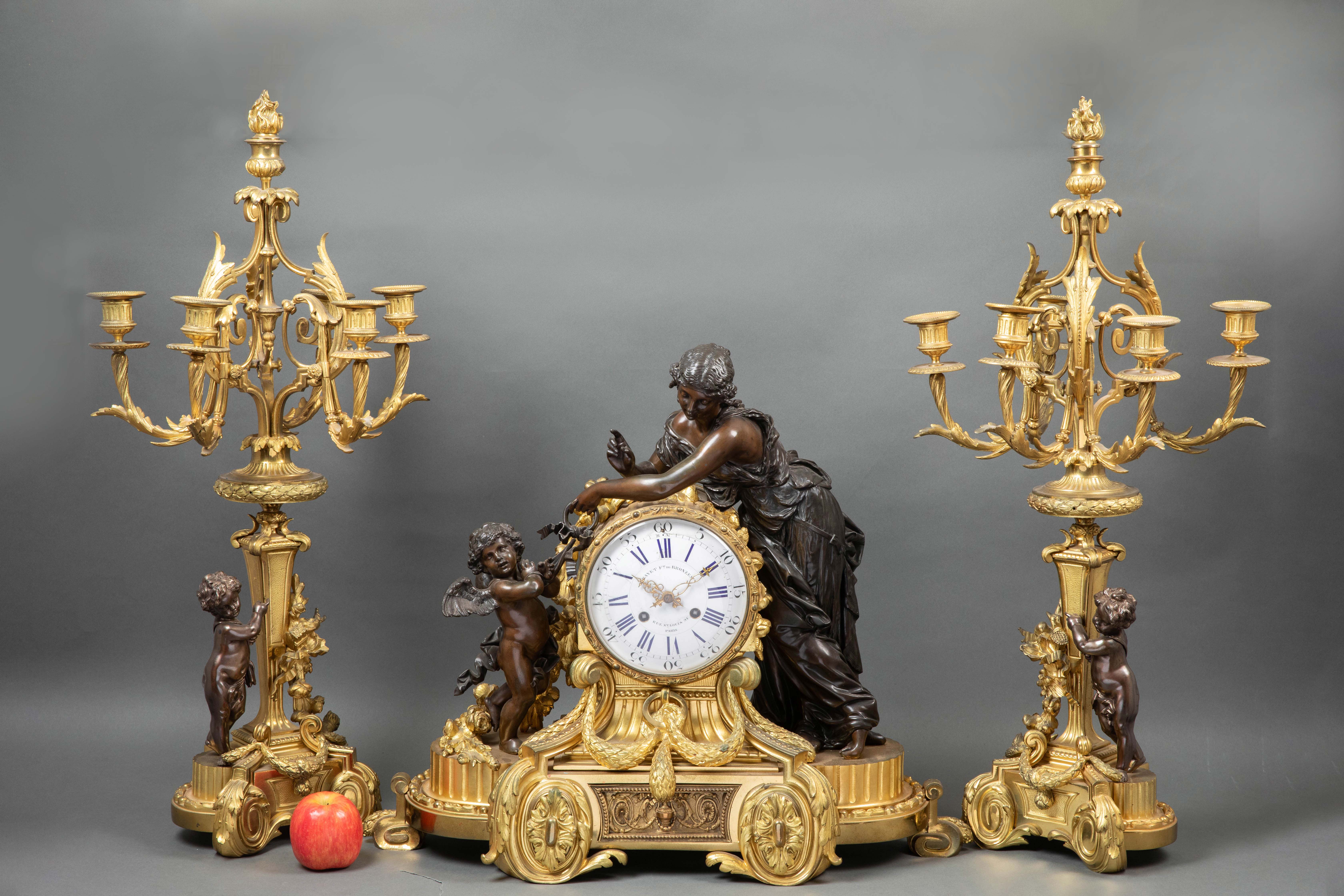 19世纪法国出品卷叶纹铜鎏金精雕镶嵌神话人物主题青铜雕像装饰座钟烛台三件套