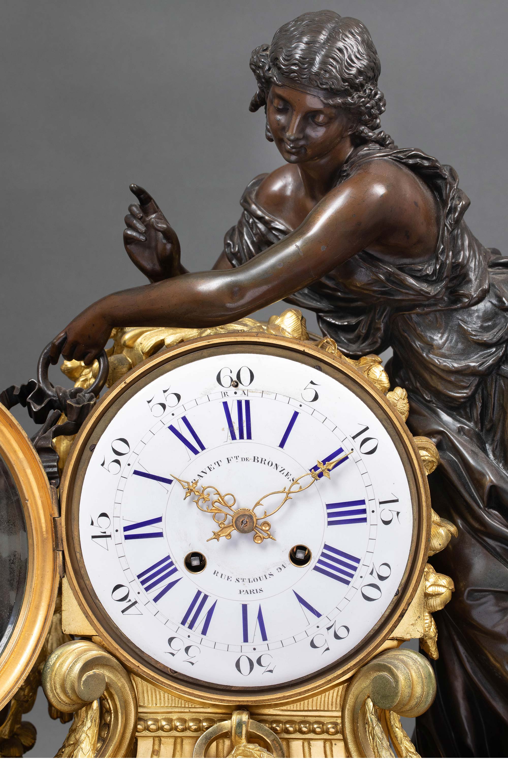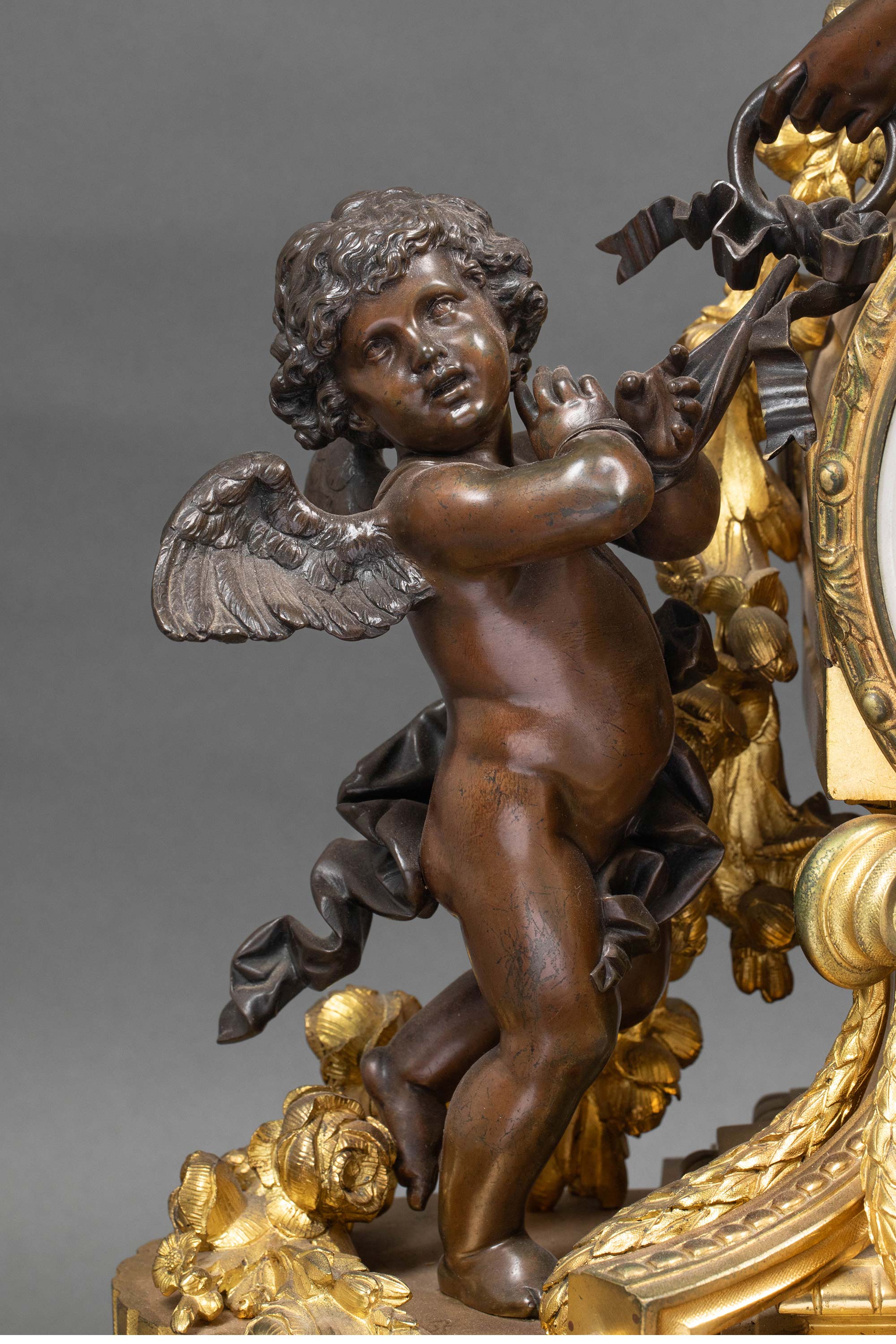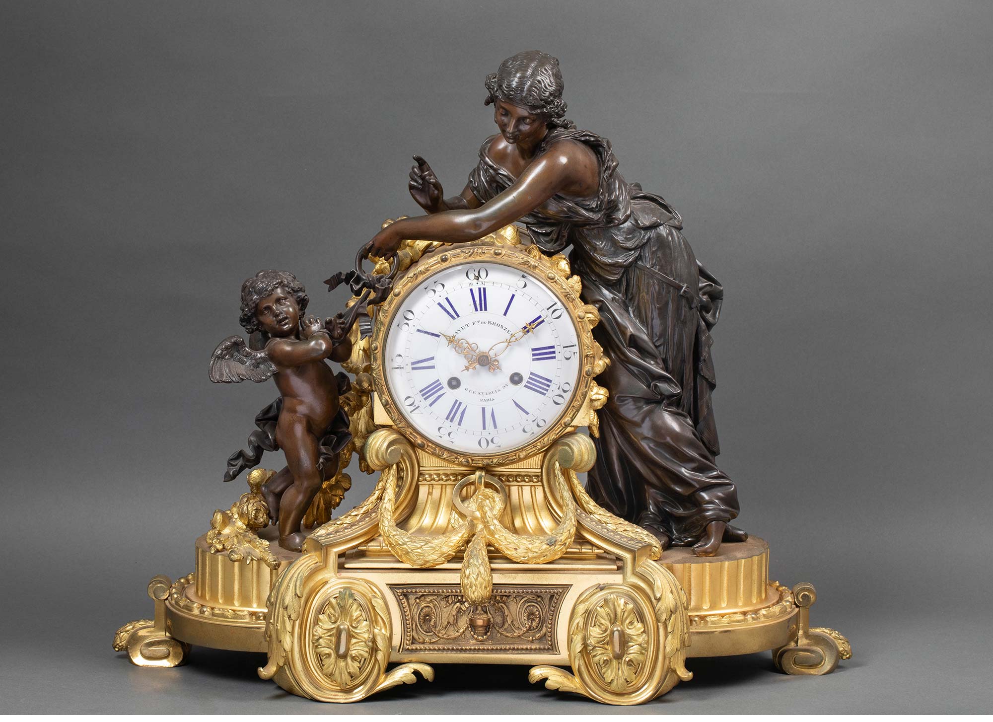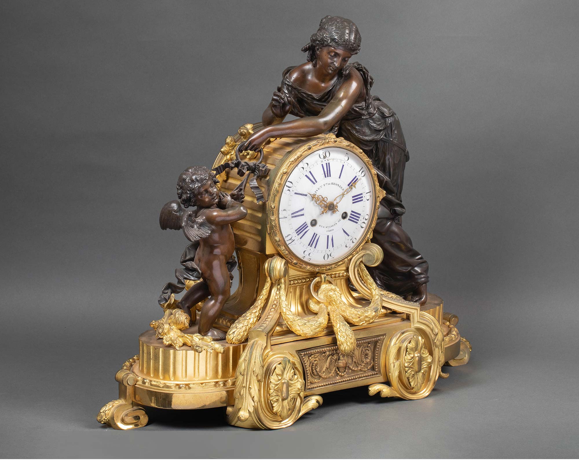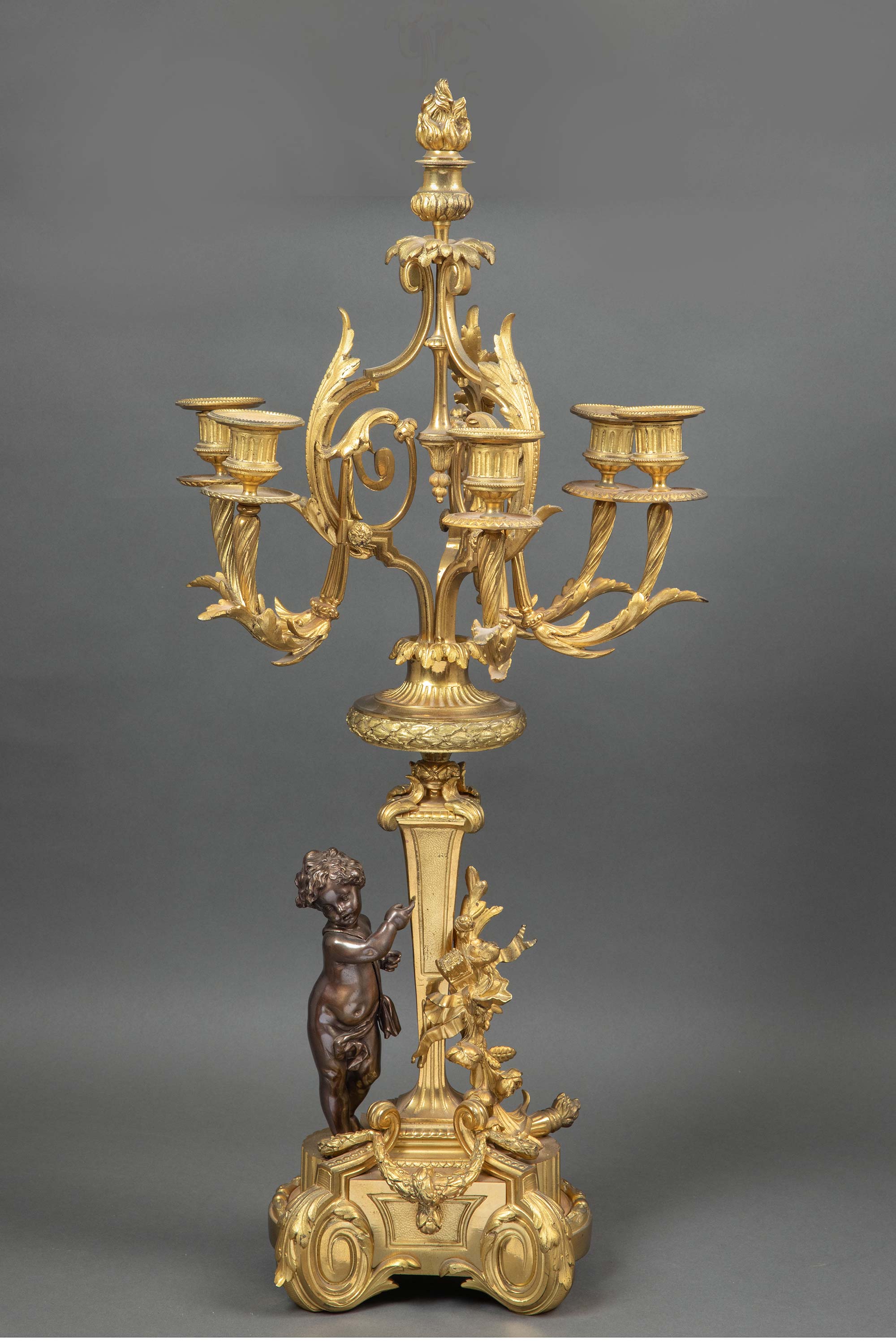 19世纪法国出品卷叶纹铜鎏金精雕镶嵌神话人物主题青铜雕像装饰座钟烛台三件套