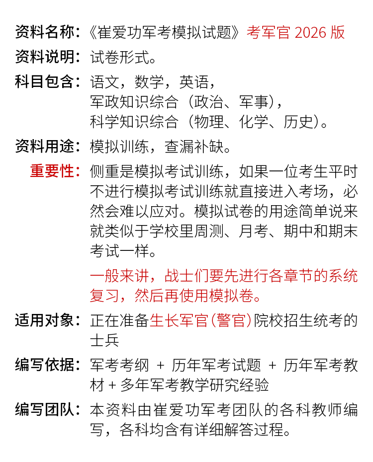 预售!2026版考军官(警官)崔爱功《军考模拟试题》高中和大专士兵考军校