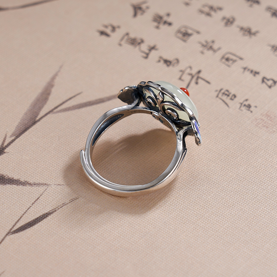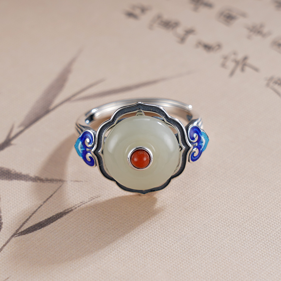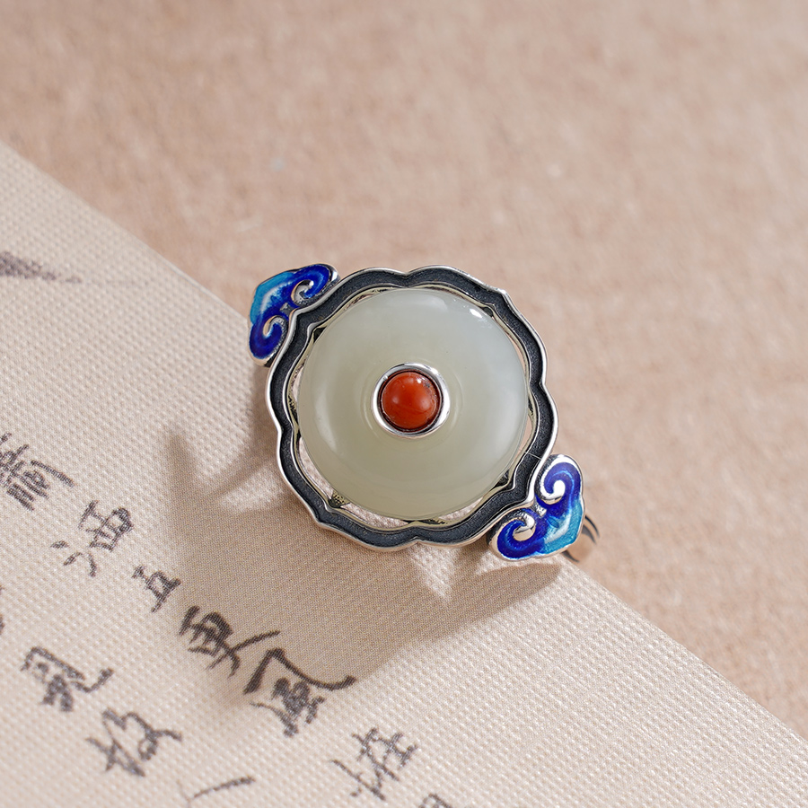 【寓意】:戒指融入祥云如意纹,祥云包裹和田玉,瑞气升腾而出。每一次佩戴,吉祥涌动,祥瑞暗生。