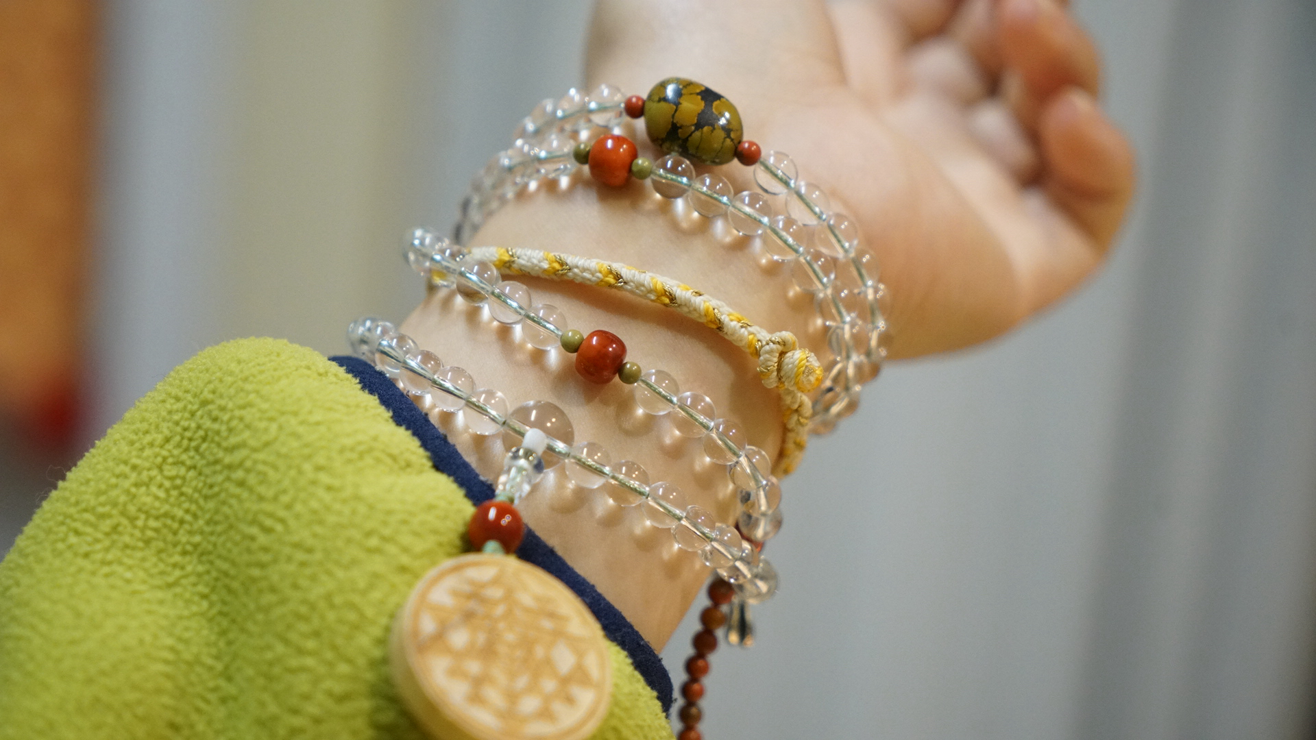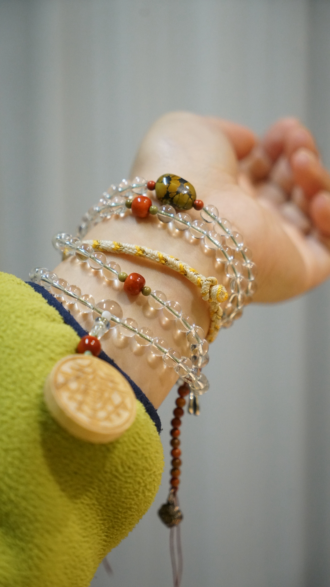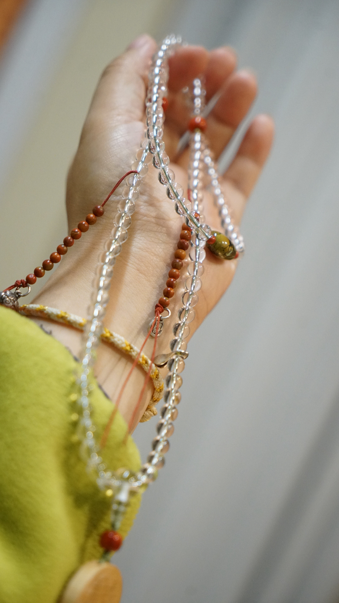 顶珠原矿绿松石(无优化天然铁线分布个性十足),精品南红玛瑙,圣木(基本买不到了这种款式,美国人肉带回的),6.5mm干净清澈的白水晶108念珠~原创设计~计数器是包浆料南红玛瑙做的,整体细细品味很精美,做功课,或装饰,或冥想佩戴都太好了。