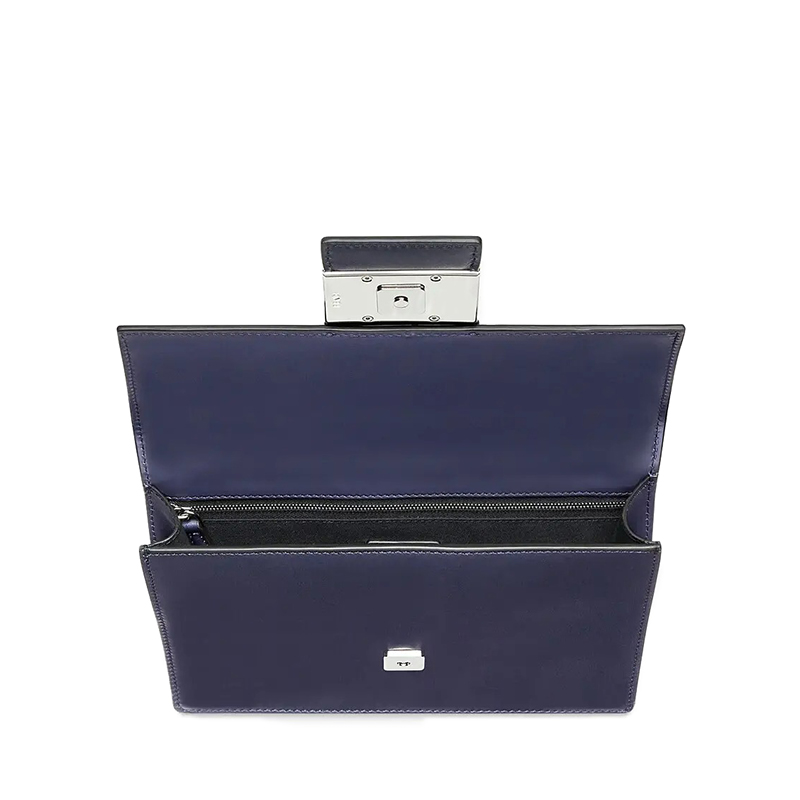深蓝色皮革中号扁平 Baguette 包,帆布翻盖饰有同色系刺绣 FF 图案。带磁性纽扣的 FF 封口。