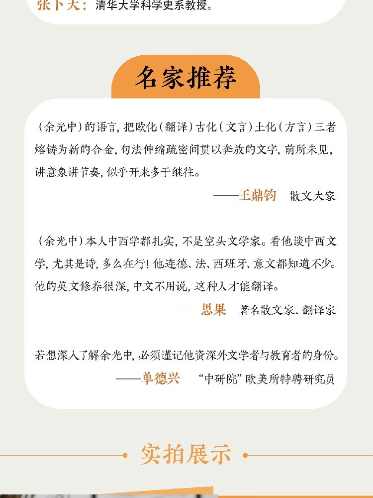 (余光中)本人中西学都扎实,不是空头文学家。看他谈中西文学,尤其是诗,多么在行!他连德、法、西班牙、意文都知道不少。他的英文修养很深,中文不用说,这种人才能翻译。