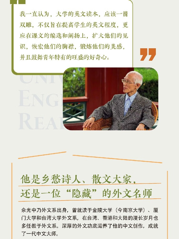 ※ 隐藏的外文名家 余光中乃外文系出身,曾就读于金陵大学、厦门大学和台湾大学外文系,在台湾、香港和大陆的漫长岁月多任教于外文系。深厚的外文功底滋养了他的中文创作,成就了一代中文大师。