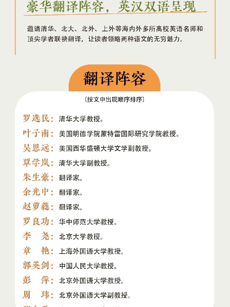 本次出版,邀请清华、北大、人大、北外、上外等多校英语名师和优秀学者联袂翻译,英汉双语呈现,让读者领略两种语文的无穷魅力。