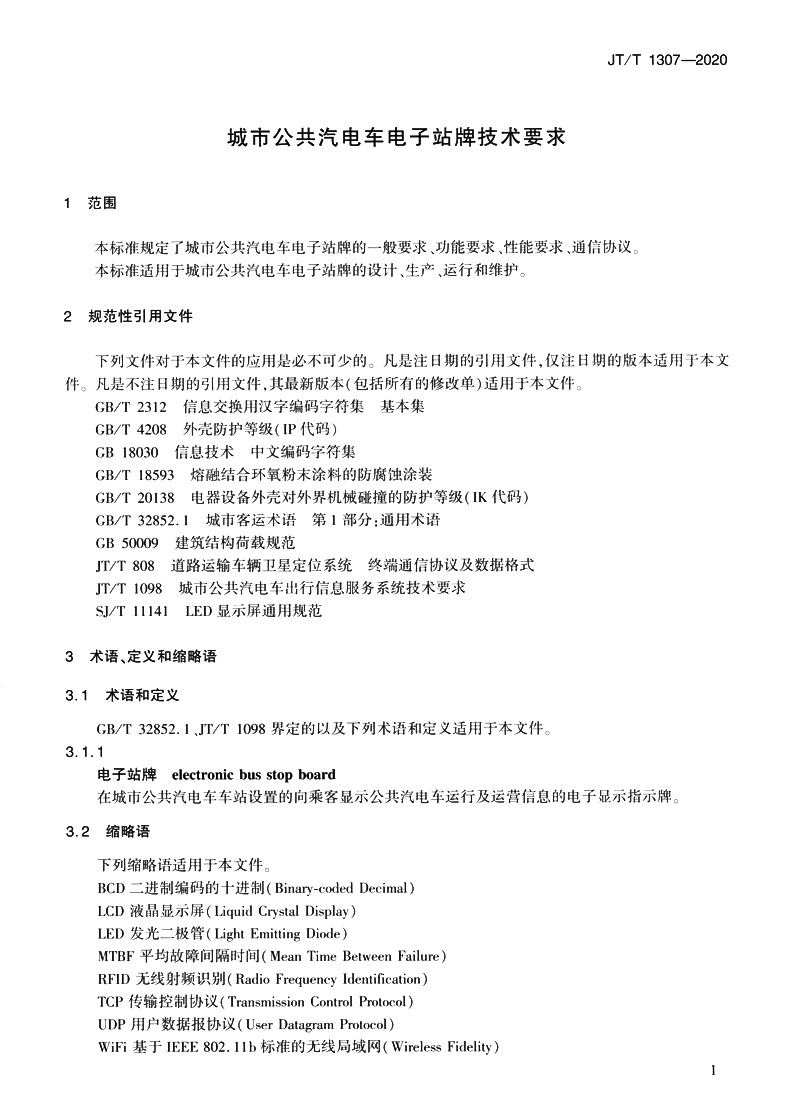 书名:城市公共汽电车电子站牌技术要求(JT/T 1307—2020)