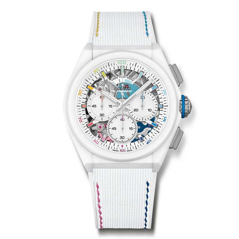 镜面 材质 | 蓝宝石水晶玻璃 | 表盘 | 白色哑光陶瓷表壳 白色镂空表盘;白色镂空,时标:镀铑刻面,涂覆“彩虹”漆面。指针:镀铑刻面,涂覆彩漆 日期显示 计时 背透 |