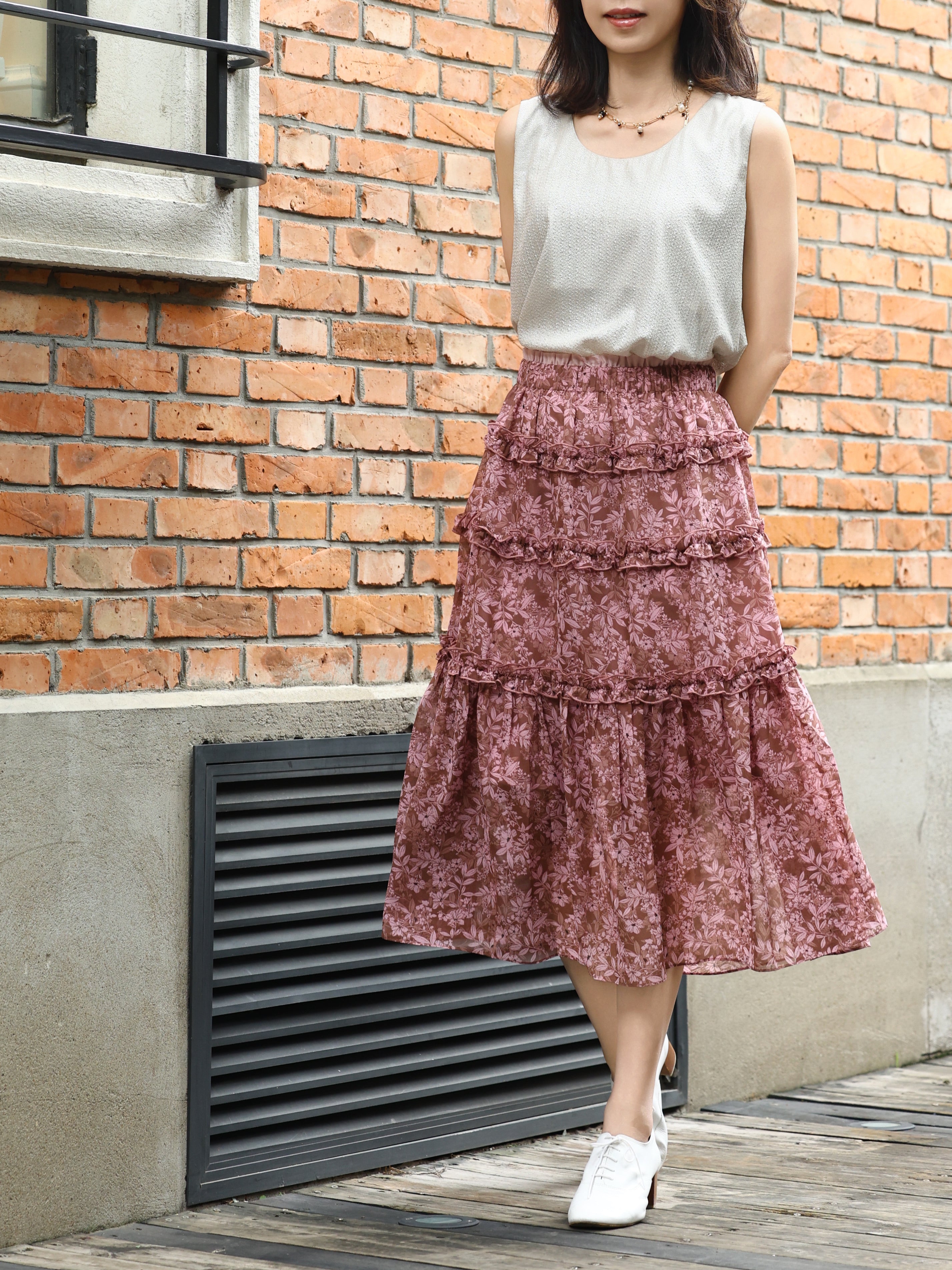 TYNVIE 复古荷叶边方领长袖衬衫-印花