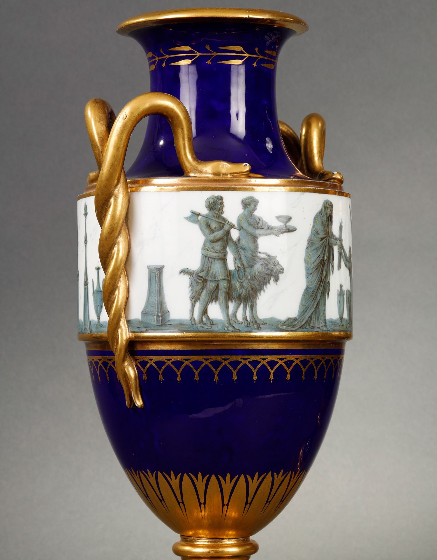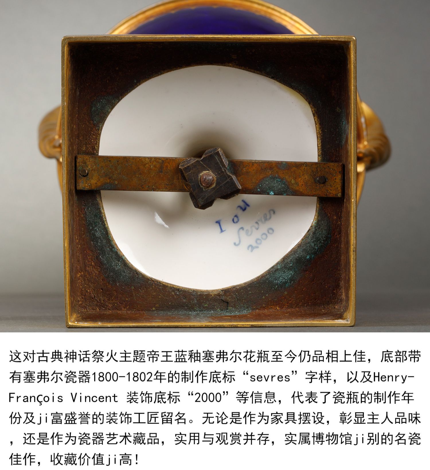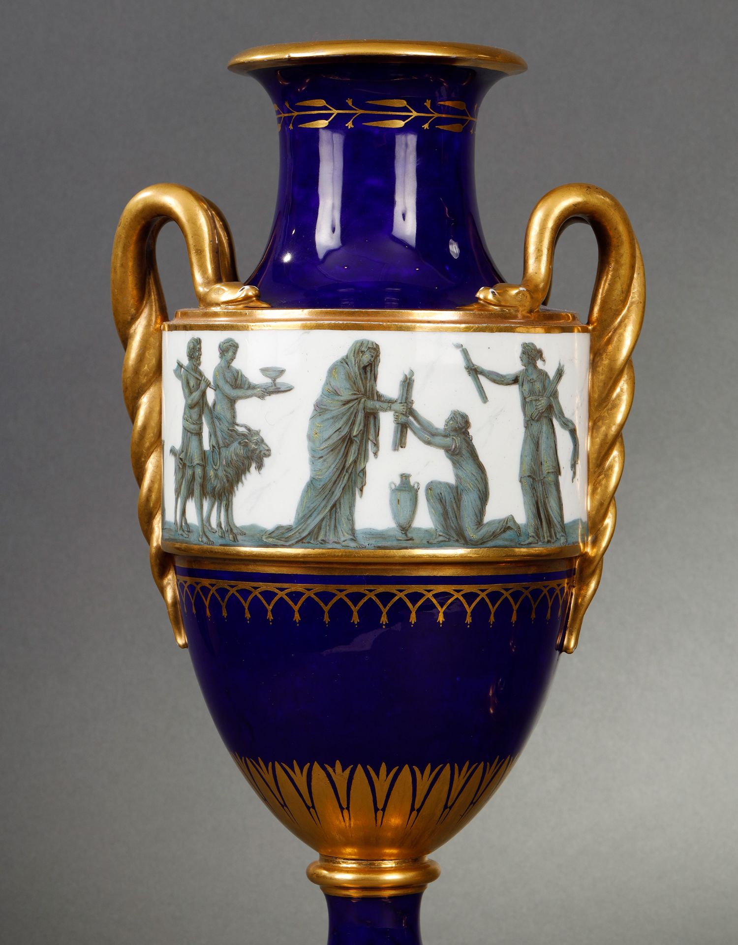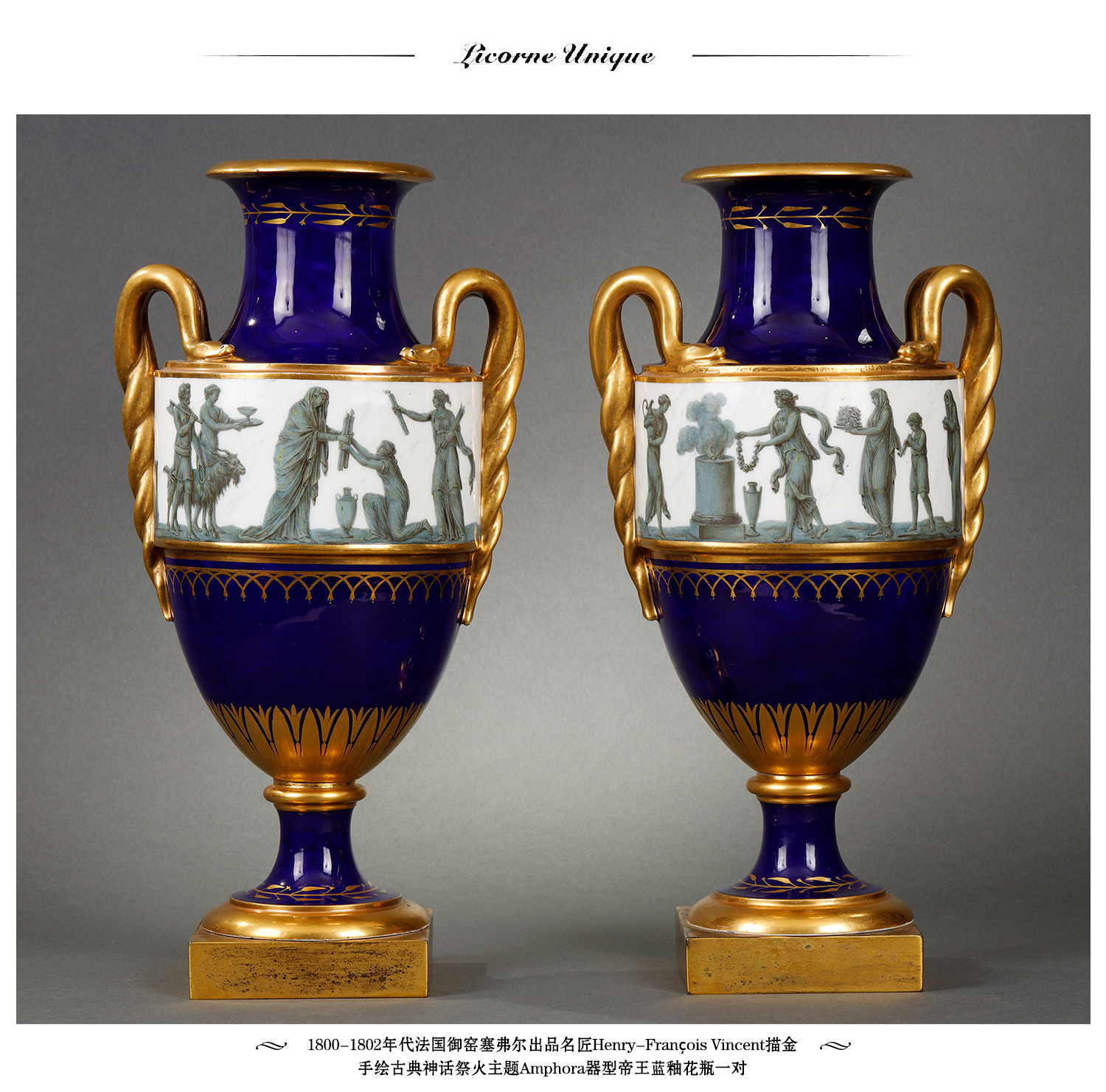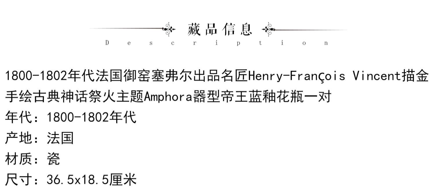 独角鹿西洋古董瓷器塞弗尔描金手绘古典神话祭火主题帝王蓝釉花瓶