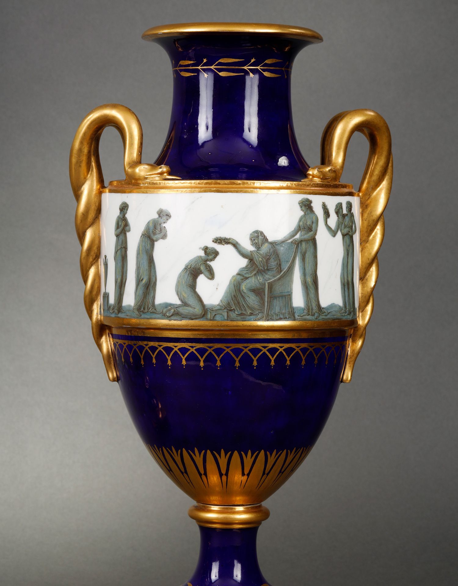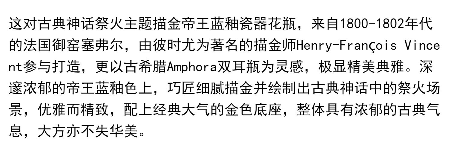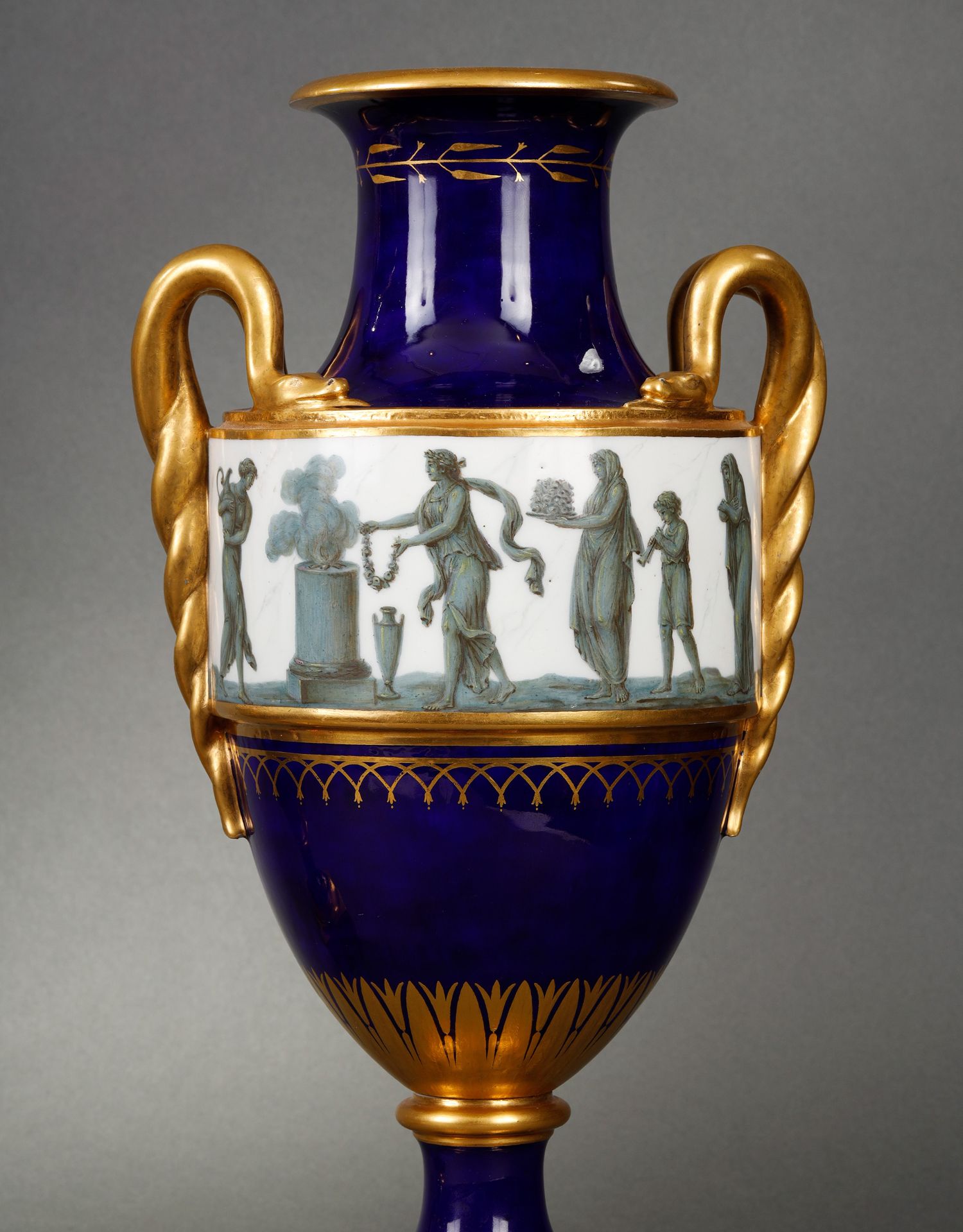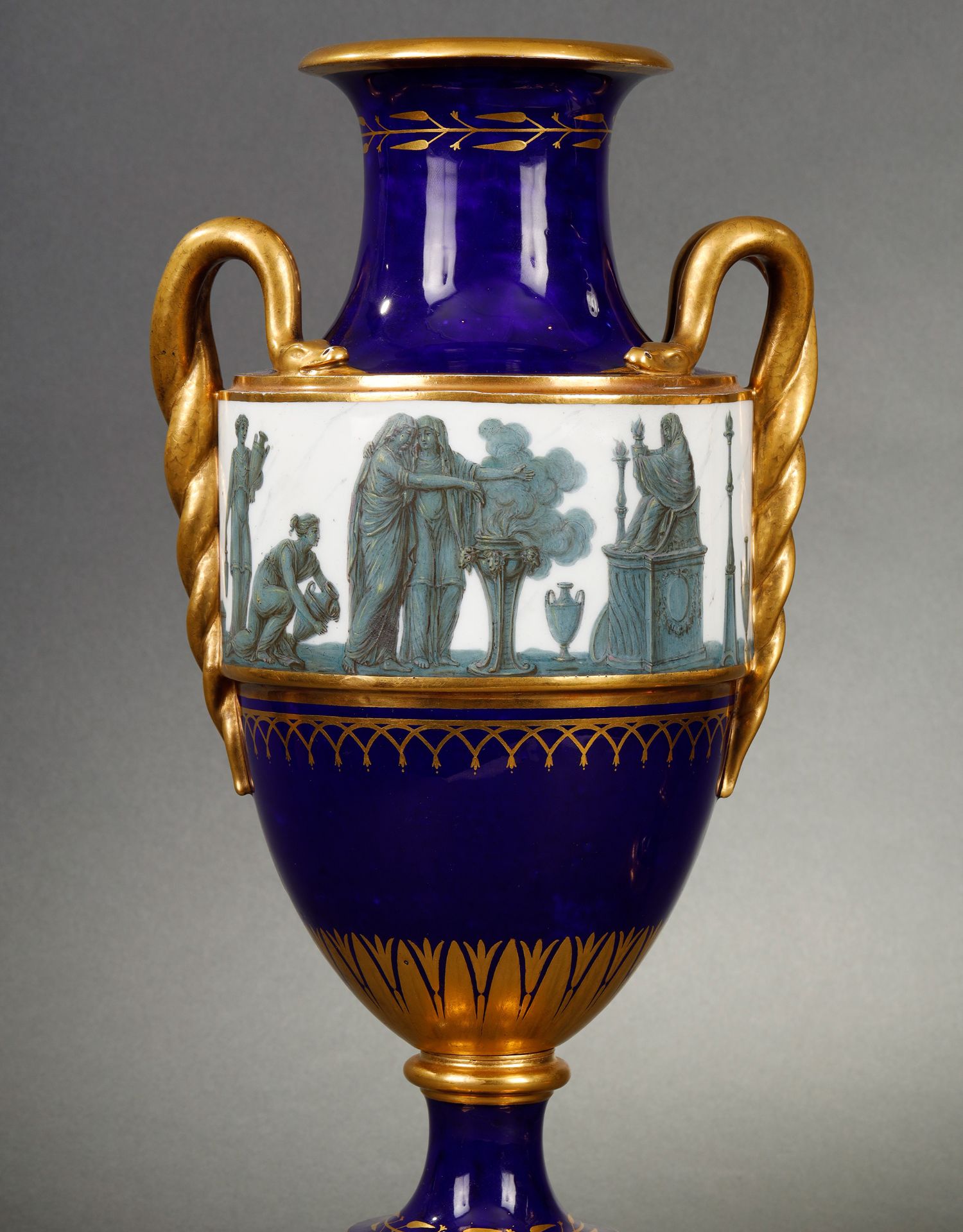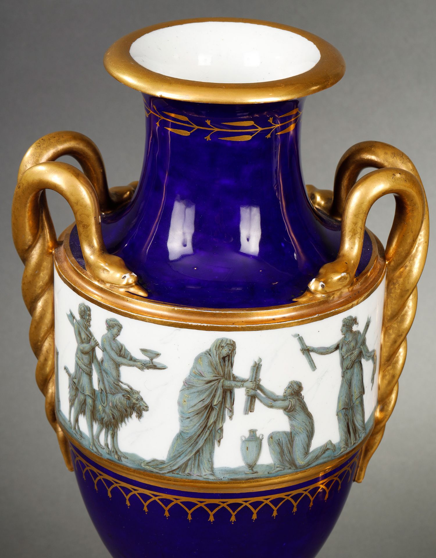 独角鹿西洋古董瓷器塞弗尔描金手绘古典神话祭火主题帝王蓝釉花瓶