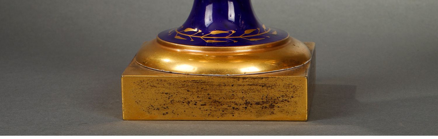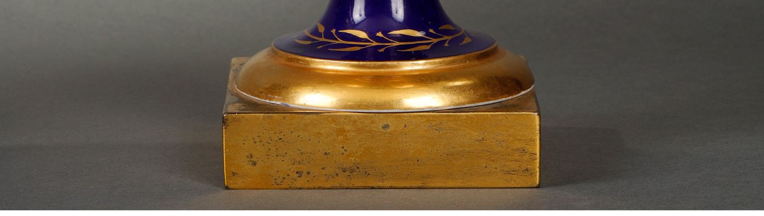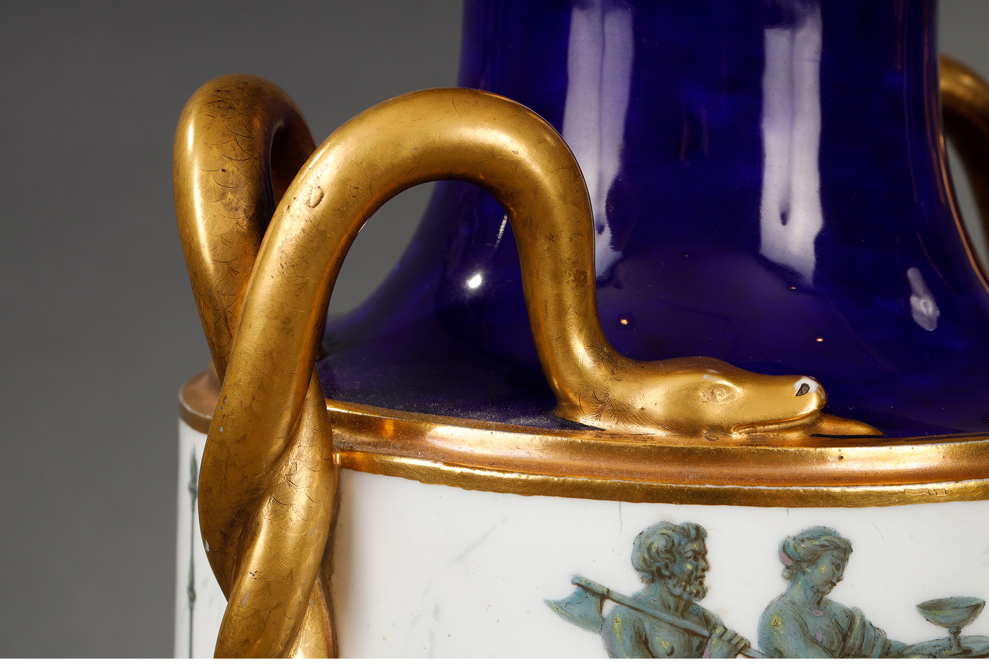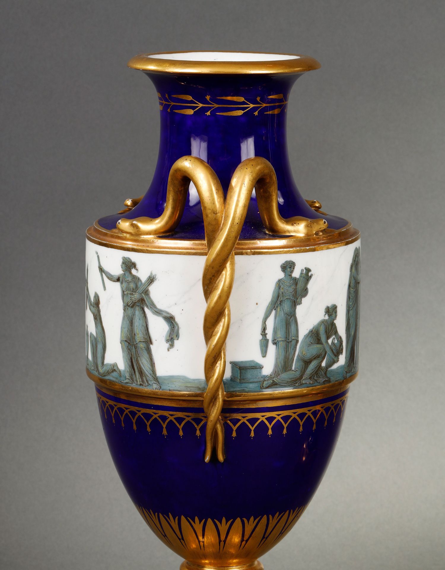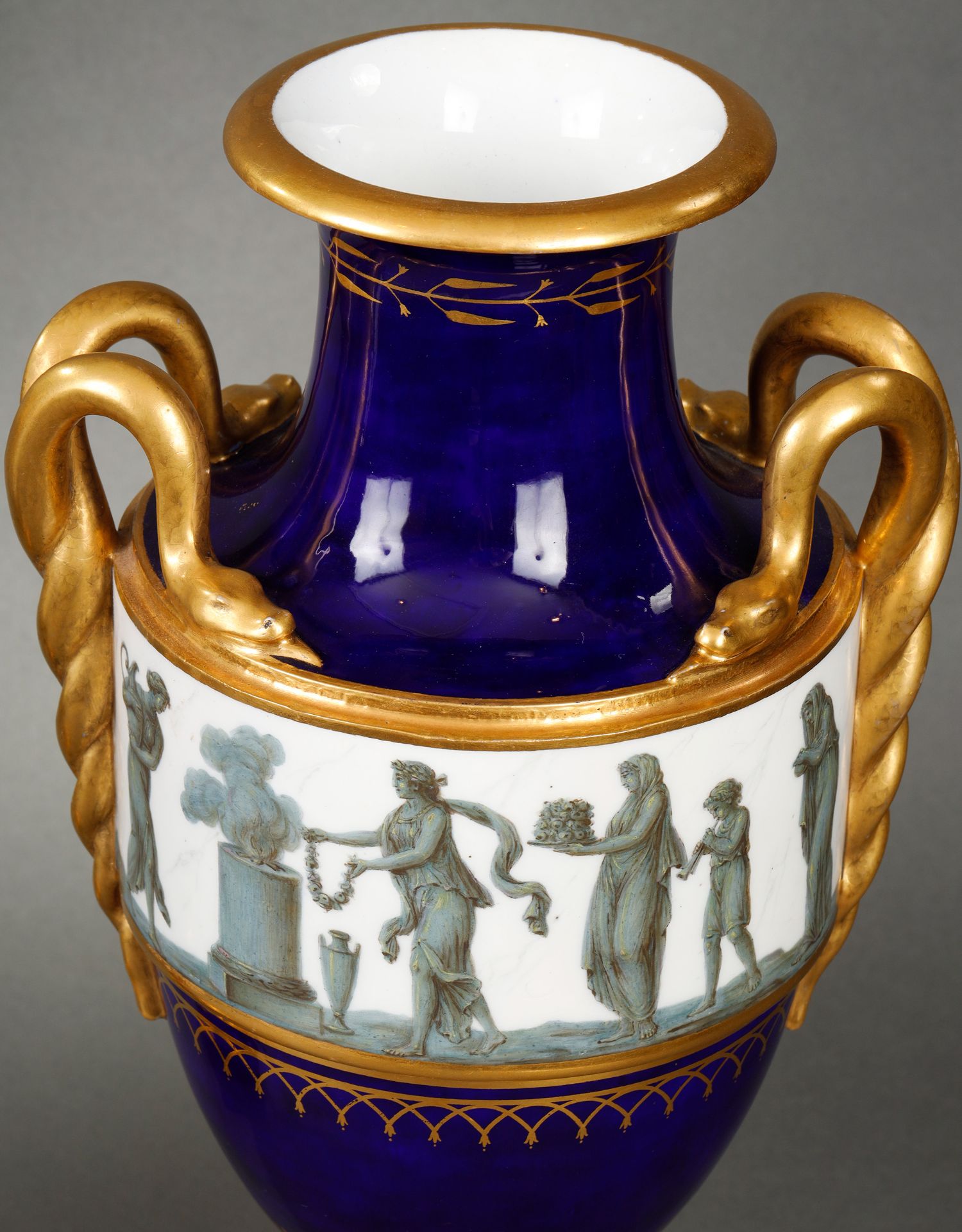 独角鹿西洋古董瓷器塞弗尔描金手绘古典神话祭火主题帝王蓝釉花瓶