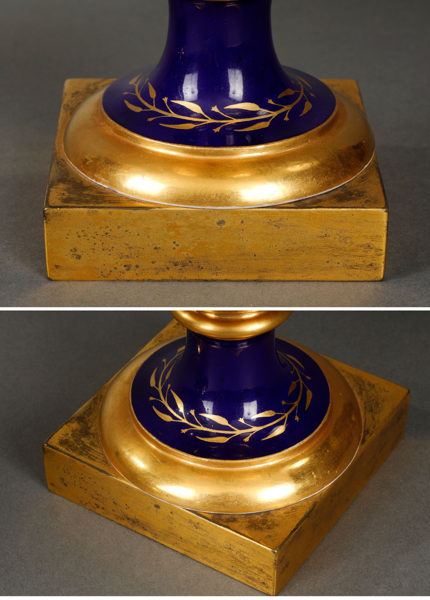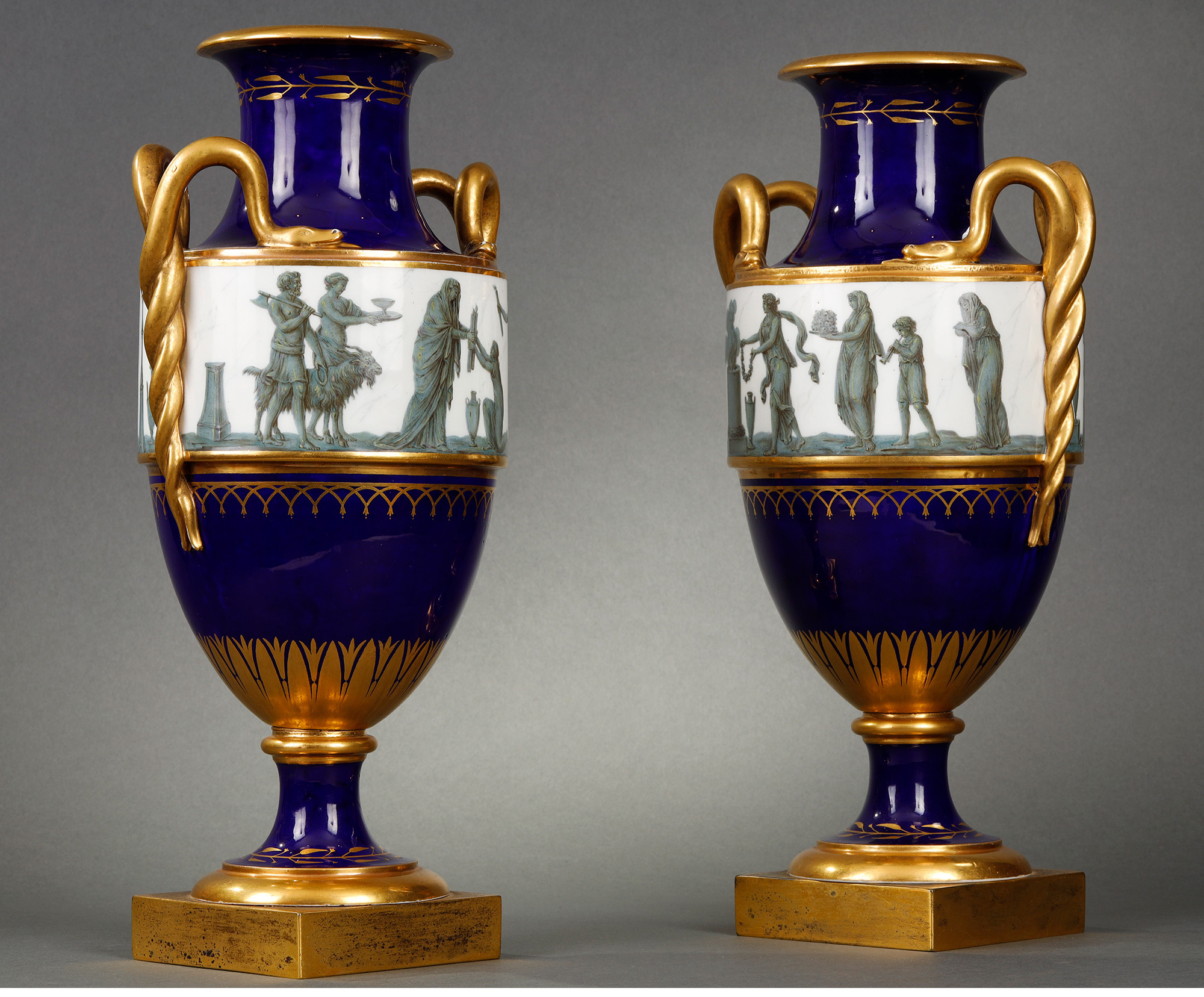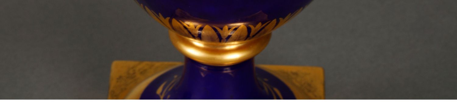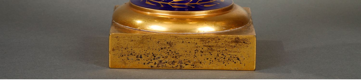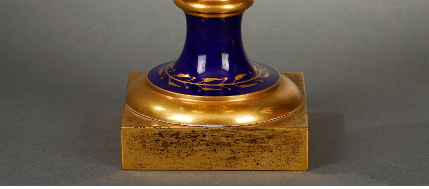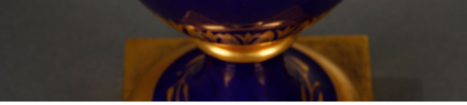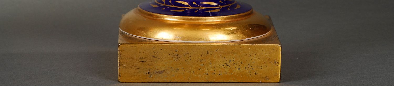 独角鹿西洋古董瓷器塞弗尔描金手绘古典神话祭火主题帝王蓝釉花瓶