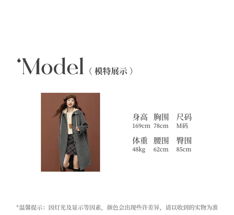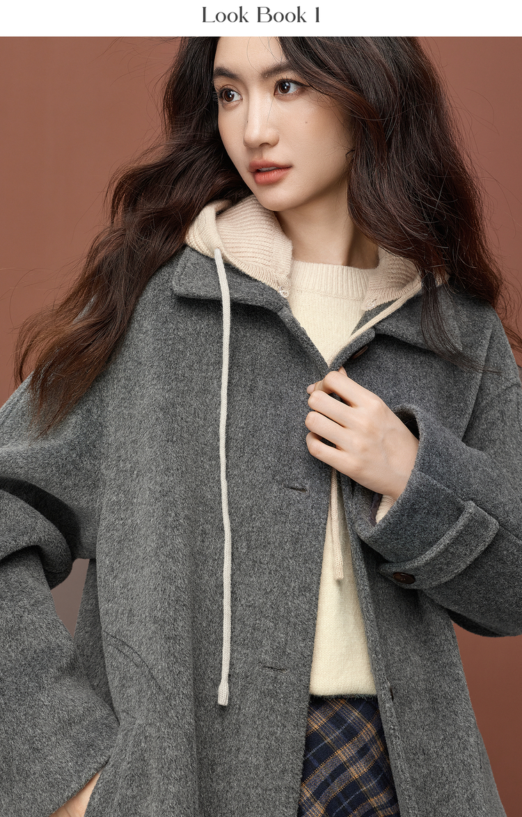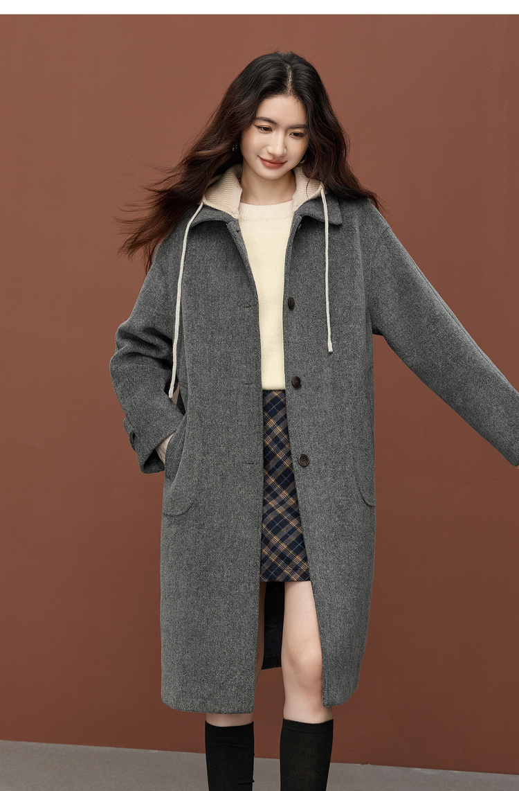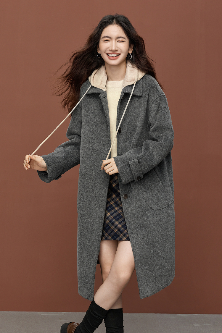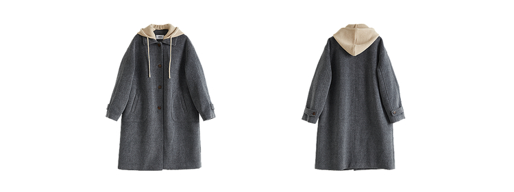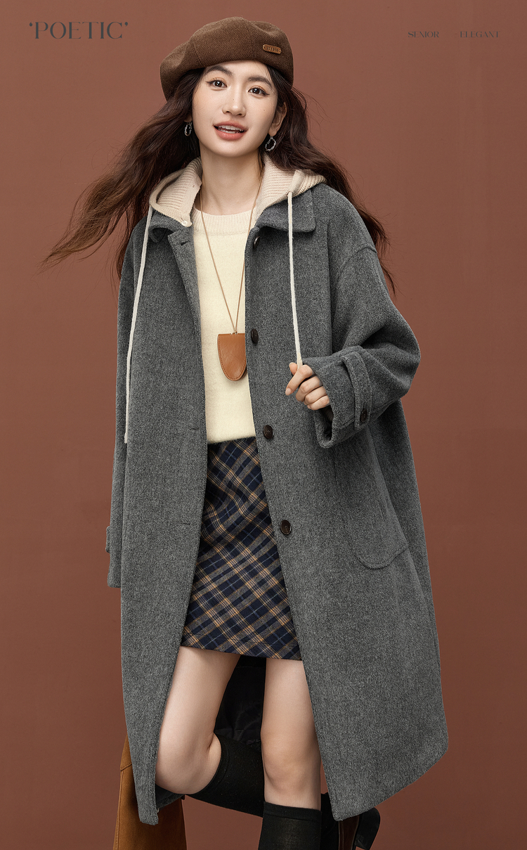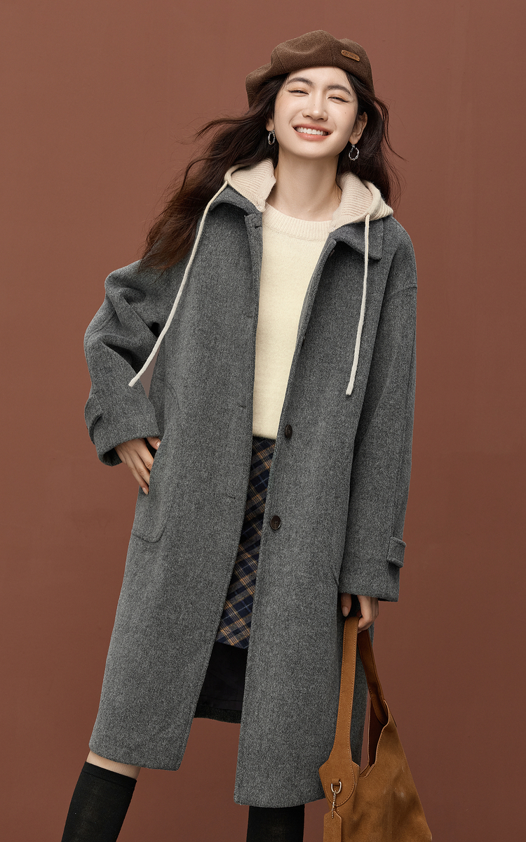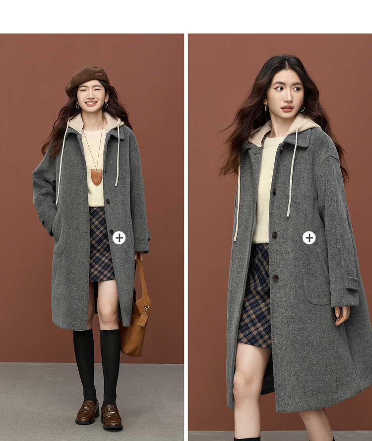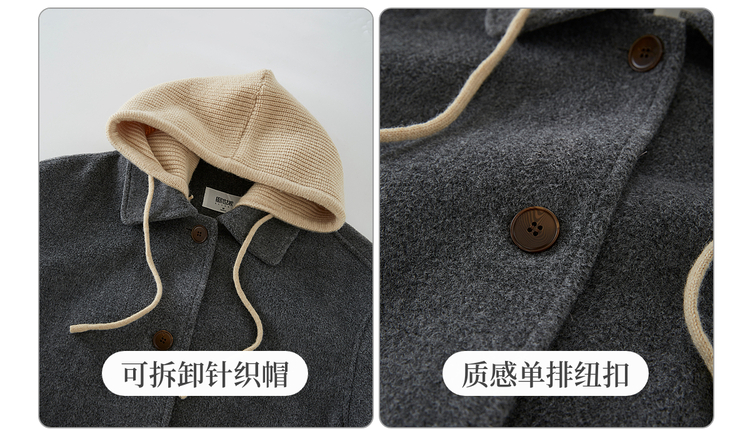 【11/26新品】熙世界可拆卸针织连帽毛呢大衣女2025冬季新款中长款羊毛呢子外套