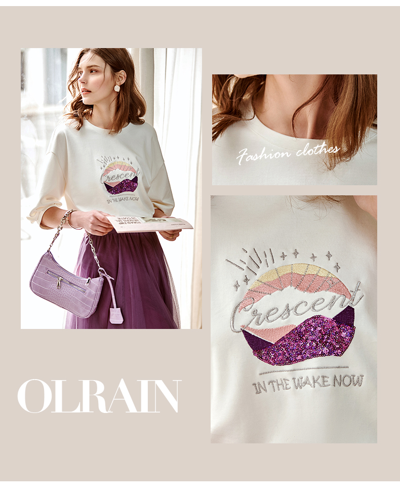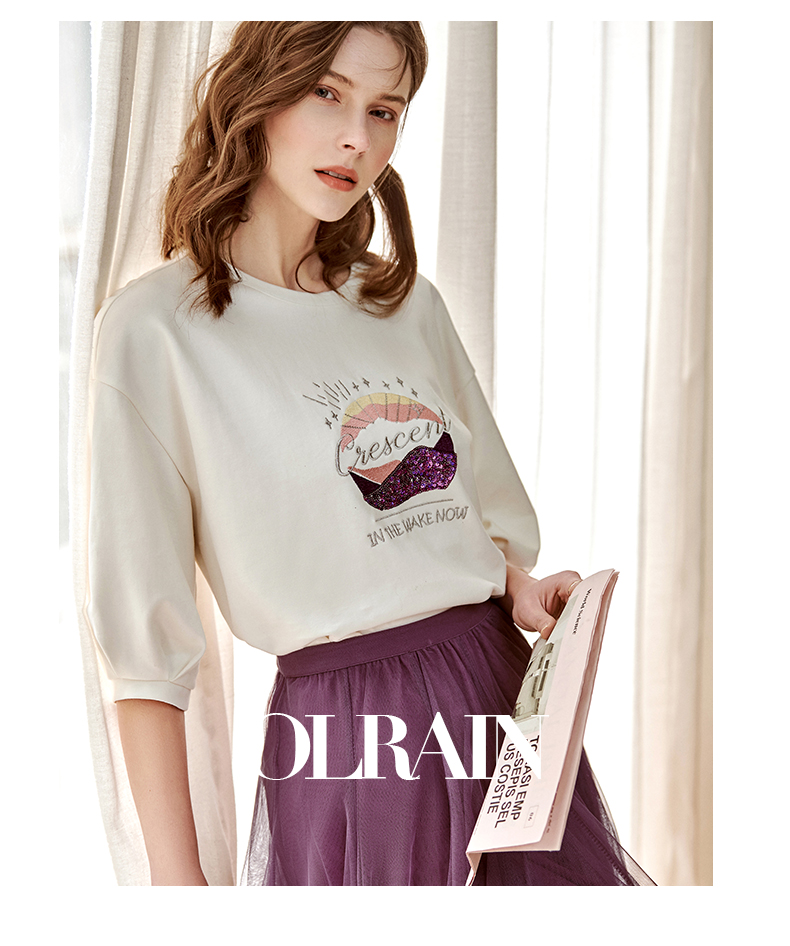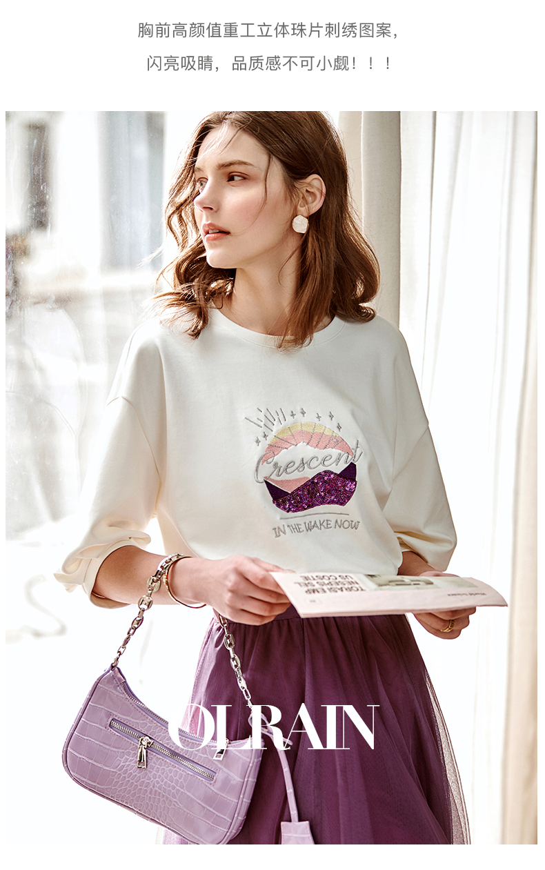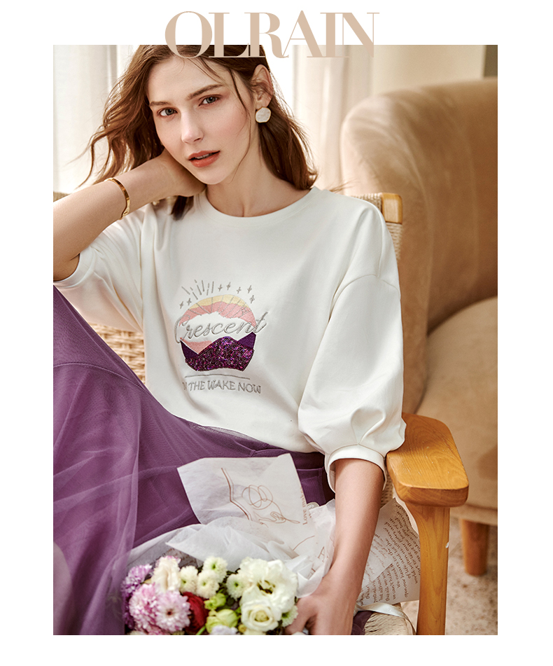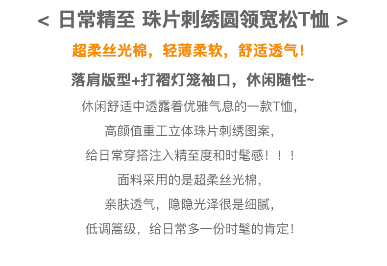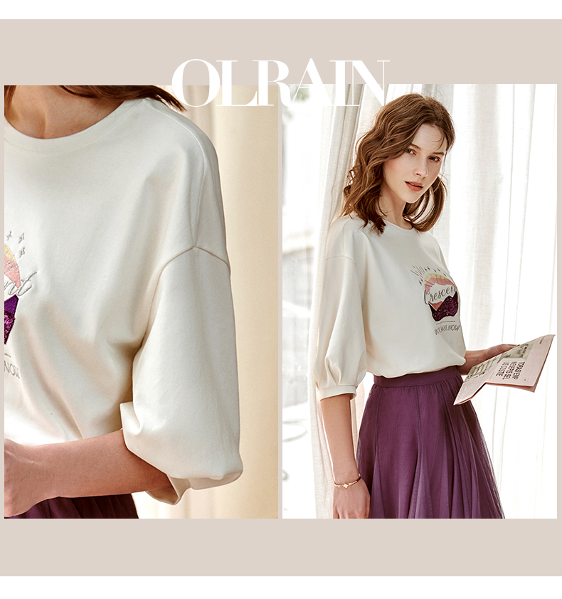 欧芮儿珠片刺绣t恤女2021年新款灯笼袖休闲宽松气质时髦优雅上衣