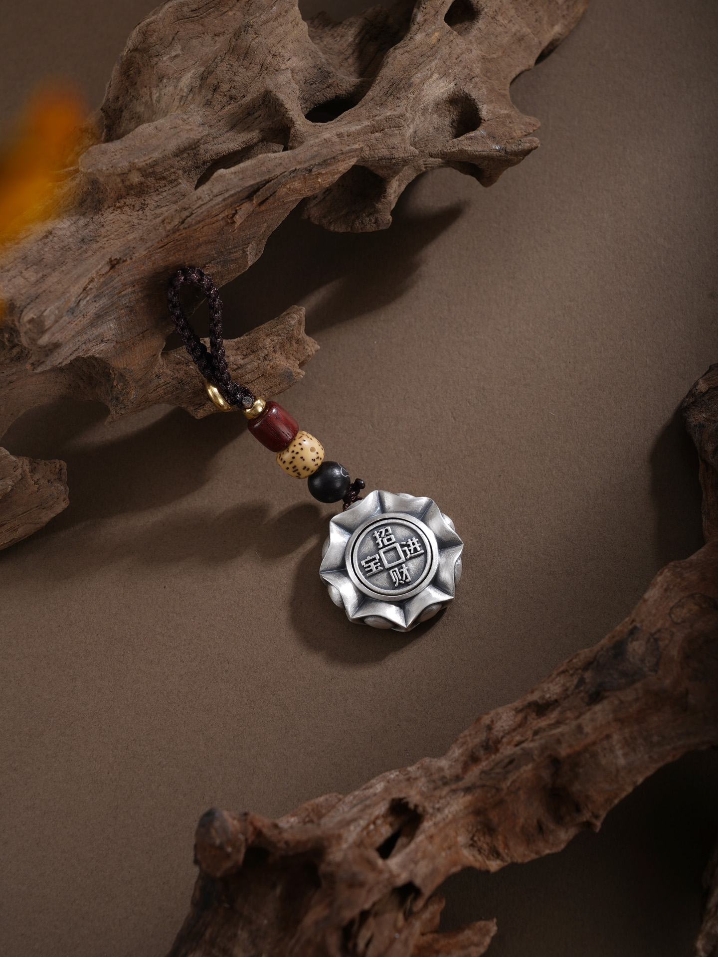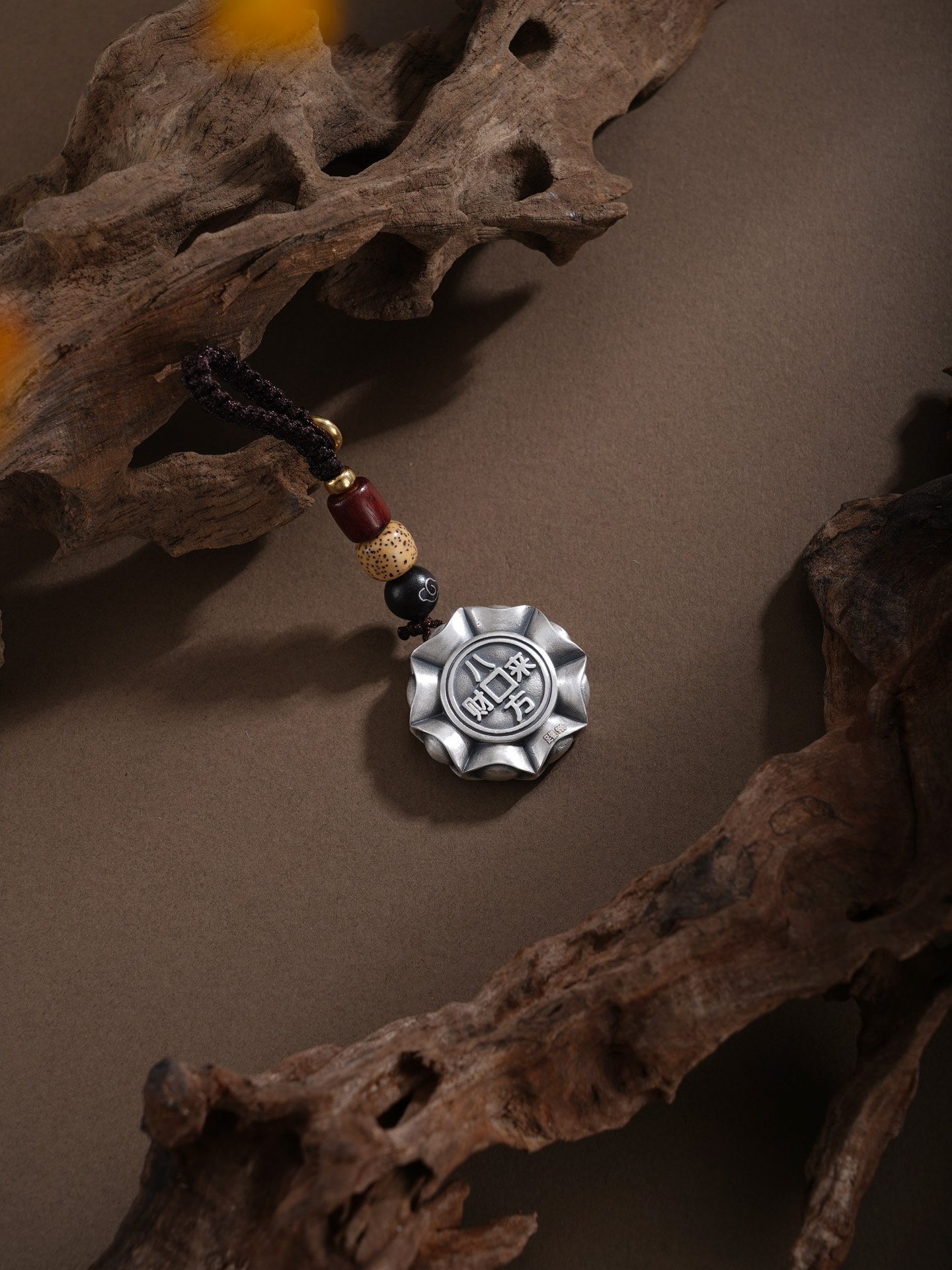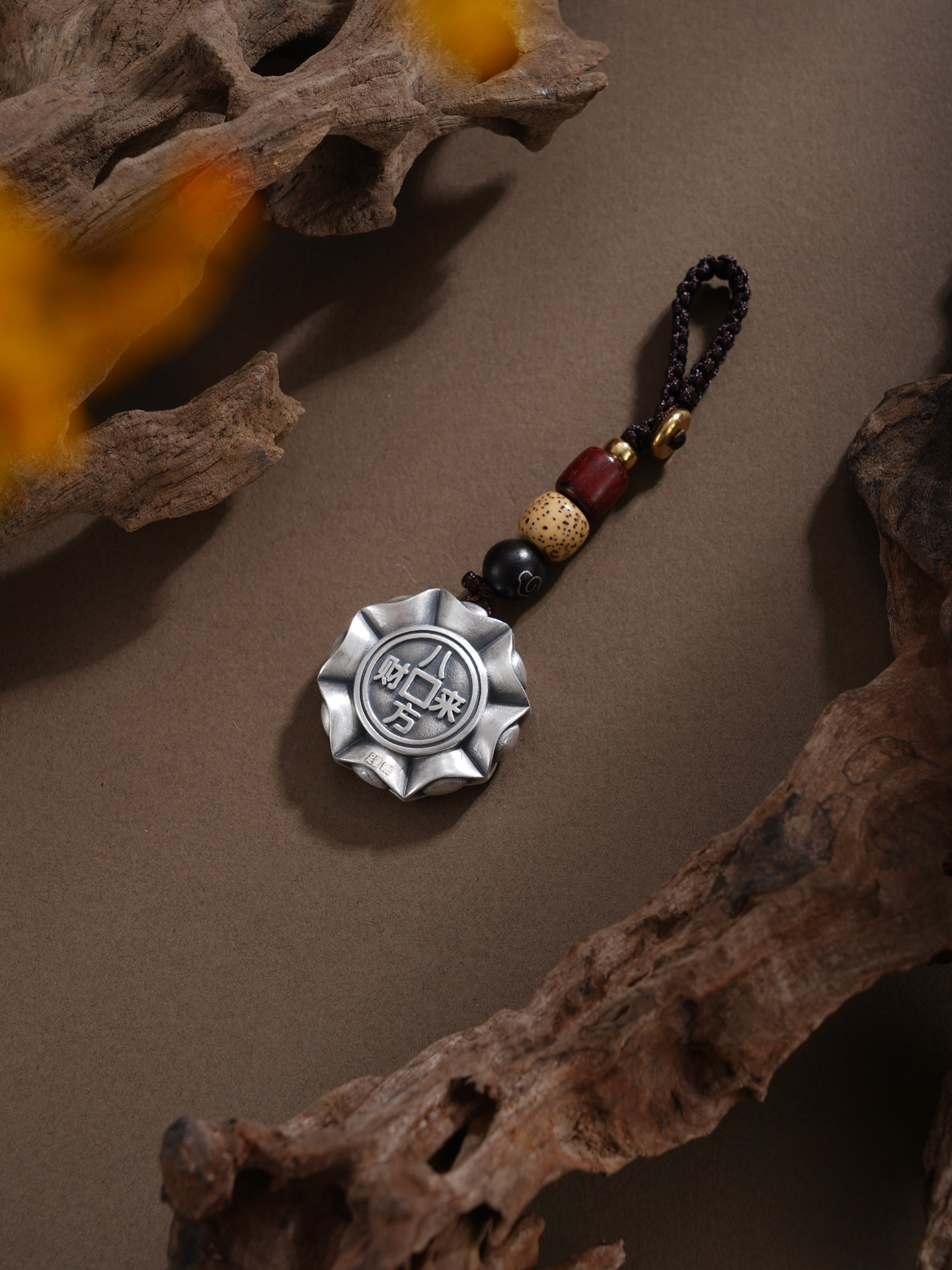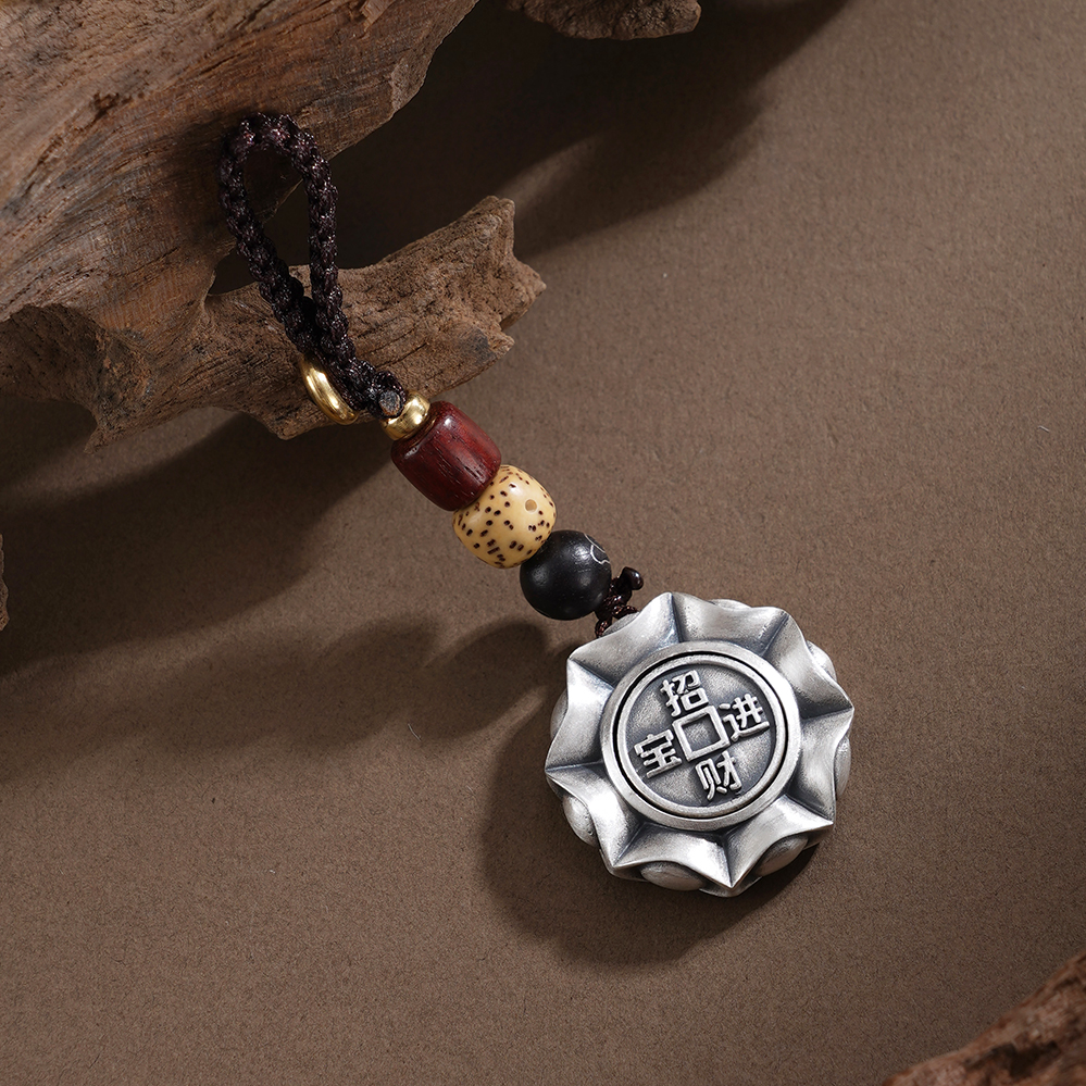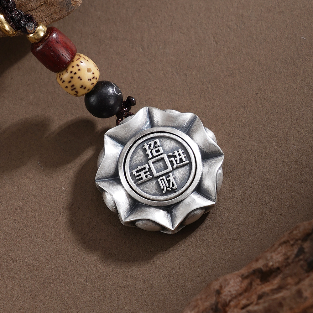 【寓意】:以纯银塑手把件,形似罗盘,中嵌可转铜钱,雕“八方来财”纹样,暗合天地循环之理。转动间,寓意财气通达、机遇随行。