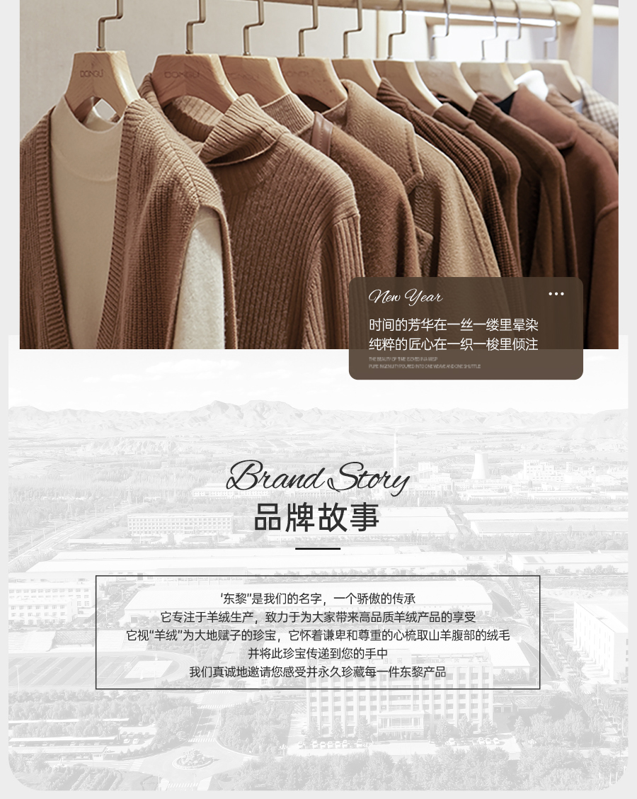 东黎羊绒是赤峰东荣集团自主品牌,自有牧场/羊绒制品全产业链优势,实现了羊绒从“牧场”到“商场”的华丽转变。