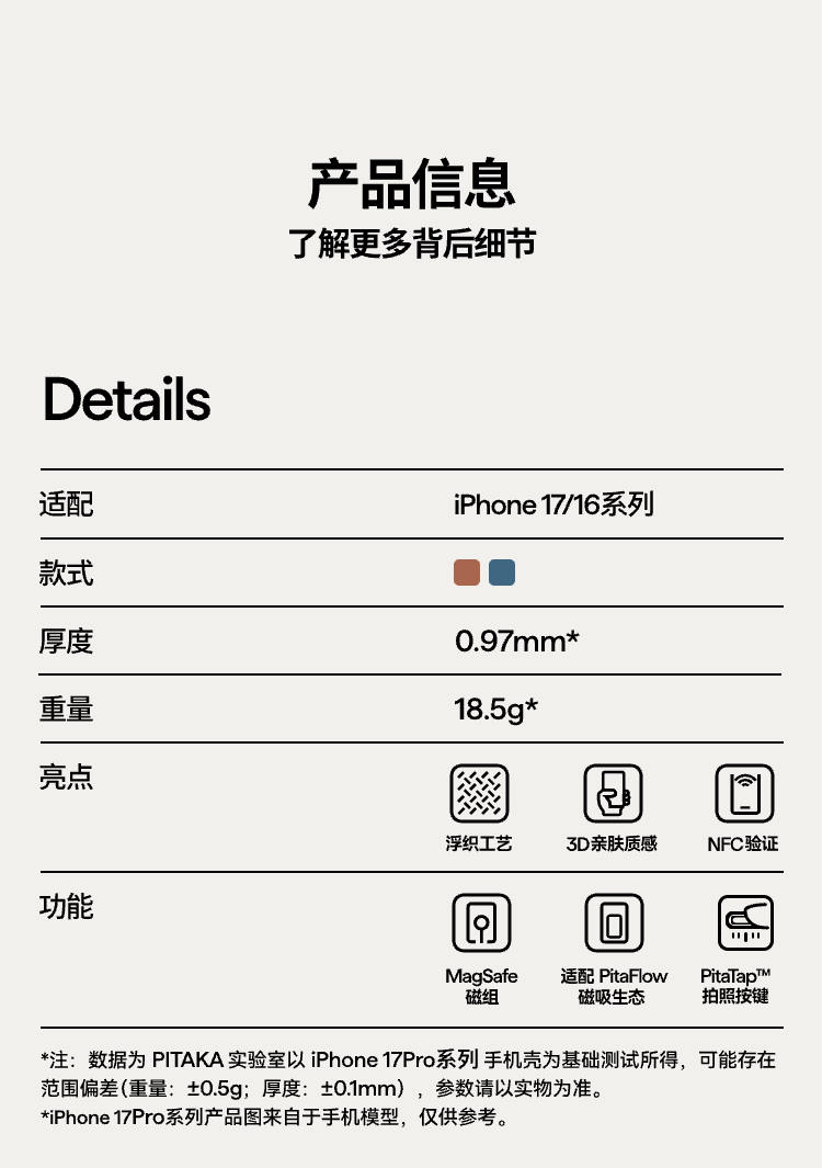 PITAKA/皮塔卡 iPhone 17 手机壳 凯夫拉磁吸相机按键碳纤维纹Air保护壳