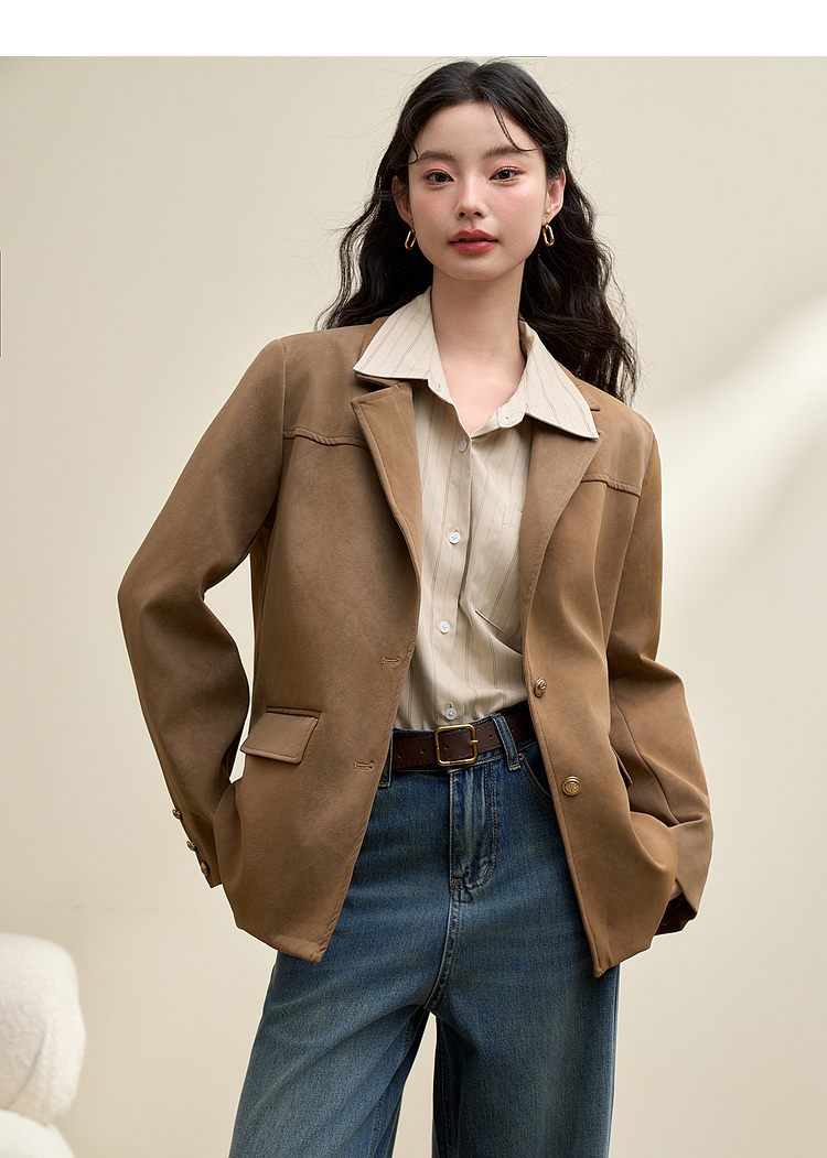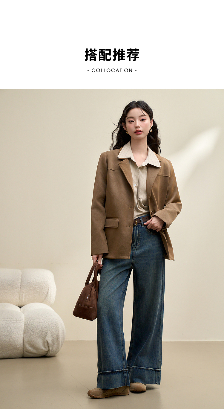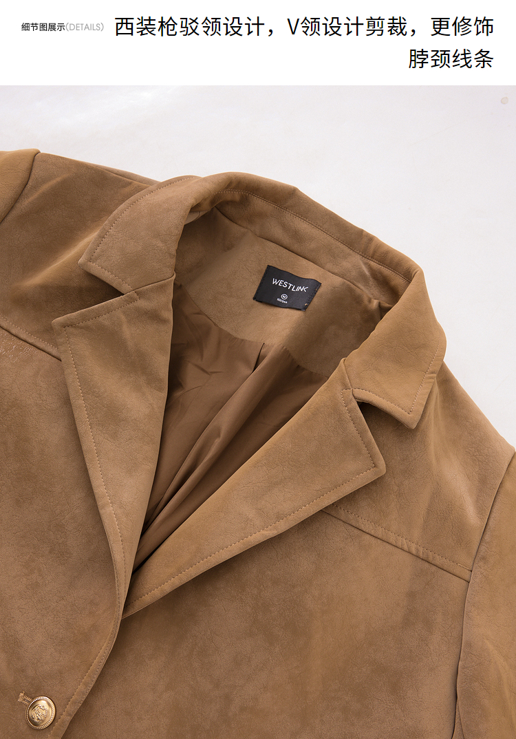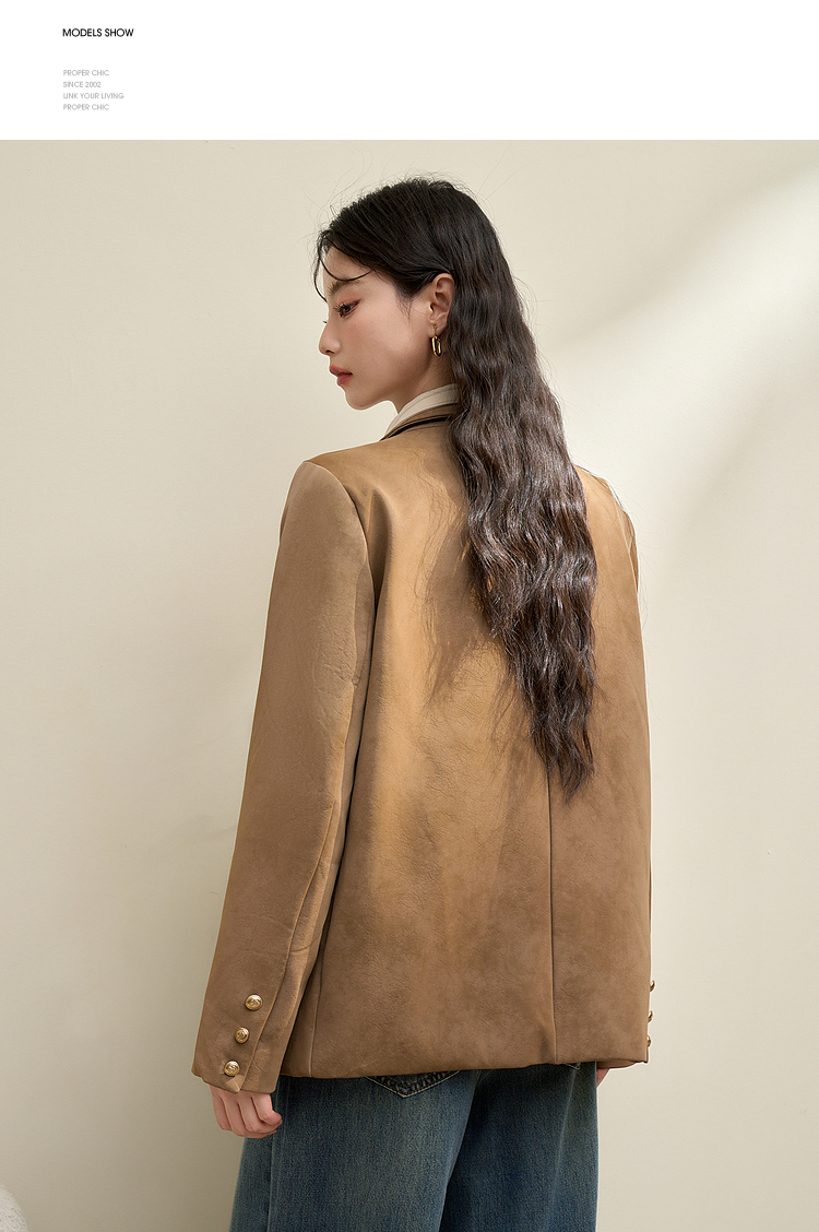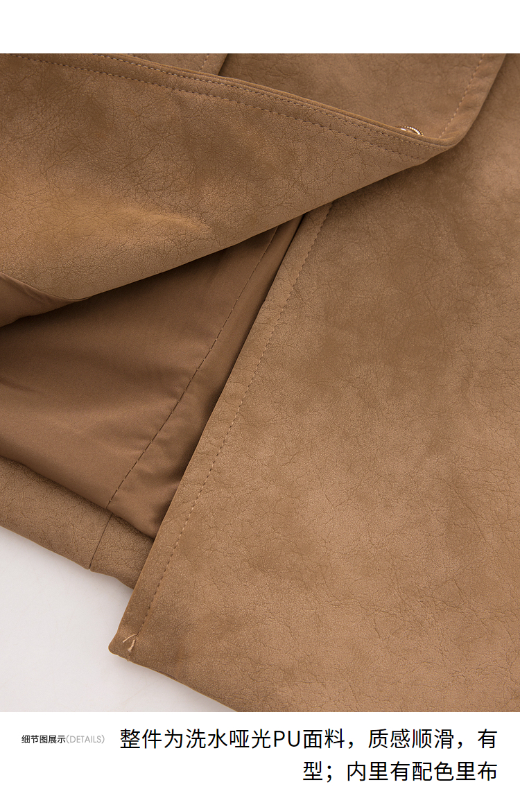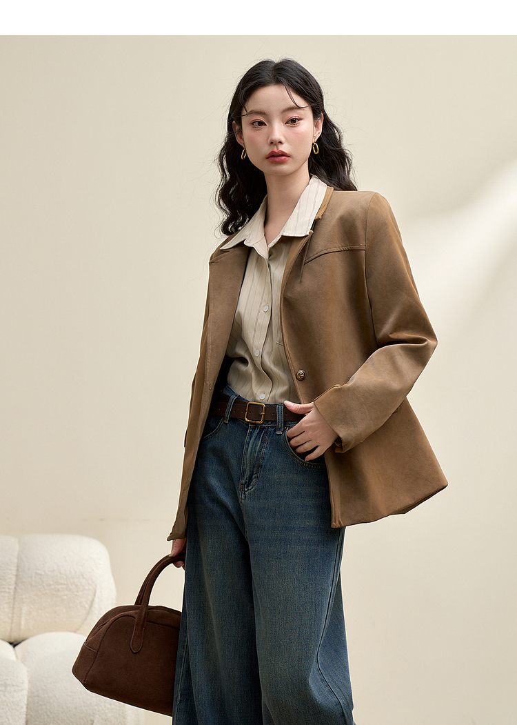 复古经典简约枪驳领宽肩西装外套女秋冬洗水哑光PU上衣V3642525