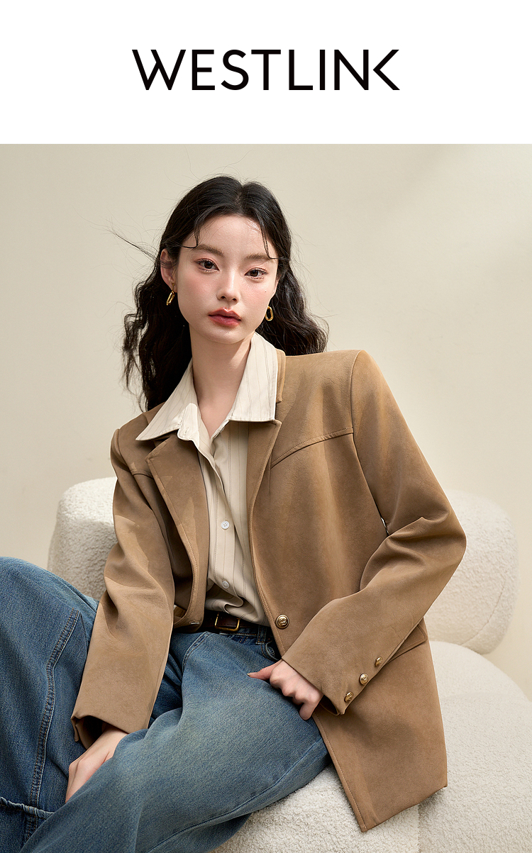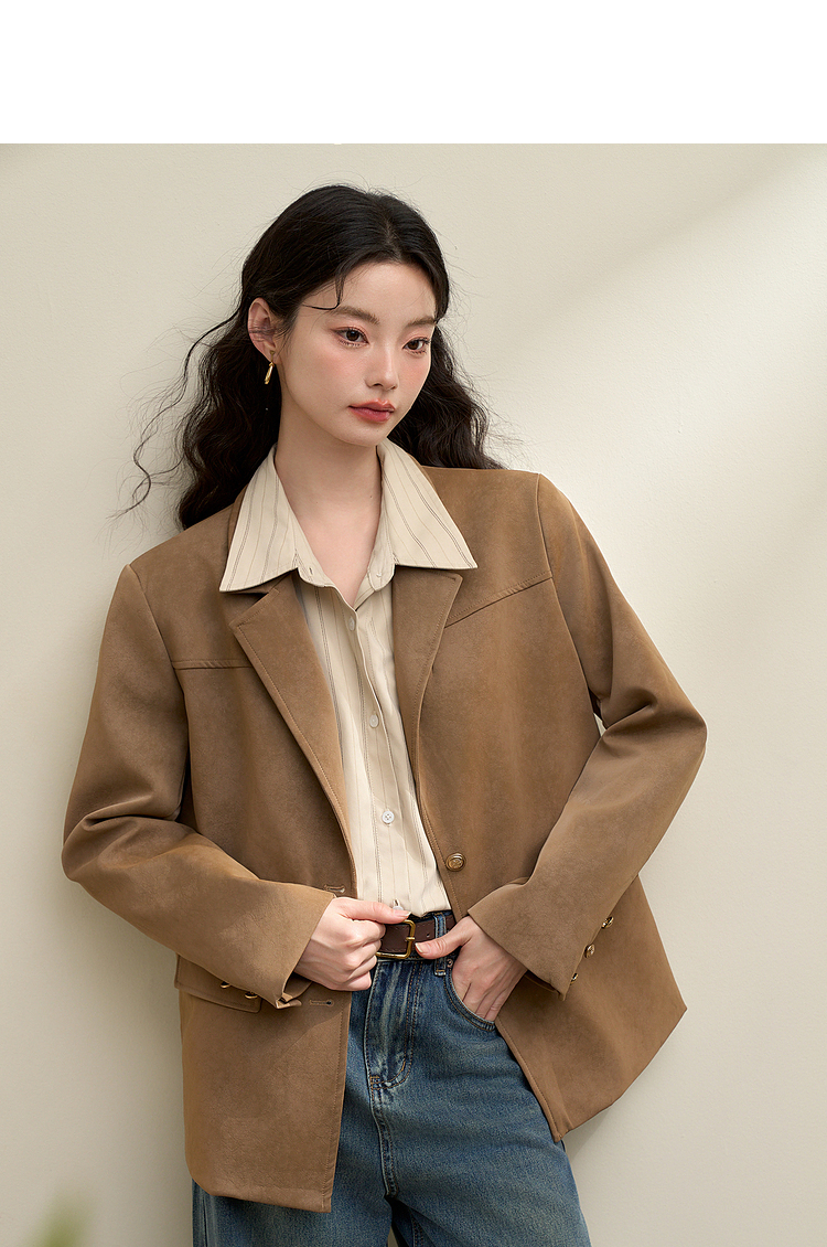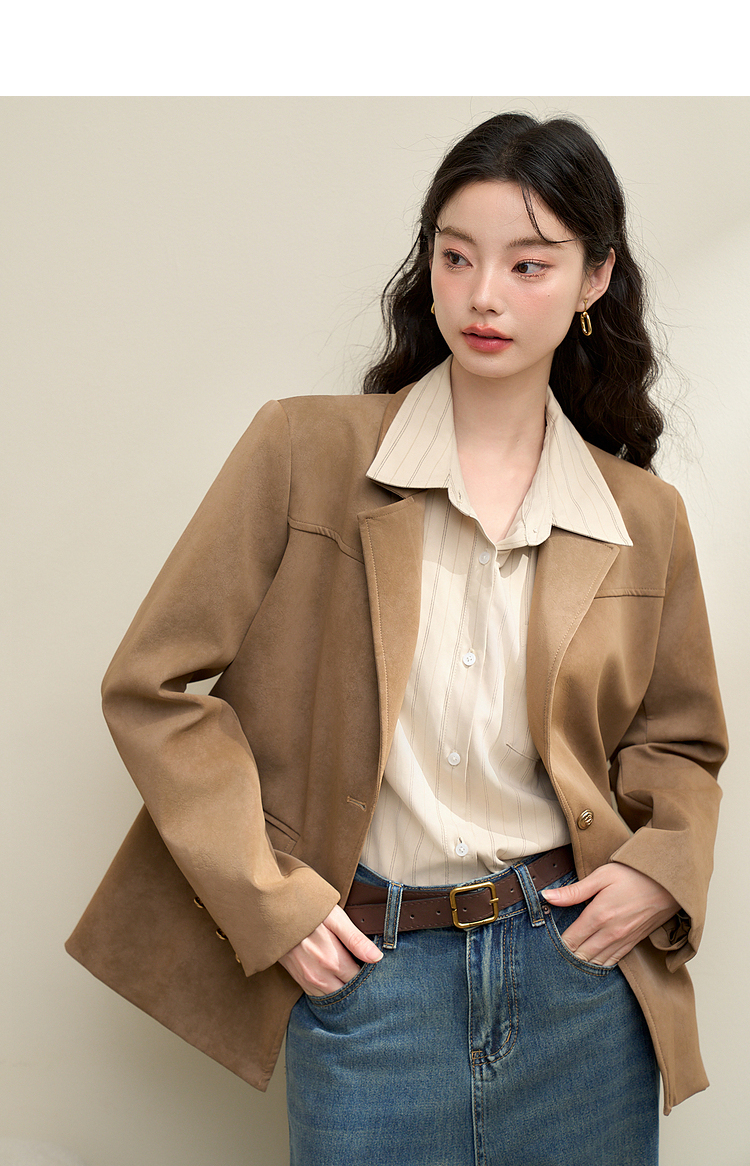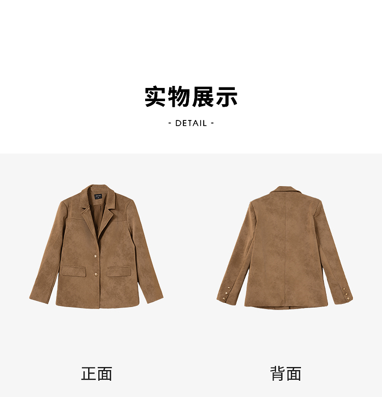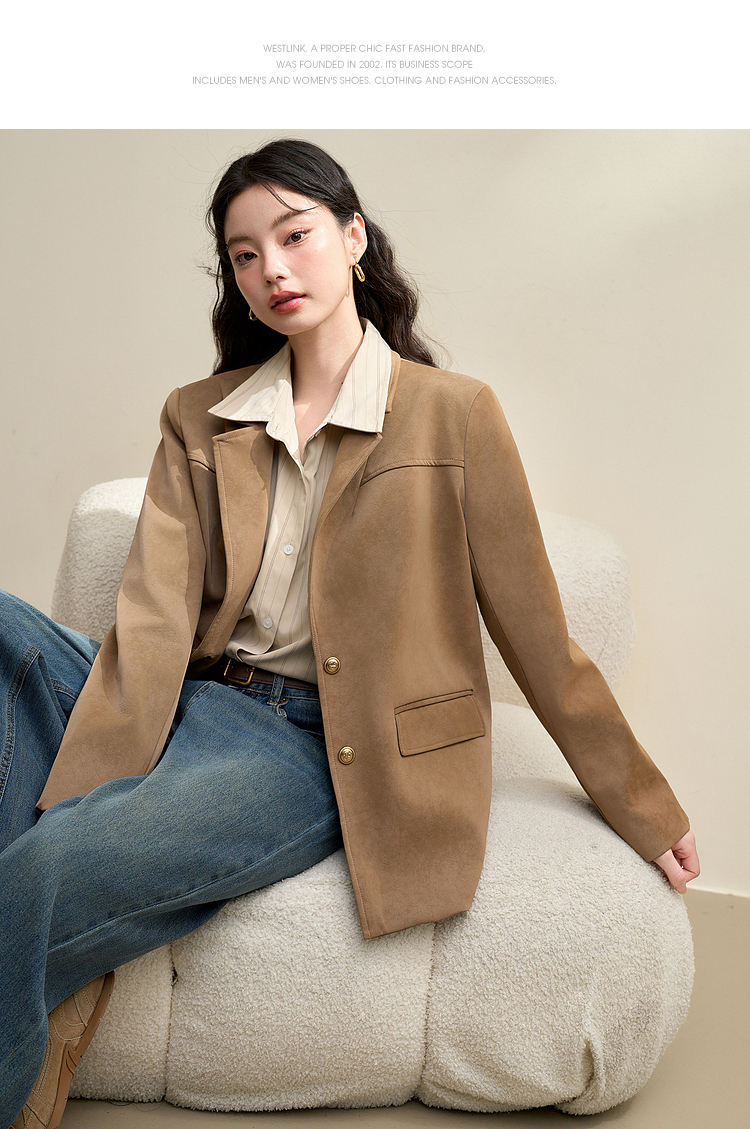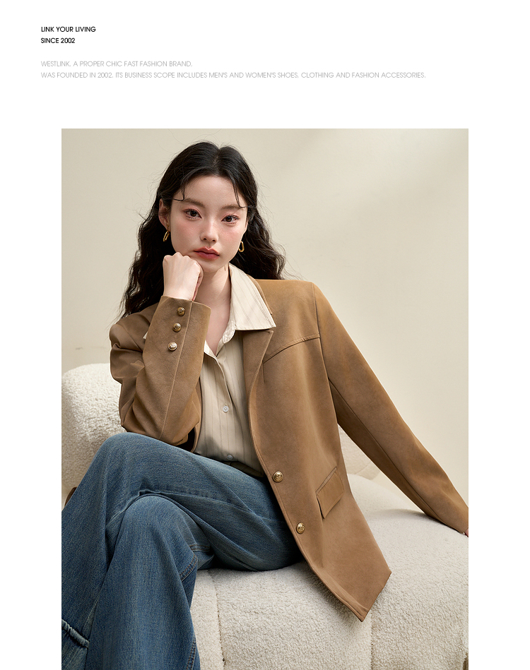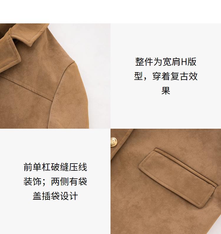 复古经典简约枪驳领宽肩西装外套女秋冬洗水哑光PU上衣V3642525