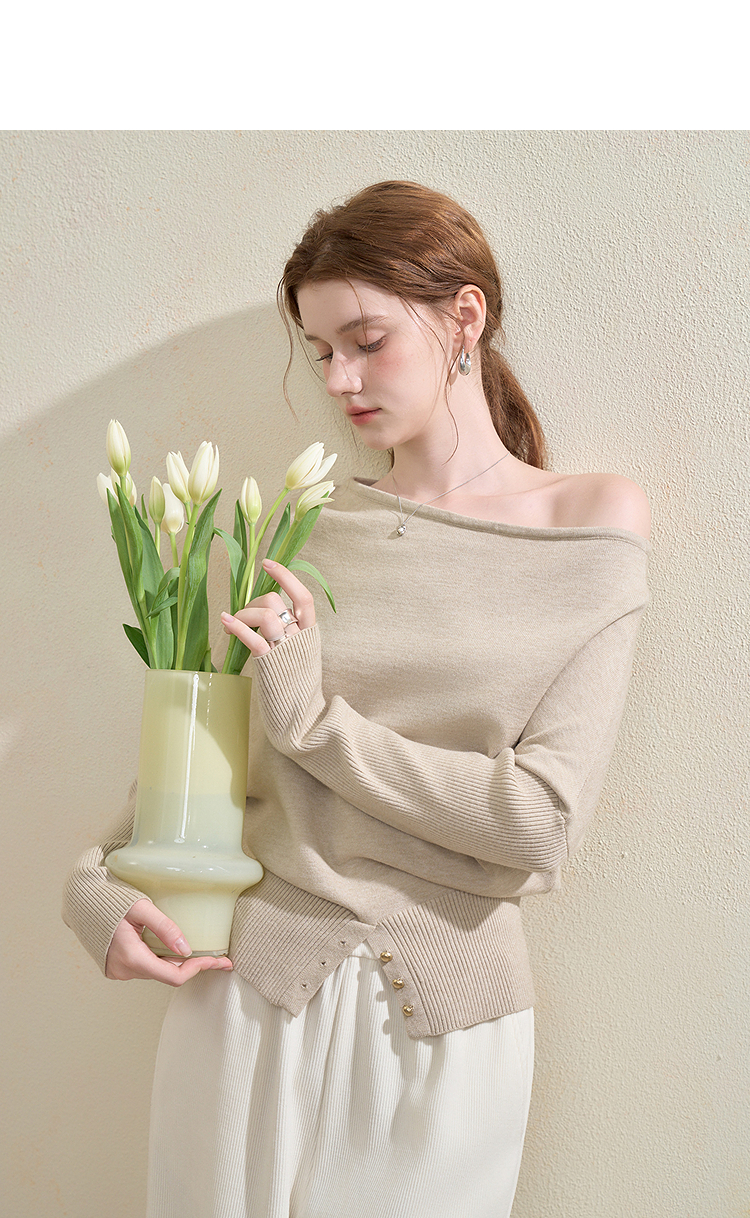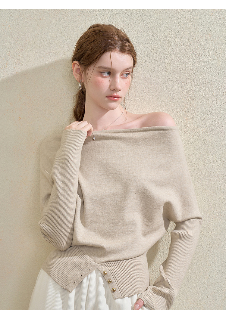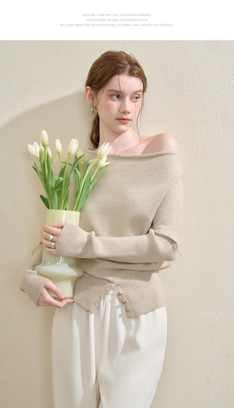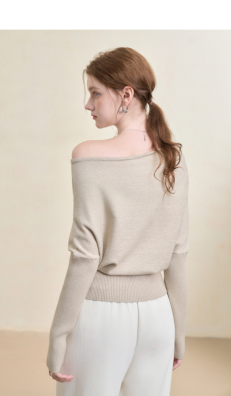 西遇气质露肩针织衫女2025秋季新款开叉下摆设计感斜肩收腰毛衣V3355194