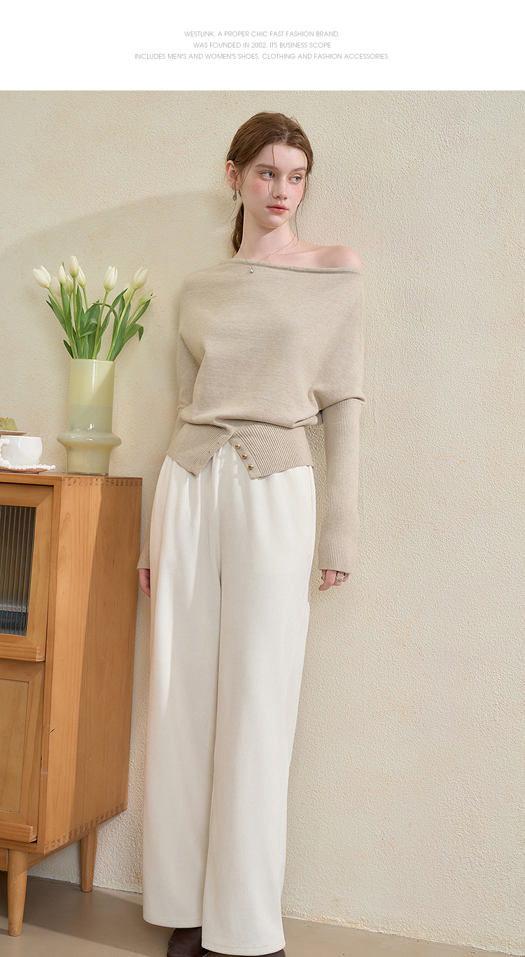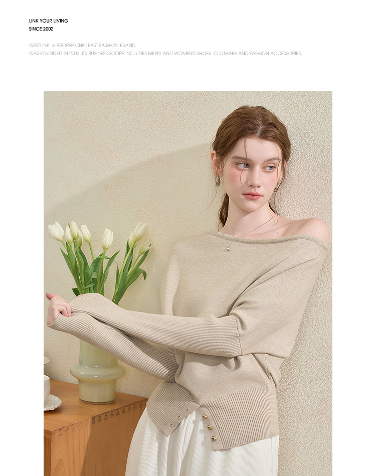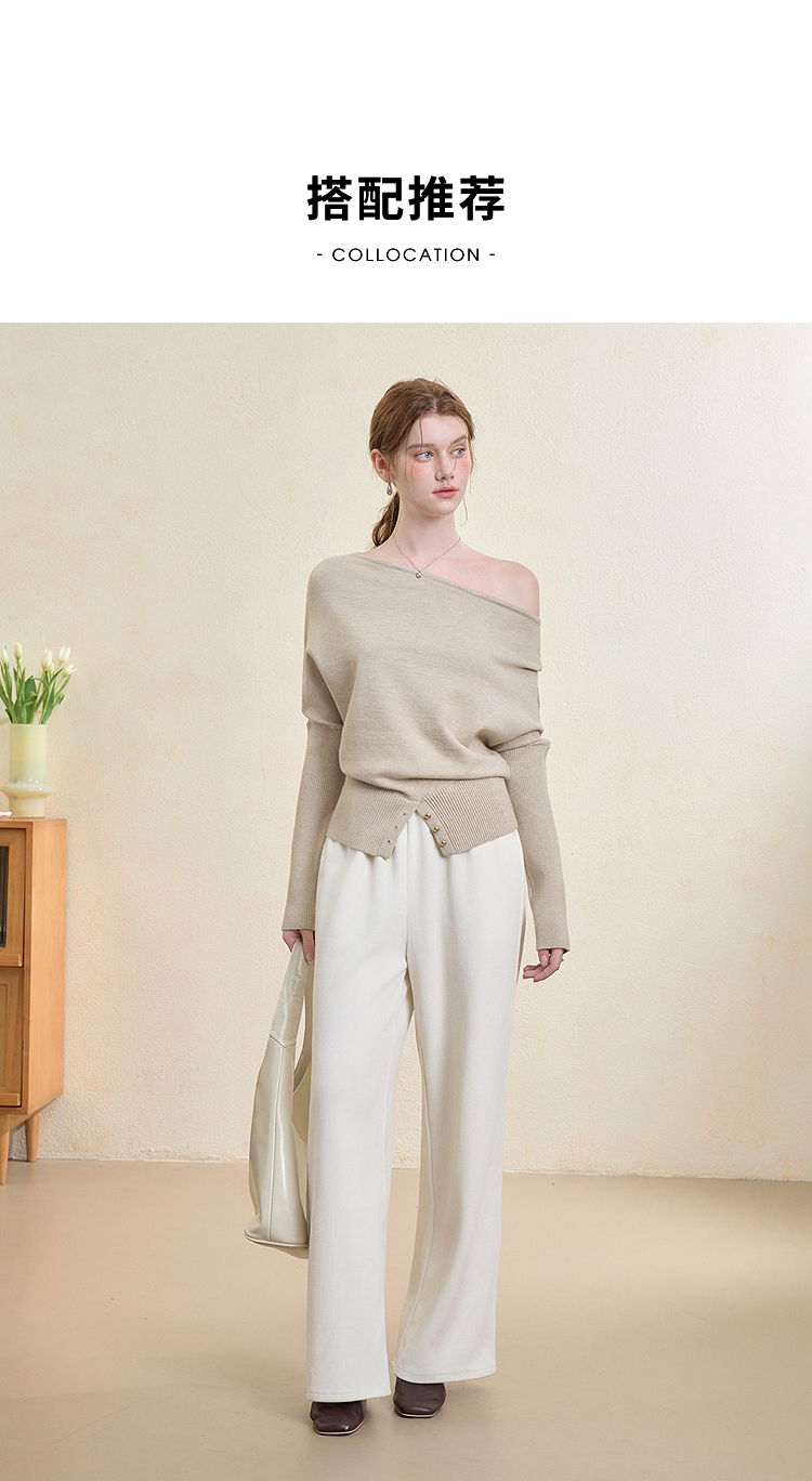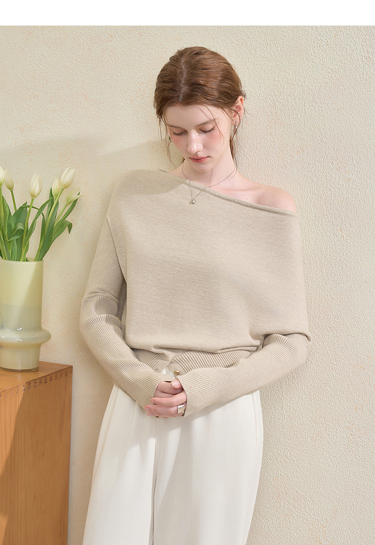 西遇气质露肩针织衫女2025秋季新款开叉下摆设计感斜肩收腰毛衣V3355194
