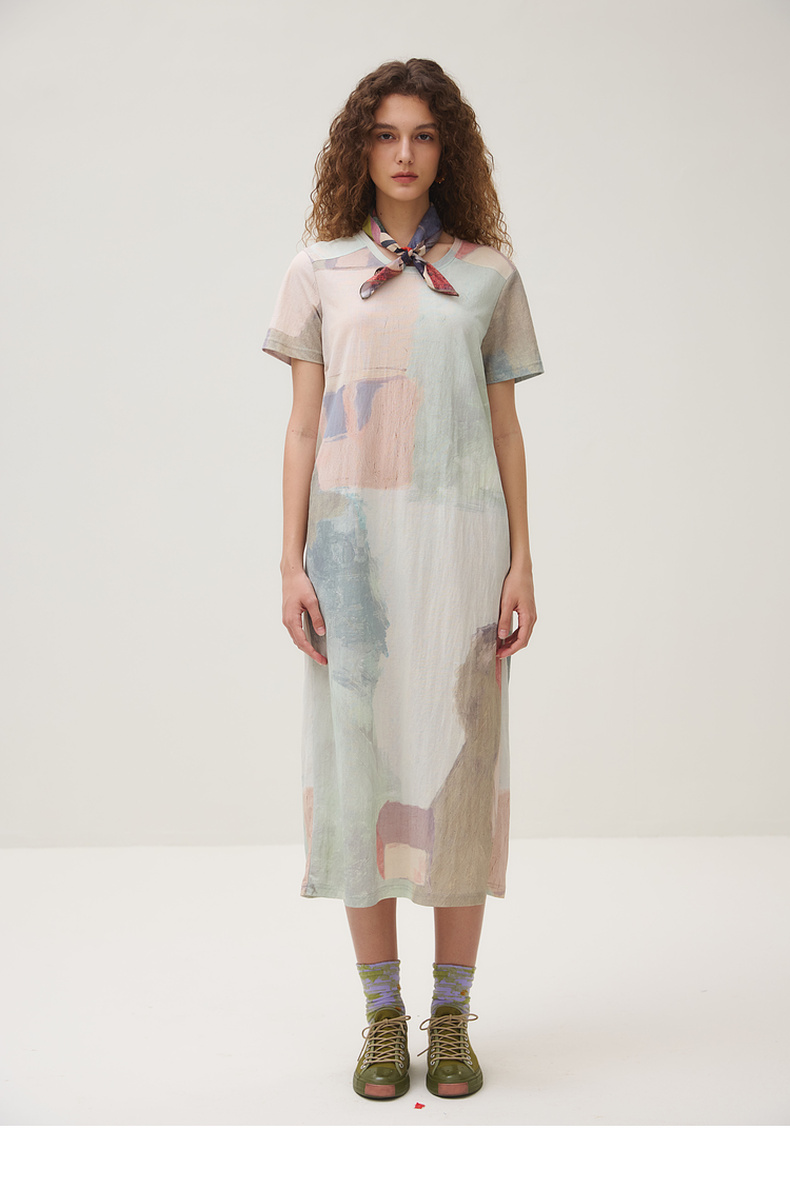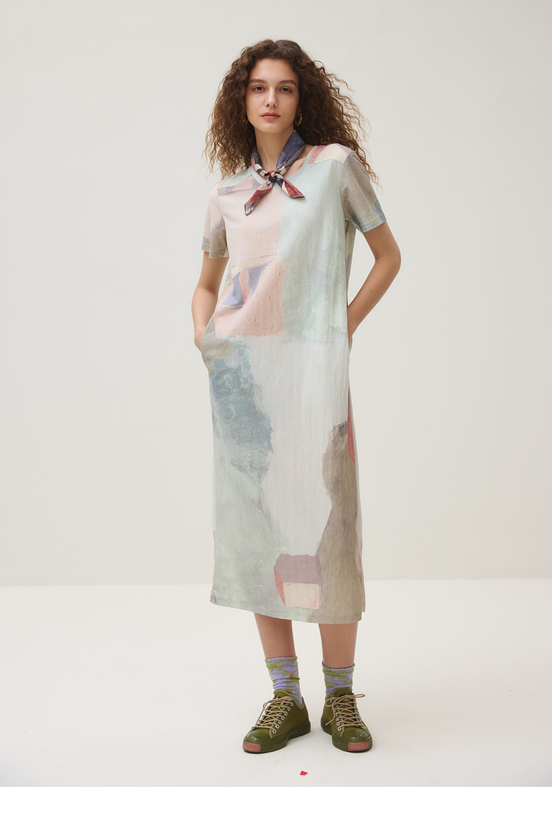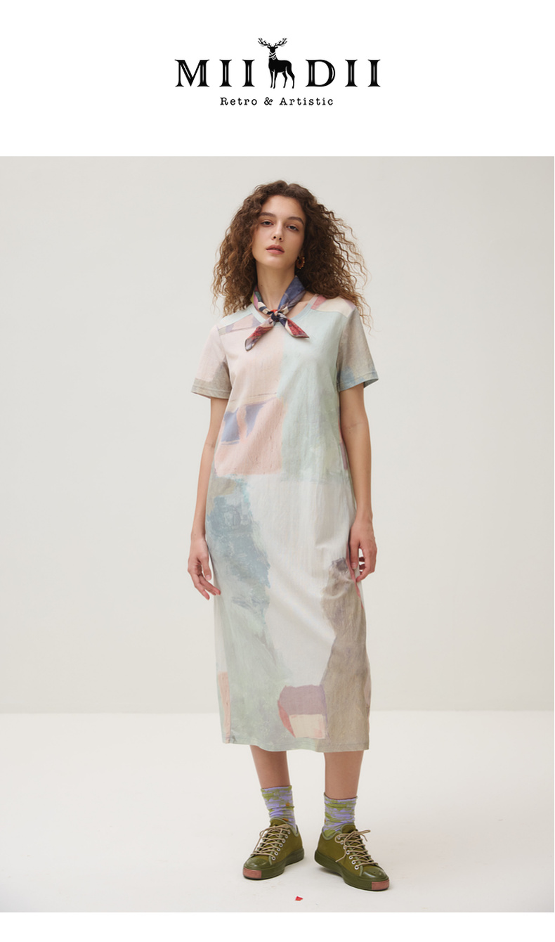 谜底连衣裙短袖女2025秋新品原创艺术印花H型T恤裙长裙253ML1240