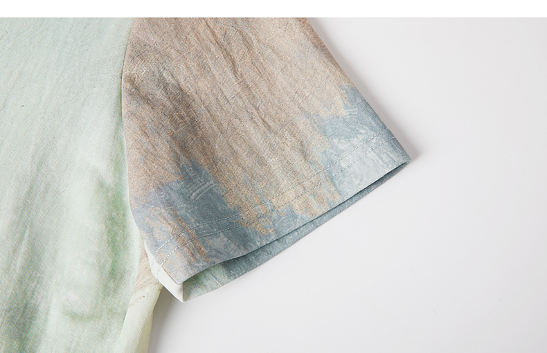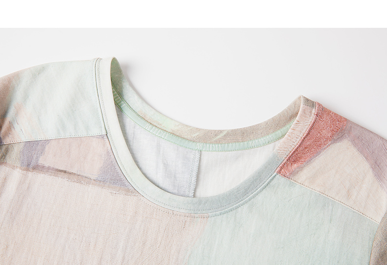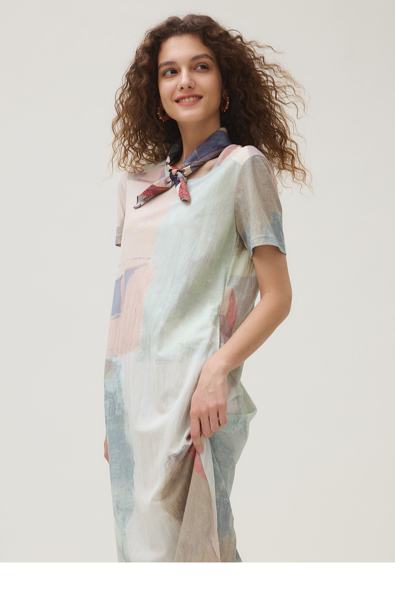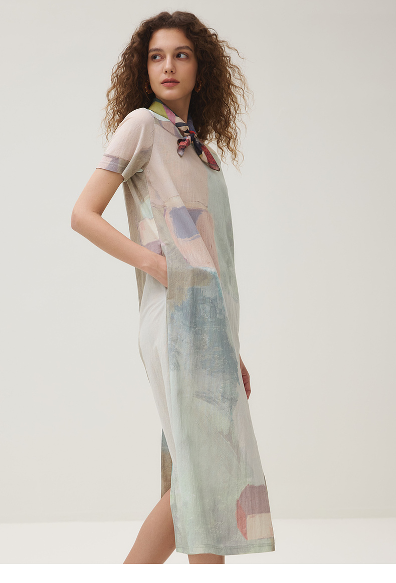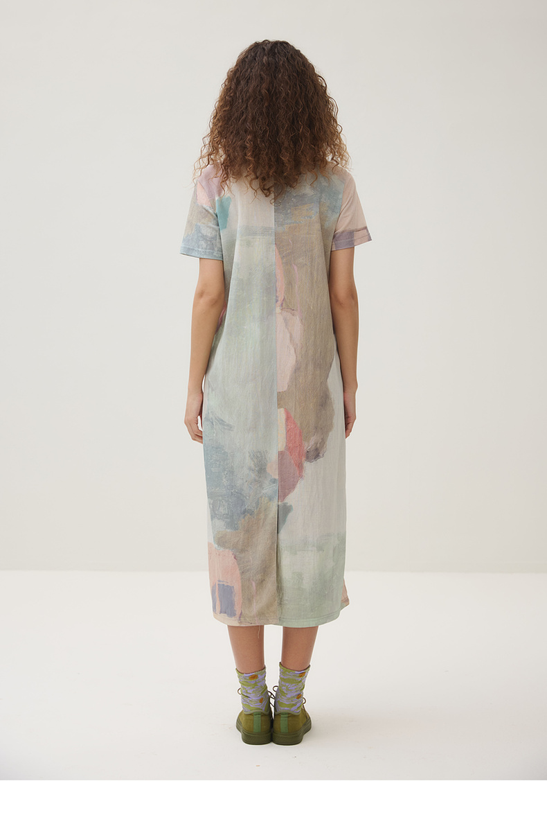 谜底连衣裙短袖女2025秋新品原创艺术印花H型T恤裙长裙253ML1240