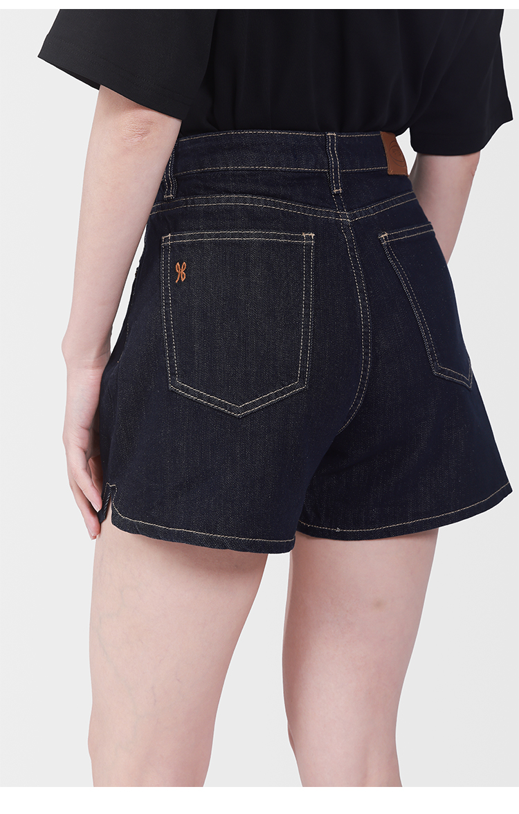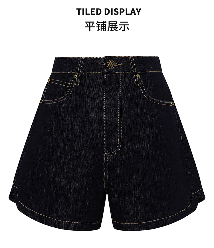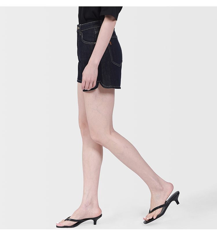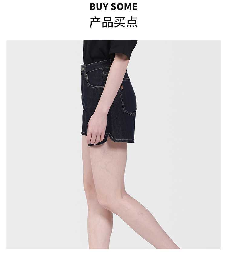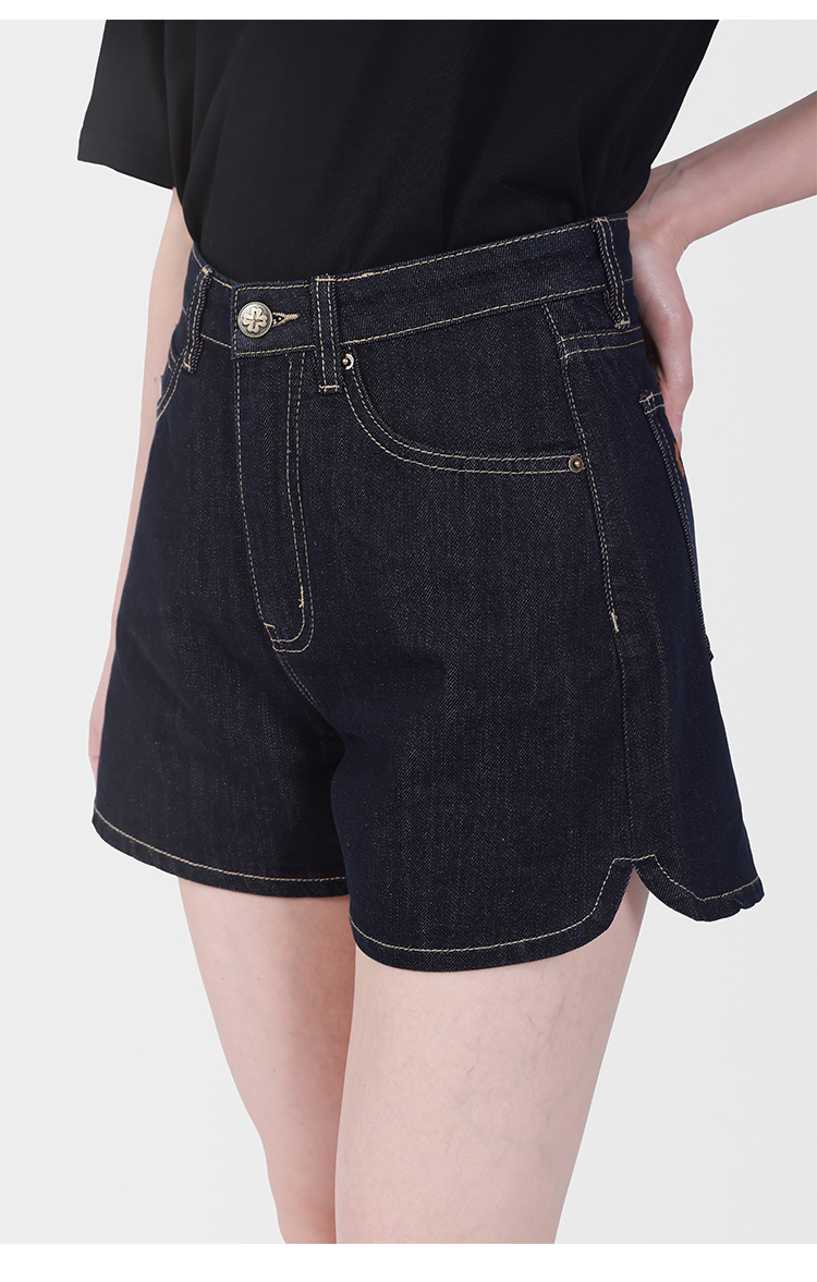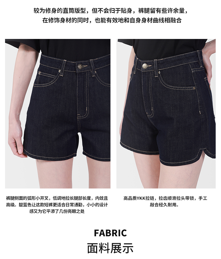 【2件9折】【Petit Bari】弧形开衩修身显瘦牛仔短裤 百搭 高腰深蓝色