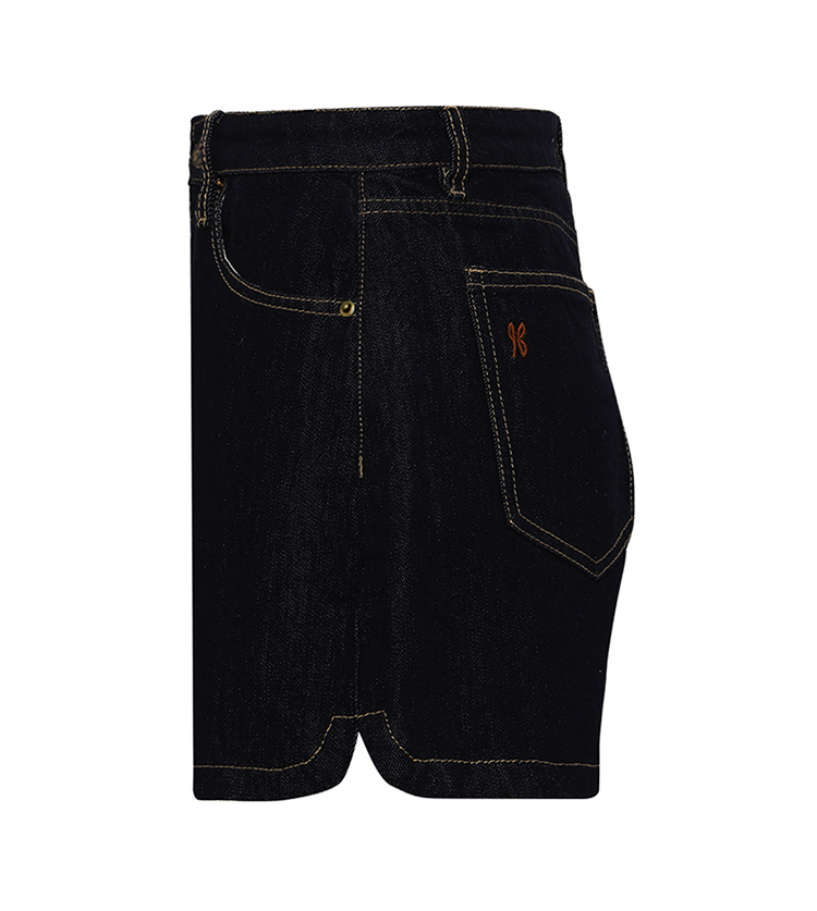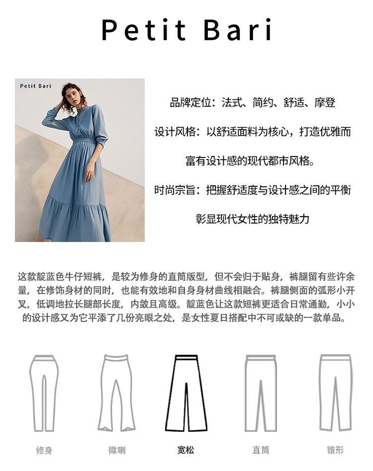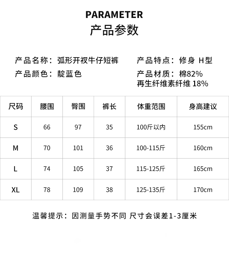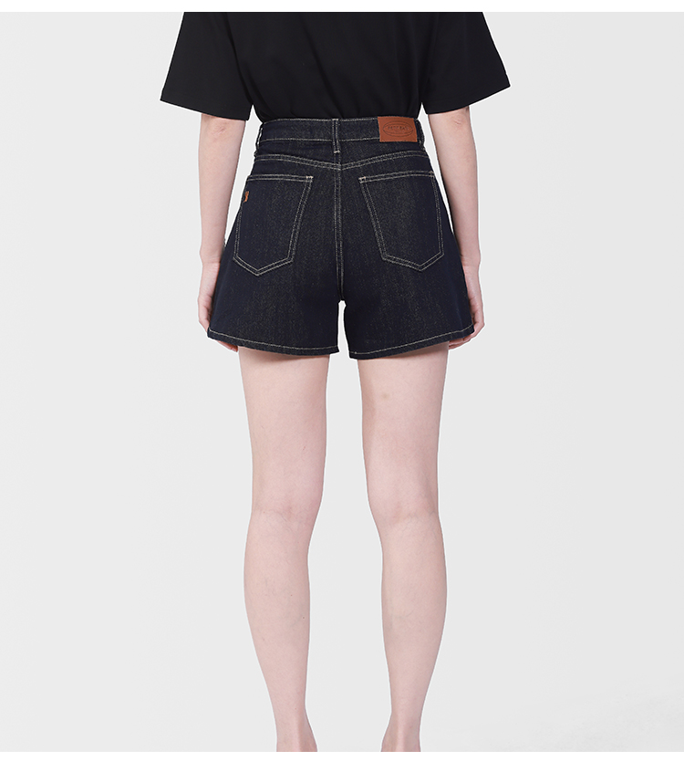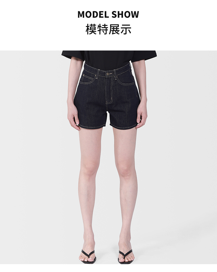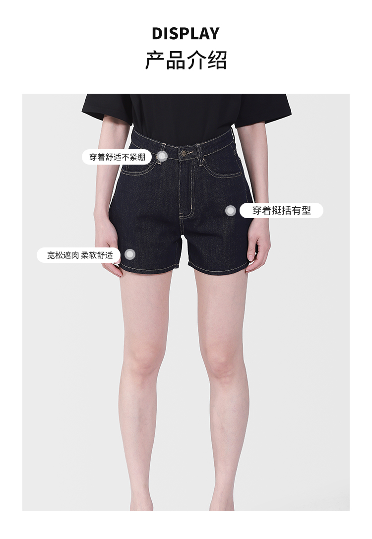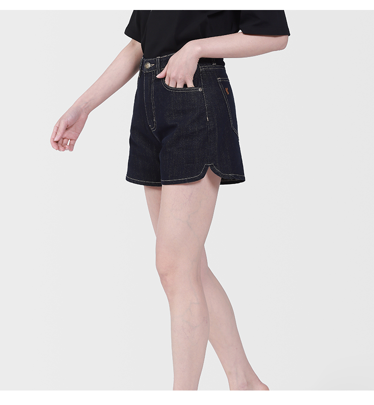 【2件9折】【Petit Bari】弧形开衩修身显瘦牛仔短裤 百搭 高腰深蓝色