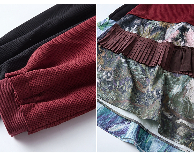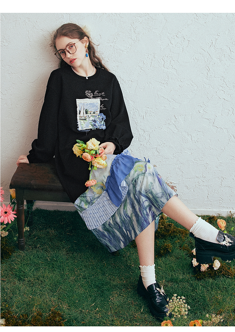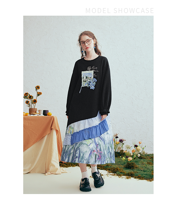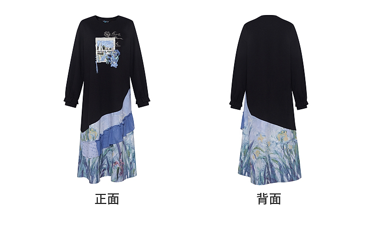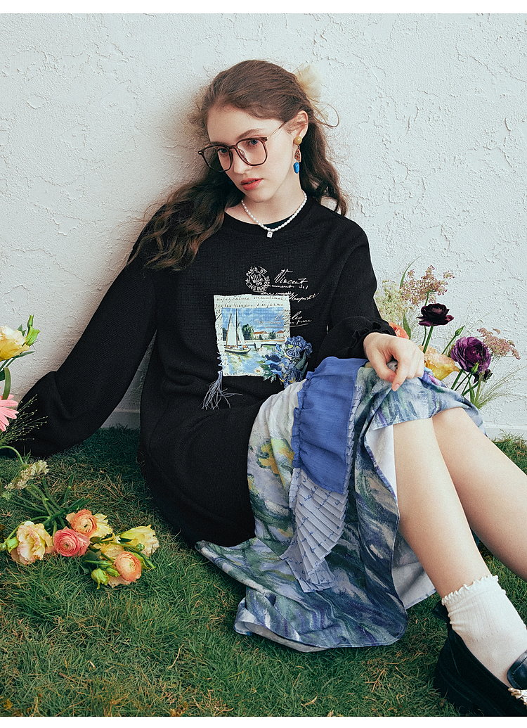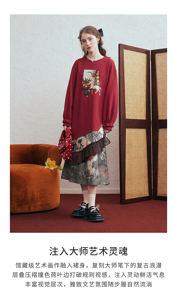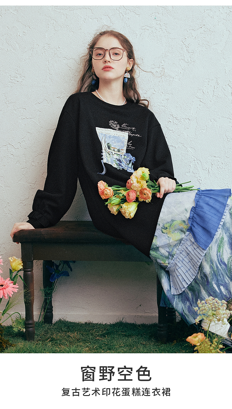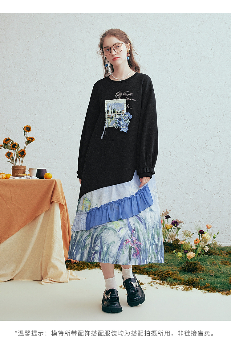 两三事梵高文艺 窗野空色 2026春季新款印花荷叶边裙摆拼接连衣裙