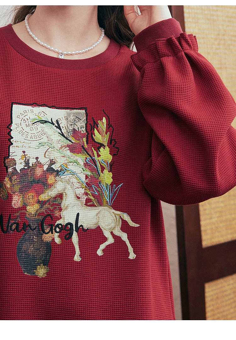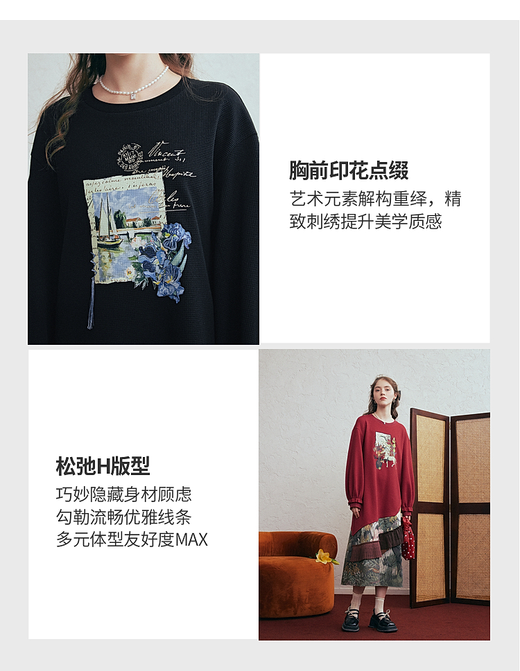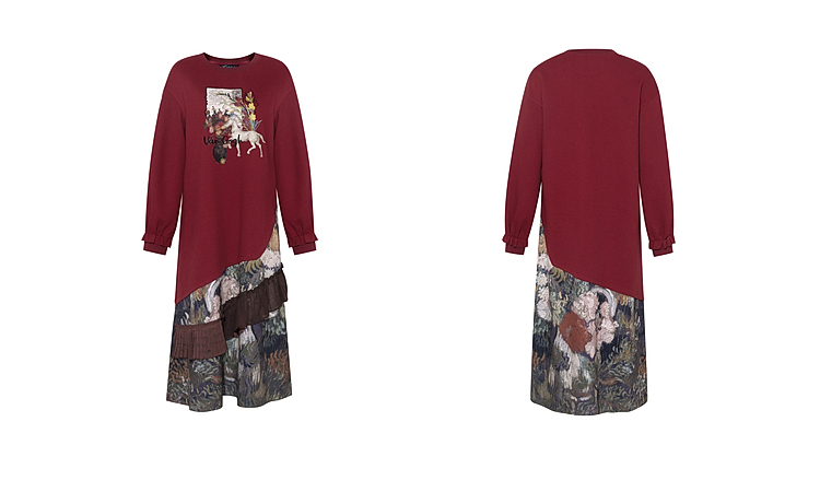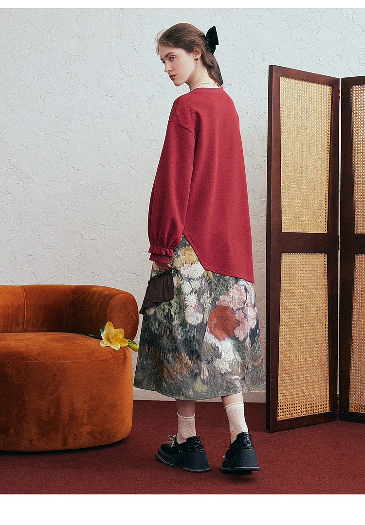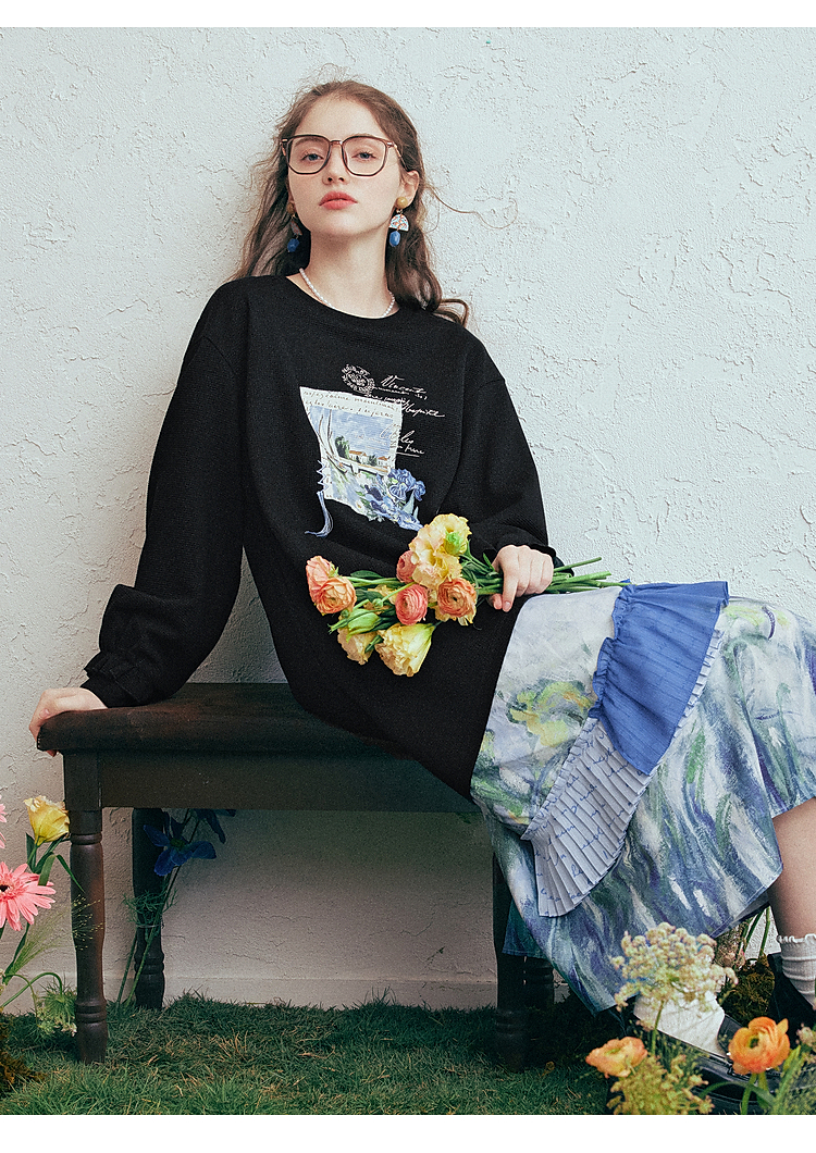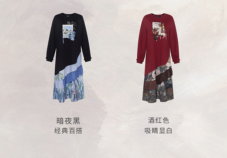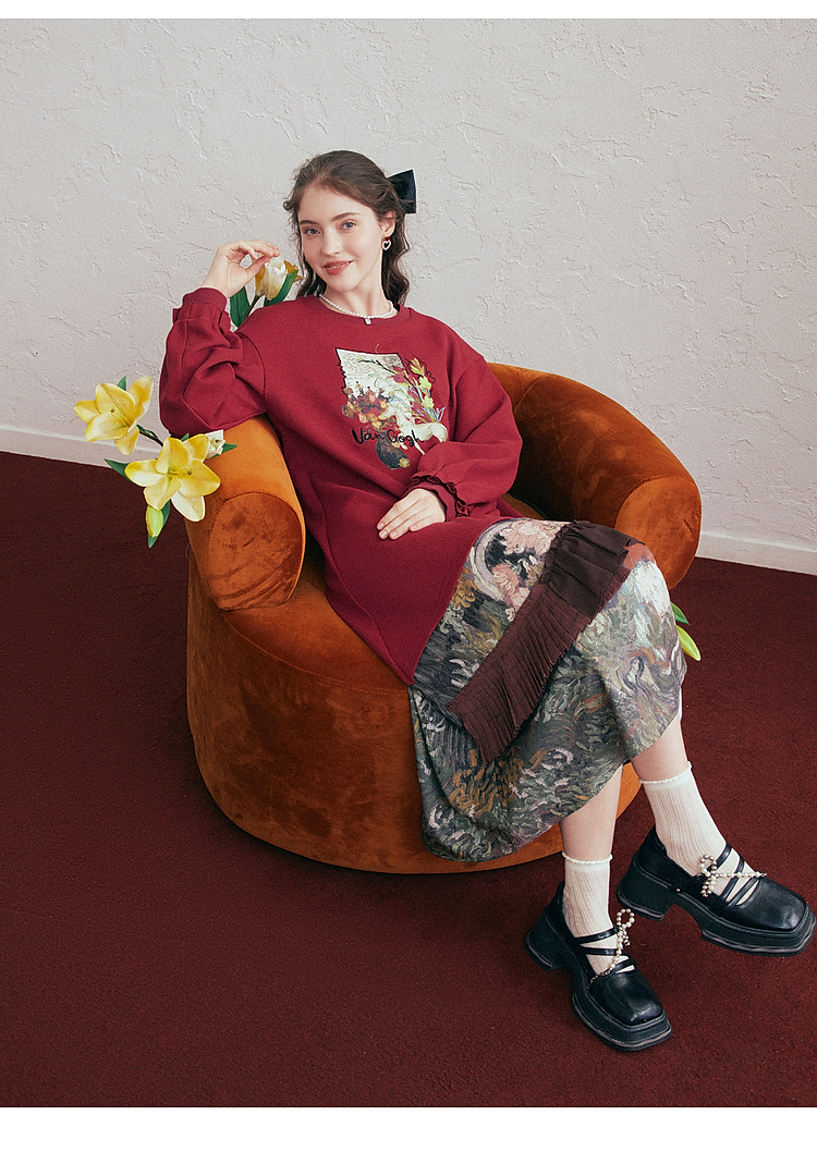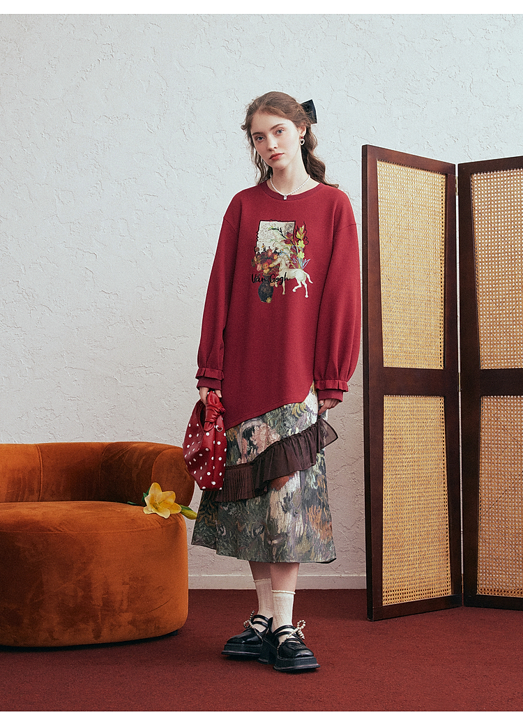 两三事梵高文艺 窗野空色 2026春季新款印花荷叶边裙摆拼接连衣裙