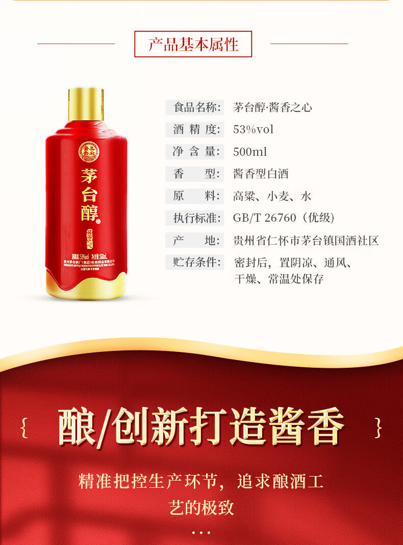 茅台醇酱香之心 53度 500ml 单瓶装(整箱为6瓶)