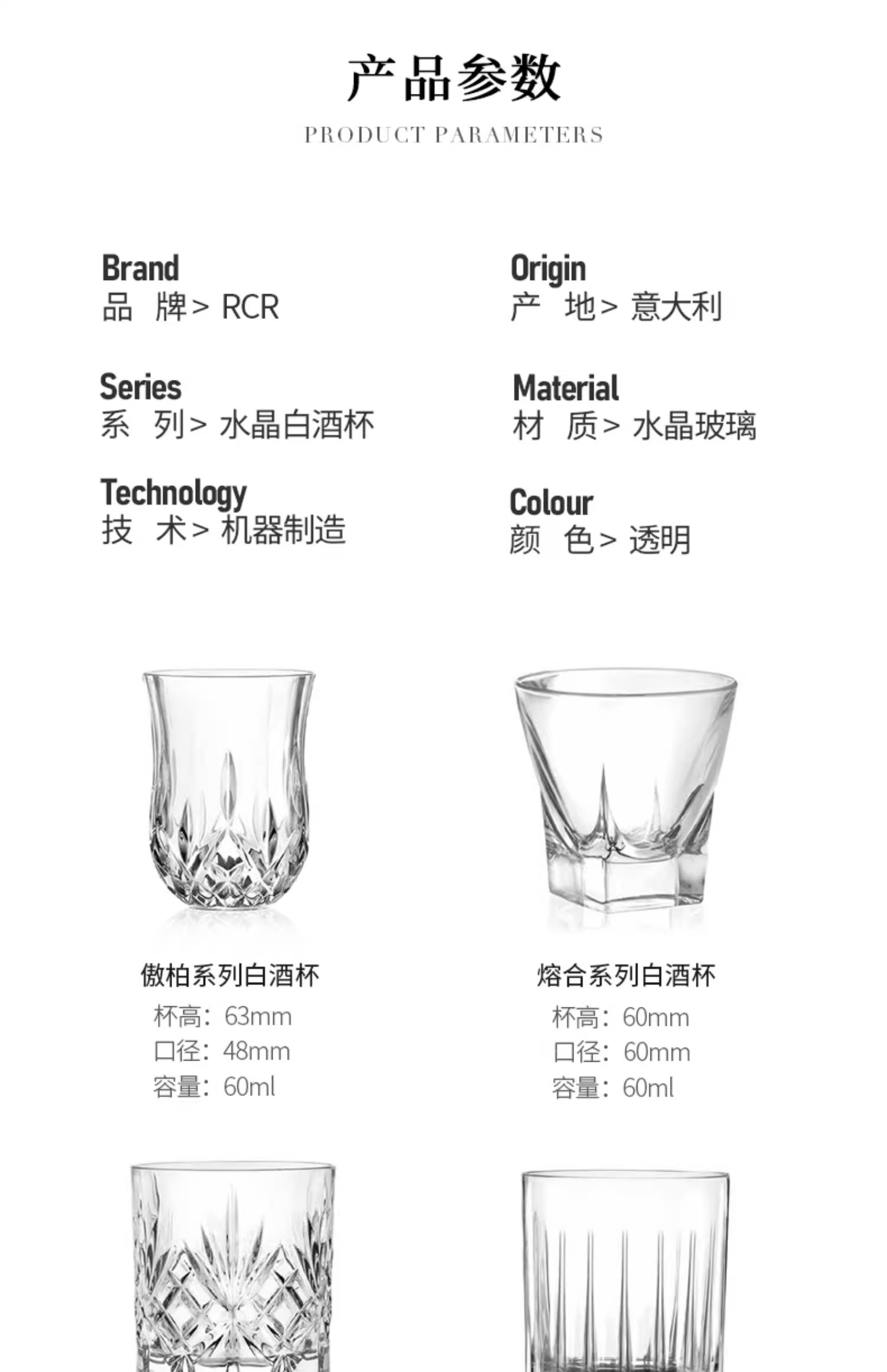 rcr进口二两白酒杯套装家用分酒器水晶玻璃杯轻奢高端烈酒杯小号傲柏晶质烈酒杯熔合晶质烈酒杯60ML*6