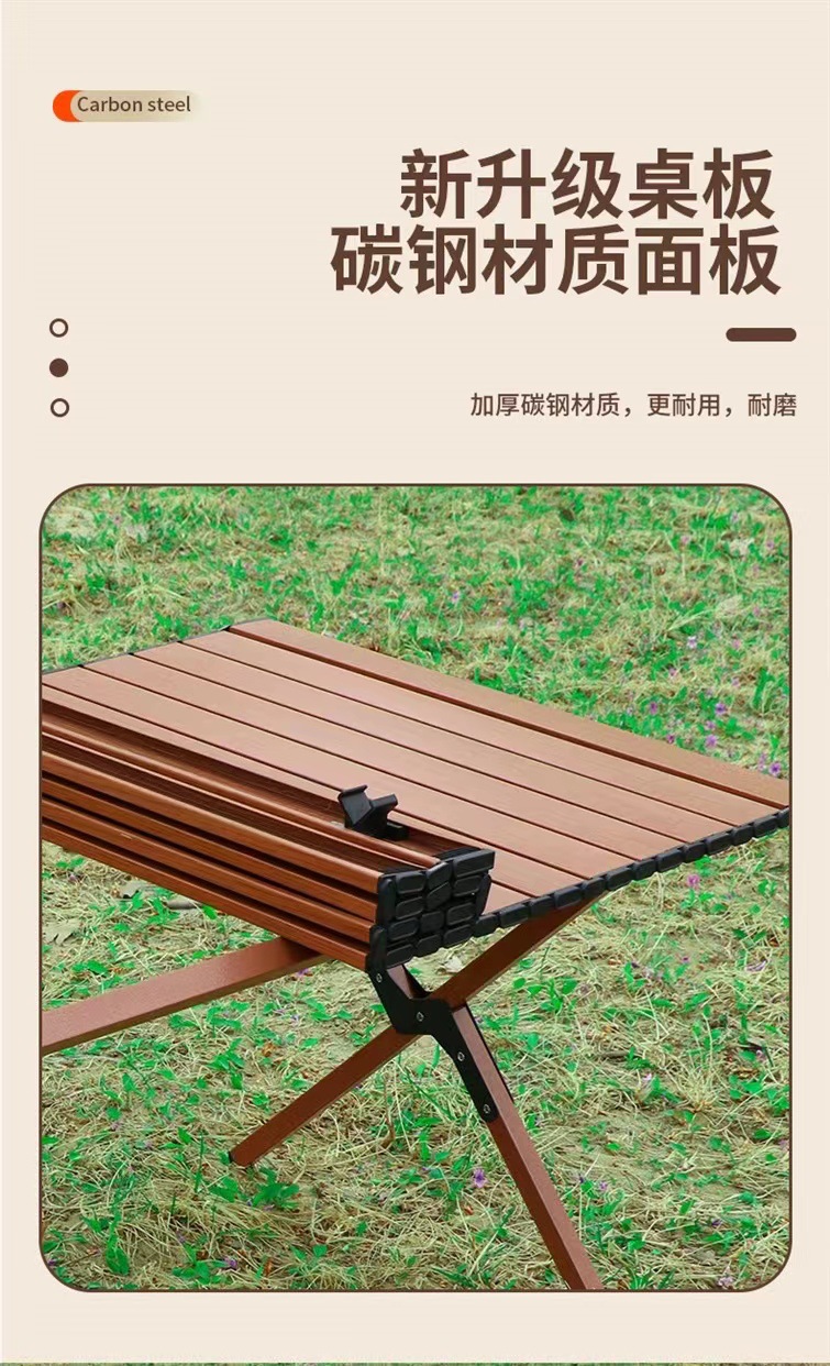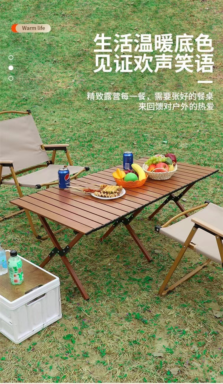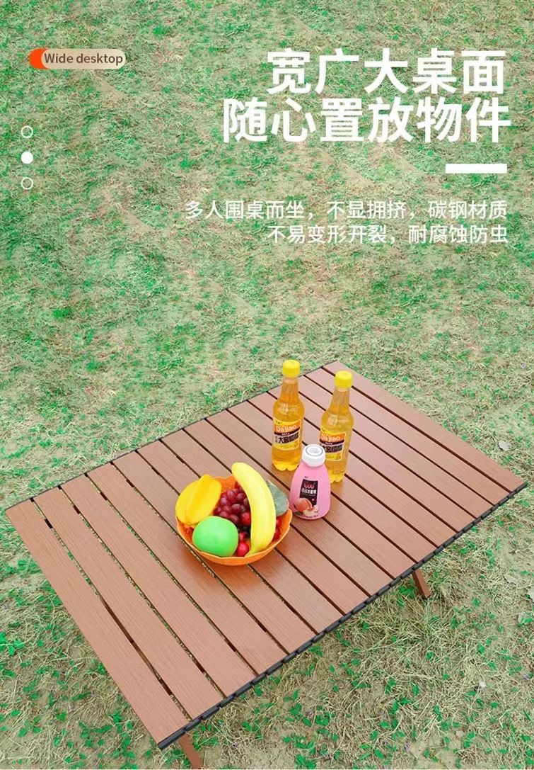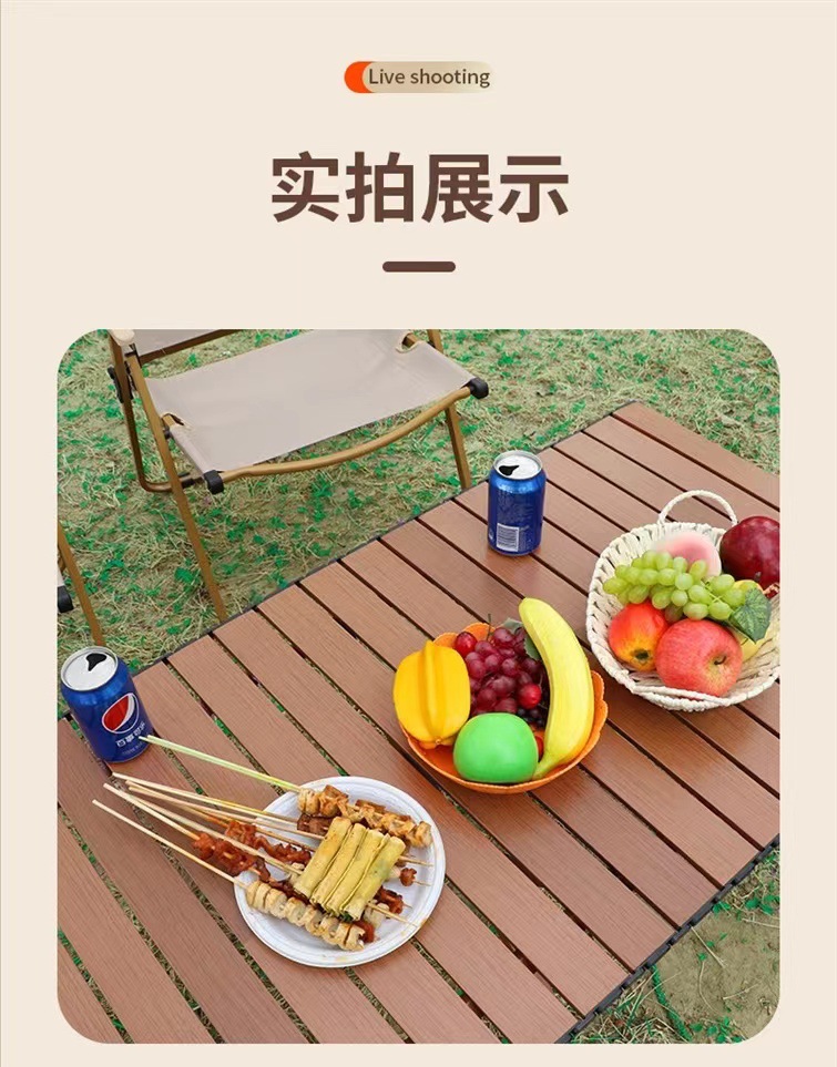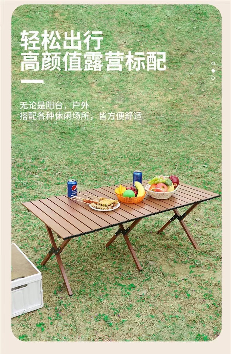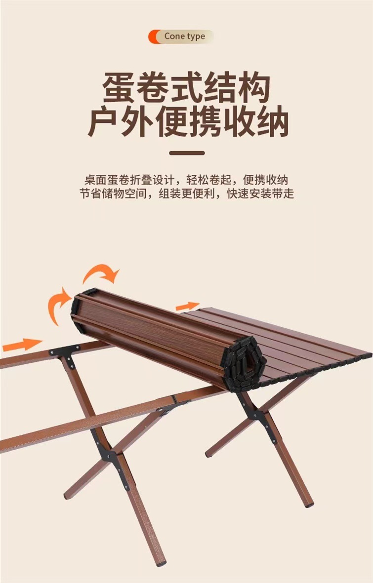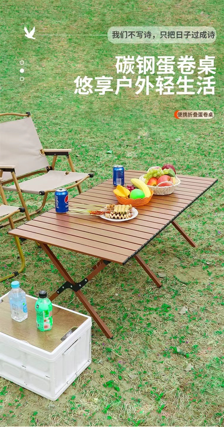 【轻松出行!畅享户外生活乐趣】新款户外蛋卷桌,稳固耐用,轻便木纹野餐桌,多场景适用。助你畅享露营烧烤生活!